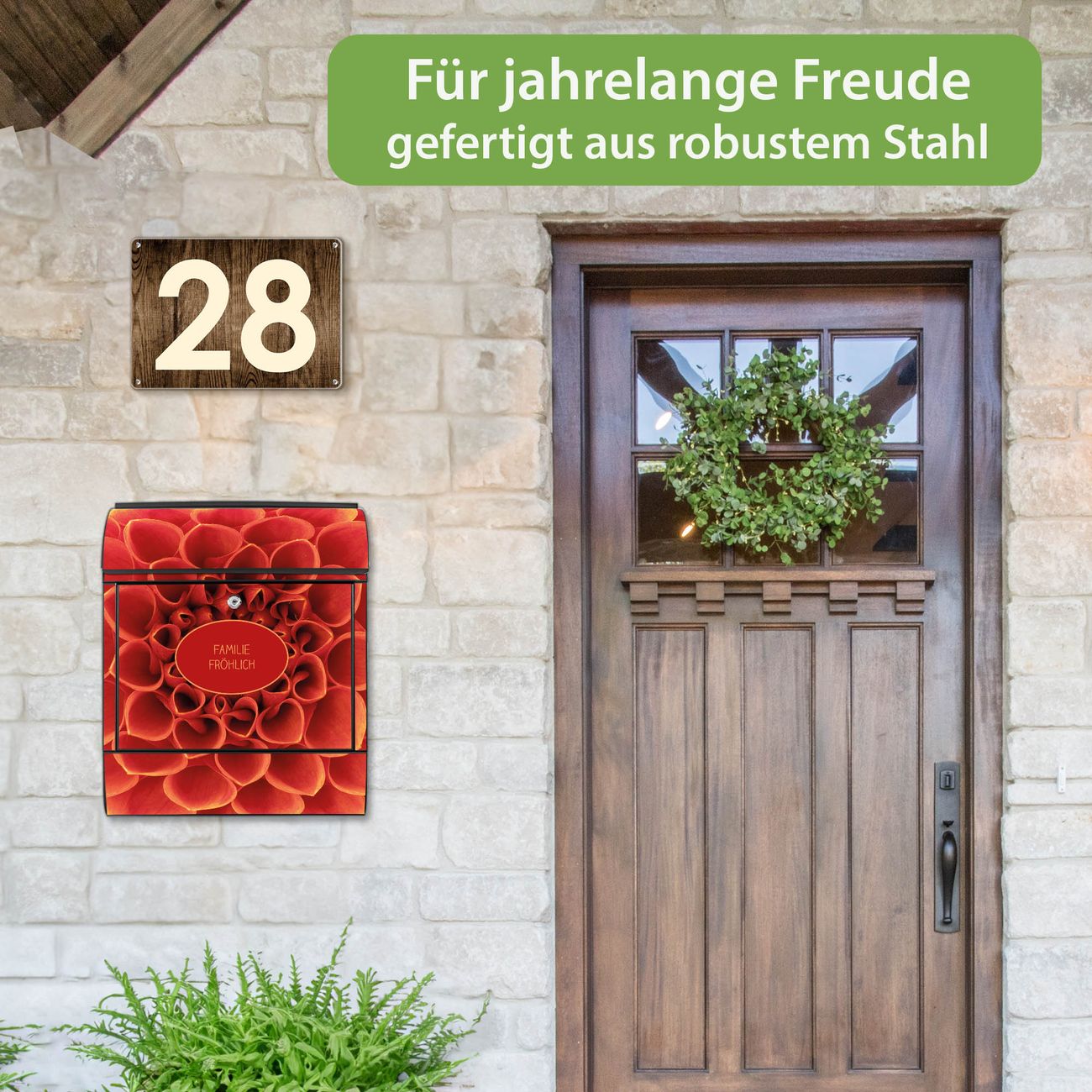 DESIGN: Der Postkasten mit Motiv Motiv Orange Chrysantheme hat ein sehr ansprechendes und ausgefallenes Design, damit entlocken Sie Ihren Nachbarn und dem Postboten ein Lächeln. Heben Sie Sich von der tristen grauen Masse ab, ohne auf Funktionalität zu verzichten. DETAILS: Der Postkasten besteht aus pulverbeschichtetem Stahl. Er ist 38x46x12,5cm groß. Das Motiv besteht aus einer wetter- und UV-resistenten Folie, die mit einem Schutzlaminat überzogen ist, sodass der Briefkasten zusätzlich vor Kratzern geschützt ist. Der Briefkasten wird mit Montagematerial, zusätzlich zwei Schlüssel sowie einer Bohrschablone geliefert. NUTZEN: Sie können diesen Briefkasten sowohl als Wandbriefkasten montieren oder einen passenden Ständer kaufen und als Standbriefkasten einbetonieren. Die Größe bietet genügend Platz für Sendungen aller Art, der Einwurf fasst auch größere A4 Sendungen. BANJADO: Ihr Briefkasten wird in Sachsen in einer kleinen Manufaktur von Hand veredelt. Die Motivfolie ist lösungsmittelfrei und schutzlaminiert für einen langen Halt. Wir legen großen Wert auf die Verbindung von Funktionalität und Design. Sie erhalten Handarbeit aus Sachsen.
