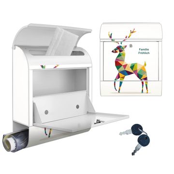 DESIGN: Der Postkasten mit Motiv Motiv Origami Hirsch hat ein sehr ansprechendes und ausgefallenes Design, damit entlocken Sie Ihren Nachbarn und dem Postboten ein Lächeln. Heben Sie Sich von der tristen grauen Masse ab, ohne auf Funktionalität zu verzichten. DETAILS: Der Postkasten besteht aus pulverbeschichtetem Stahl. Er ist 38x46x12,5cm groß. Das Motiv besteht aus einer wetter- und UV-resistenten Folie, die mit einem Schutzlaminat überzogen ist, sodass der Briefkasten zusätzlich vor Kratzern geschützt ist. Der Briefkasten wird mit Montagematerial, zusätzlich zwei Schlüssel sowie einer Bohrschablone geliefert. NUTZEN: Sie können diesen Briefkasten sowohl als Wandbriefkasten montieren oder einen passenden Ständer kaufen und als Standbriefkasten einbetonieren. Die Größe bietet genügend Platz für Sendungen aller Art, der Einwurf fasst auch größere A4 Sendungen. BANJADO: Ihr Briefkasten wird in Sachsen in einer kleinen Manufaktur von Hand veredelt. Die Motivfolie ist lösungsmittelfrei und schutzlaminiert für einen langen Halt. Wir legen großen Wert auf die Verbindung von Funktionalität und Design. Sie erhalten Handarbeit aus Sachsen.