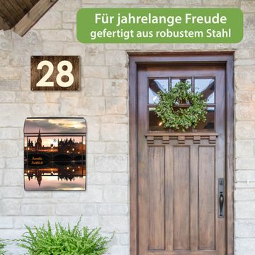 DESIGN: Der Postkasten mit Motiv Motiv Palace of Westminster hat ein sehr ansprechendes und ausgefallenes Design, damit entlocken Sie Ihren Nachbarn und dem Postboten ein Lächeln. Heben Sie Sich von der tristen grauen Masse ab, ohne auf Funktionalität zu verzichten. DETAILS: Der Postkasten besteht aus pulverbeschichtetem Stahl. Er ist 38x46x12,5cm groß. Das Motiv besteht aus einer wetter- und UV-resistenten Folie, die mit einem Schutzlaminat überzogen ist, sodass der Briefkasten zusätzlich vor Kratzern geschützt ist. Der Briefkasten wird mit Montagematerial, zusätzlich zwei Schlüssel sowie einer Bohrschablone geliefert. NUTZEN: Sie können diesen Briefkasten sowohl als Wandbriefkasten montieren oder einen passenden Ständer kaufen und als Standbriefkasten einbetonieren. Die Größe bietet genügend Platz für Sendungen aller Art, der Einwurf fasst auch größere A4 Sendungen. BANJADO: Ihr Briefkasten wird in Sachsen in einer kleinen Manufaktur von Hand veredelt. Die Motivfolie ist lösungsmittelfrei und schutzlaminiert für einen langen Halt. Wir legen großen Wert auf die Verbindung von Funktionalität und Design. Sie erhalten Handarbeit aus Sachsen.