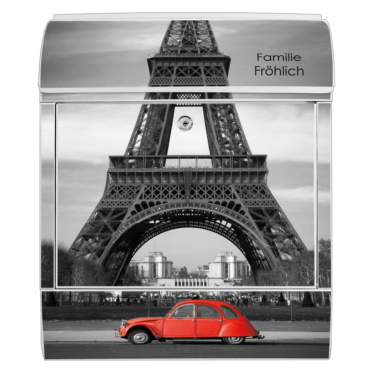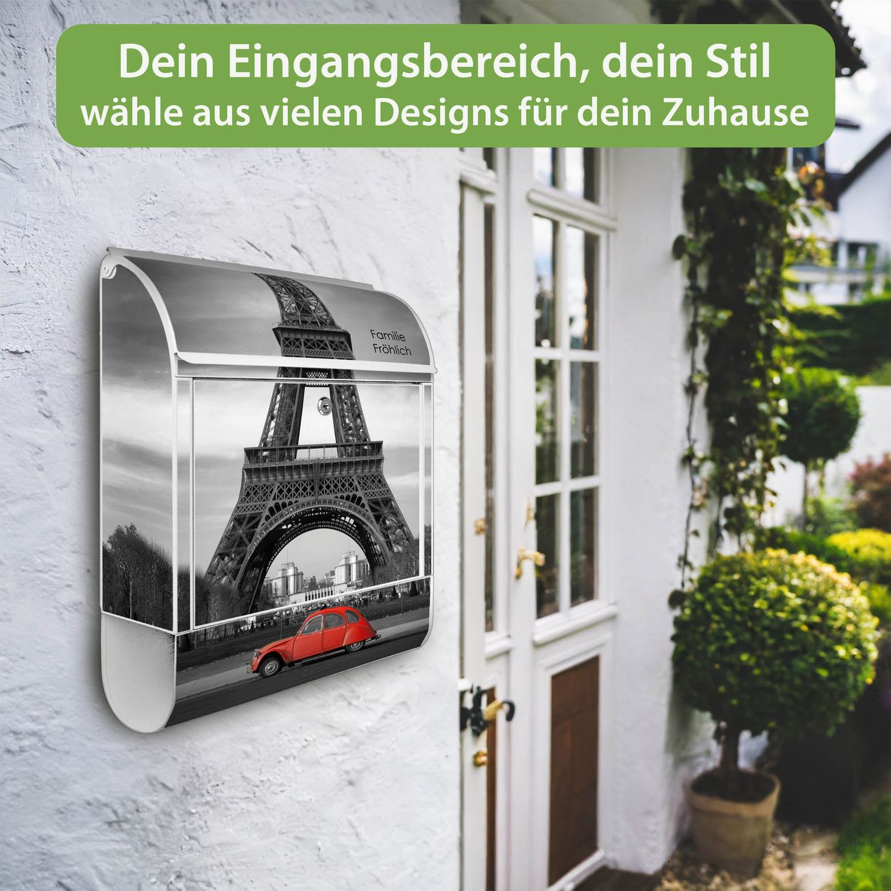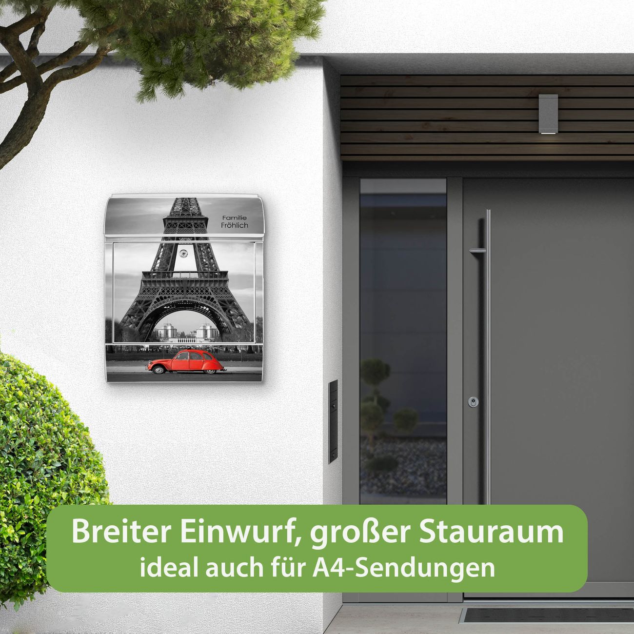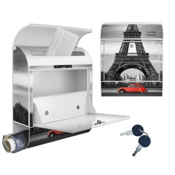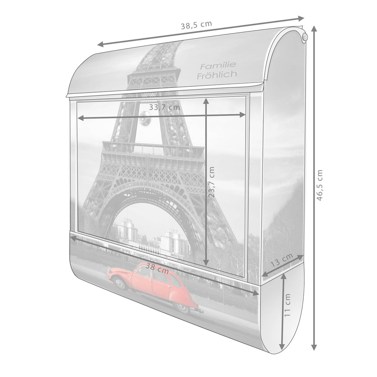 DESIGN: Der Postkasten mit Motiv Motiv Paris hat ein sehr ansprechendes und ausgefallenes Design, damit entlocken Sie Ihren Nachbarn und dem Postboten ein Lächeln. Heben Sie Sich von der tristen grauen Masse ab, ohne auf Funktionalität zu verzichten. DETAILS: Der Postkasten besteht aus pulverbeschichtetem Stahl. Er ist 38x46x12,5cm groß. Das Motiv besteht aus einer wetter- und UV-resistenten Folie, die mit einem Schutzlaminat überzogen ist, sodass der Briefkasten zusätzlich vor Kratzern geschützt ist. Der Briefkasten wird mit Montagematerial, zusätzlich zwei Schlüssel sowie einer Bohrschablone geliefert. NUTZEN: Sie können diesen Briefkasten sowohl als Wandbriefkasten montieren oder einen passenden Ständer kaufen und als Standbriefkasten einbetonieren. Die Größe bietet genügend Platz für Sendungen aller Art, der Einwurf fasst auch größere A4 Sendungen. BANJADO: Ihr Briefkasten wird in Sachsen in einer kleinen Manufaktur von Hand veredelt. Die Motivfolie ist lösungsmittelfrei und schutzlaminiert für einen langen Halt. Wir legen großen Wert auf die Verbindung von Funktionalität und Design. Sie erhalten Handarbeit aus Sachsen.