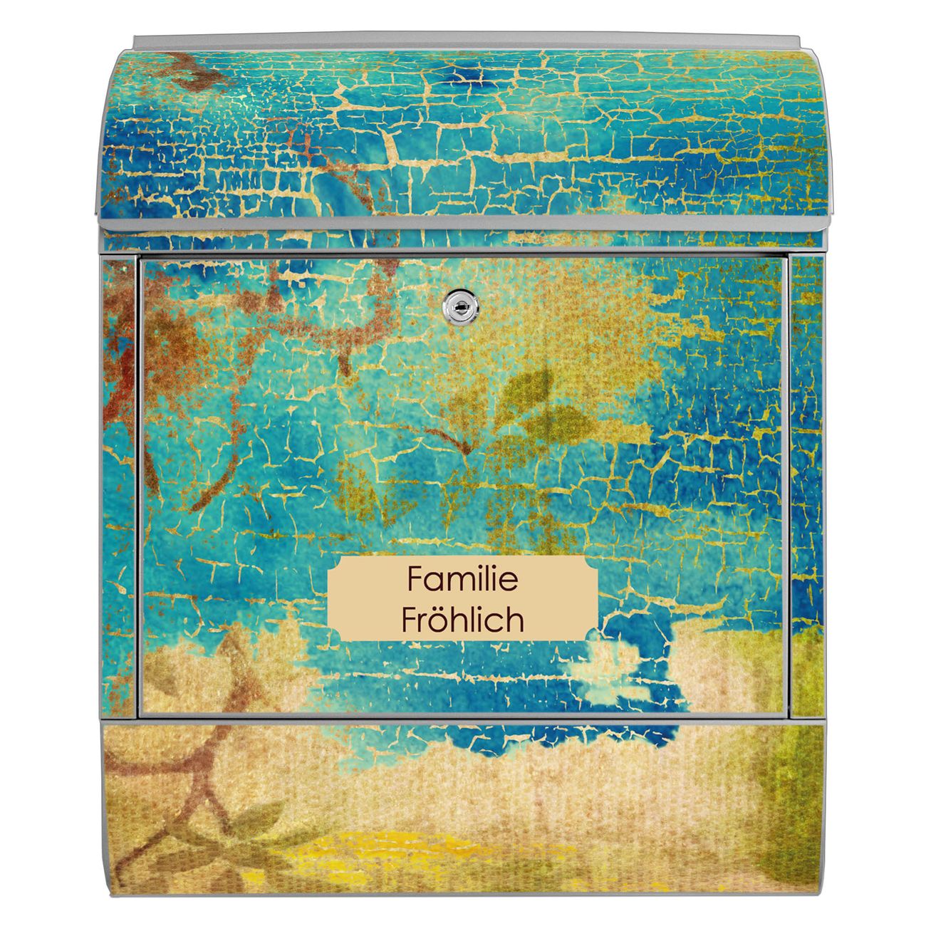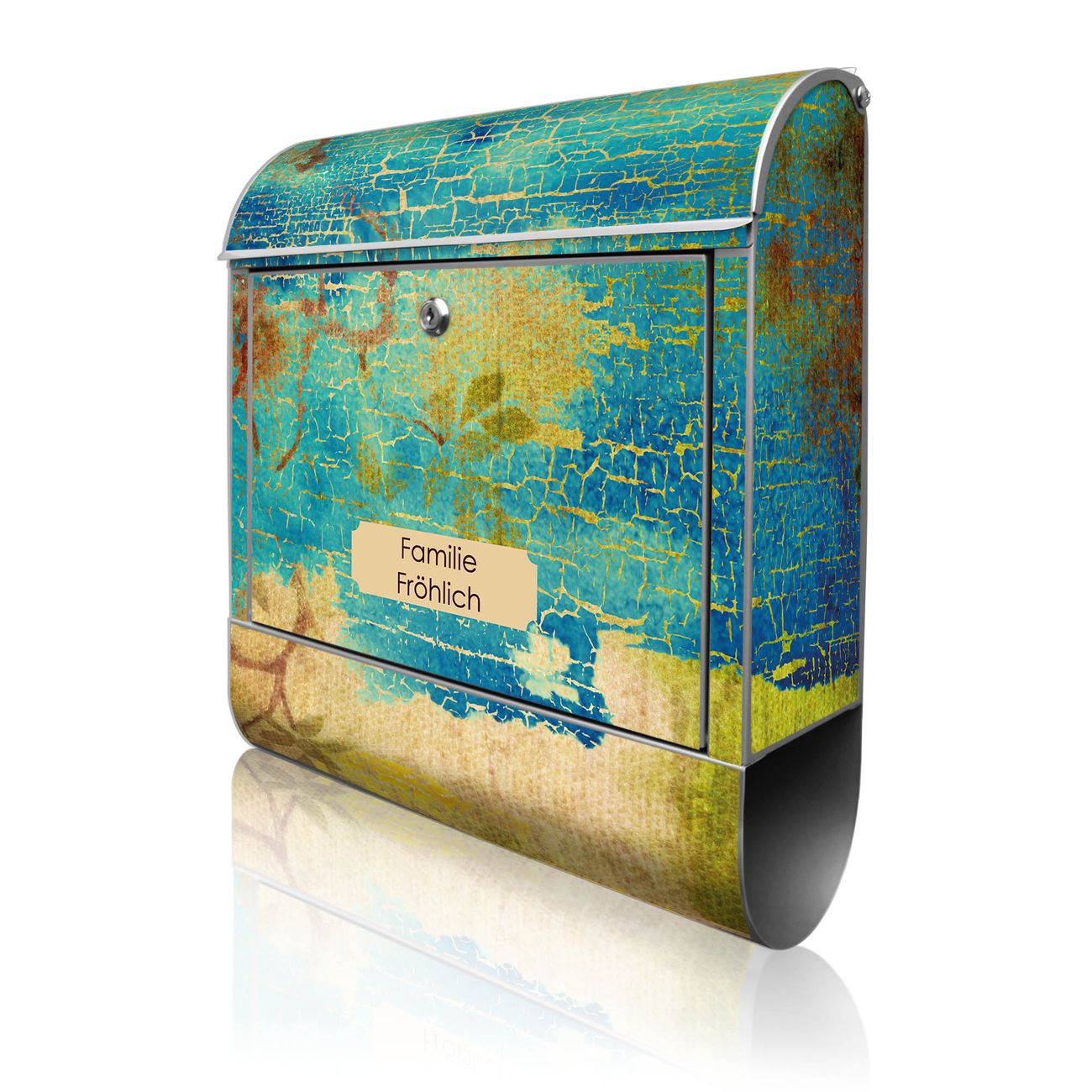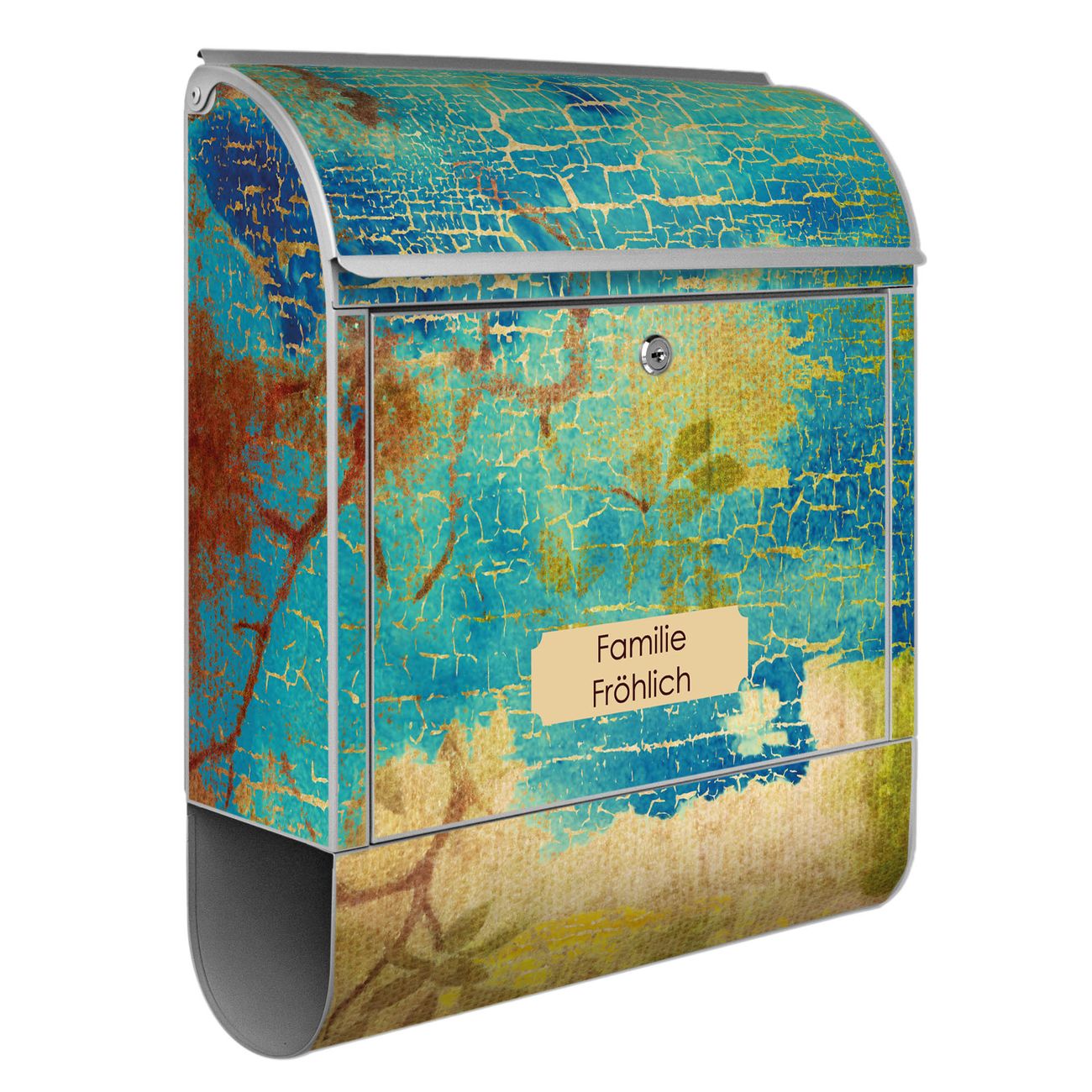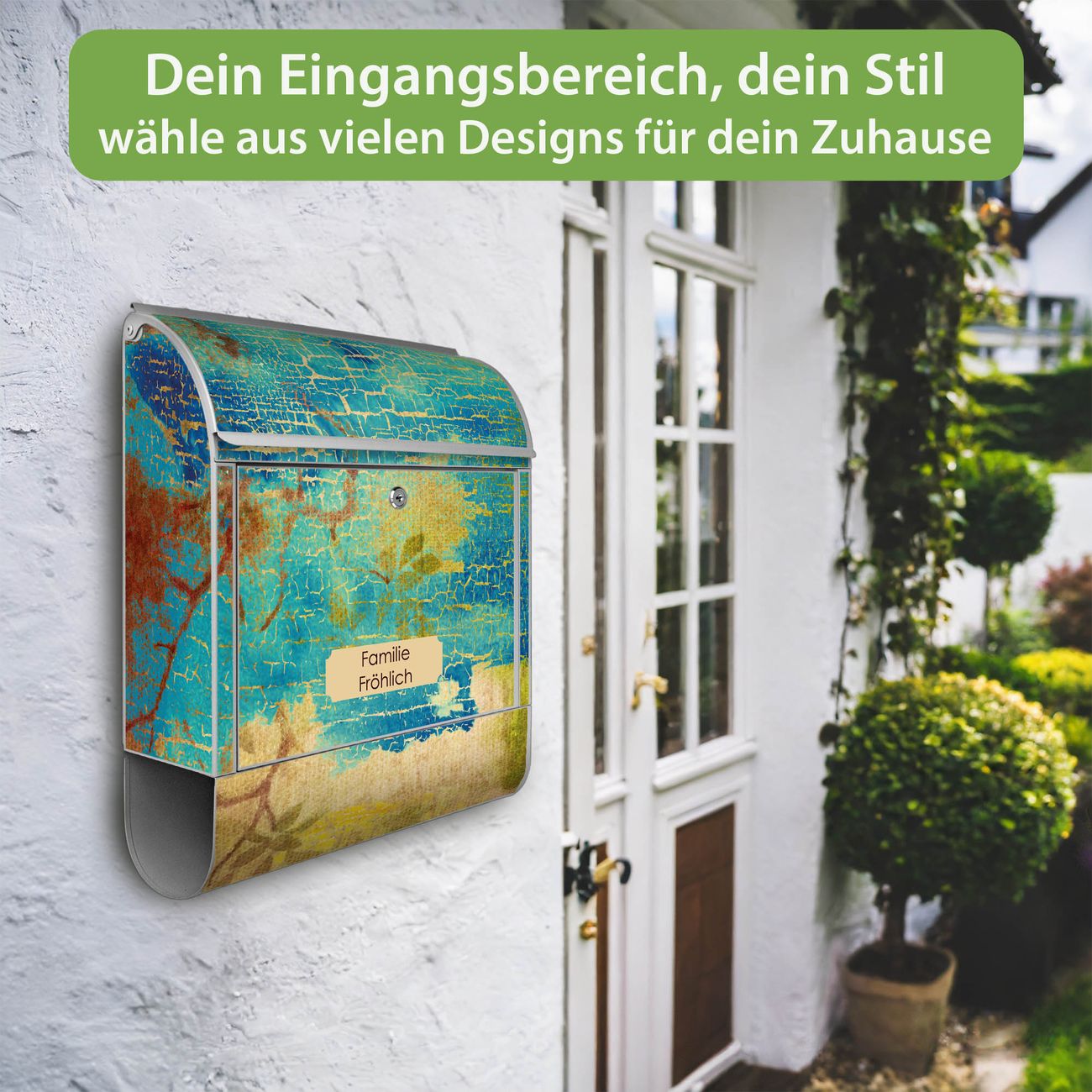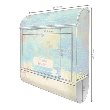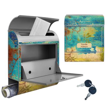 DESIGN: Der Postkasten mit Motiv Motiv Patina hat ein sehr ansprechendes und ausgefallenes Design, damit entlocken Sie Ihren Nachbarn und dem Postboten ein Lächeln. Heben Sie Sich von der tristen grauen Masse ab, ohne auf Funktionalität zu verzichten. DETAILS: Der Postkasten besteht aus pulverbeschichtetem Stahl. Er ist 38x46x12,5cm groß. Das Motiv besteht aus einer wetter- und UV-resistenten Folie, die mit einem Schutzlaminat überzogen ist, sodass der Briefkasten zusätzlich vor Kratzern geschützt ist. Der Briefkasten wird mit Montagematerial, zusätzlich zwei Schlüssel sowie einer Bohrschablone geliefert. NUTZEN: Sie können diesen Briefkasten sowohl als Wandbriefkasten montieren oder einen passenden Ständer kaufen und als Standbriefkasten einbetonieren. Die Größe bietet genügend Platz für Sendungen aller Art, der Einwurf fasst auch größere A4 Sendungen. BANJADO: Ihr Briefkasten wird in Sachsen in einer kleinen Manufaktur von Hand veredelt. Die Motivfolie ist lösungsmittelfrei und schutzlaminiert für einen langen Halt. Wir legen großen Wert auf die Verbindung von Funktionalität und Design. Sie erhalten Handarbeit aus Sachsen.