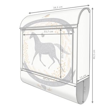 DESIGN: Der Postkasten mit Motiv Motiv Pferd und Vogel hat ein sehr ansprechendes und ausgefallenes Design, damit entlocken Sie Ihren Nachbarn und dem Postboten ein Lächeln. Heben Sie Sich von der tristen grauen Masse ab, ohne auf Funktionalität zu verzichten. DETAILS: Der Postkasten besteht aus pulverbeschichtetem Stahl. Er ist 38x46x12,5cm groß. Das Motiv besteht aus einer wetter- und UV-resistenten Folie, die mit einem Schutzlaminat überzogen ist, sodass der Briefkasten zusätzlich vor Kratzern geschützt ist. Der Briefkasten wird mit Montagematerial, zusätzlich zwei Schlüssel sowie einer Bohrschablone geliefert. NUTZEN: Sie können diesen Briefkasten sowohl als Wandbriefkasten montieren oder einen passenden Ständer kaufen und als Standbriefkasten einbetonieren. Die Größe bietet genügend Platz für Sendungen aller Art, der Einwurf fasst auch größere A4 Sendungen. BANJADO: Ihr Briefkasten wird in Sachsen in einer kleinen Manufaktur von Hand veredelt. Die Motivfolie ist lösungsmittelfrei und schutzlaminiert für einen langen Halt. Wir legen großen Wert auf die Verbindung von Funktionalität und Design. Sie erhalten Handarbeit aus Sachsen.