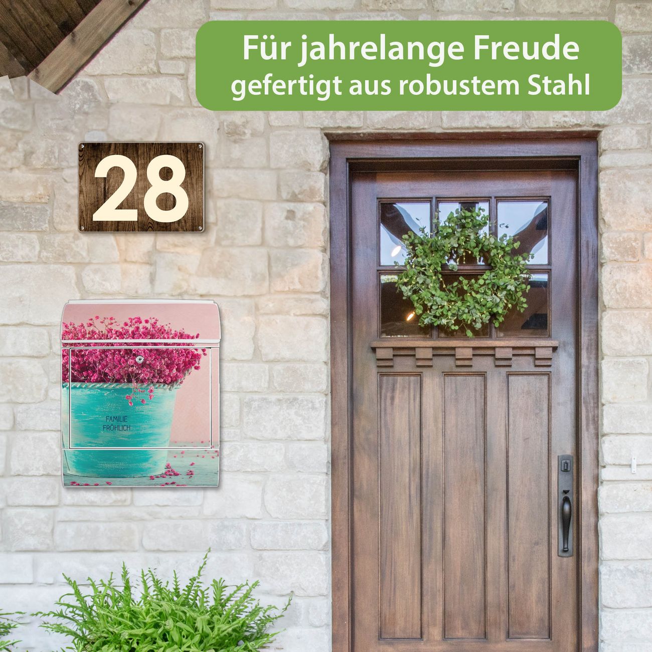 DESIGN: Der Postkasten mit Motiv Motiv Pinke Trockenblumen hat ein sehr ansprechendes und ausgefallenes Design, damit entlocken Sie Ihren Nachbarn und dem Postboten ein Lächeln. Heben Sie Sich von der tristen grauen Masse ab, ohne auf Funktionalität zu verzichten. DETAILS: Der Postkasten besteht aus pulverbeschichtetem Stahl. Er ist 38x46x12,5cm groß. Das Motiv besteht aus einer wetter- und UV-resistenten Folie, die mit einem Schutzlaminat überzogen ist, sodass der Briefkasten zusätzlich vor Kratzern geschützt ist. Der Briefkasten wird mit Montagematerial, zusätzlich zwei Schlüssel sowie einer Bohrschablone geliefert. NUTZEN: Sie können diesen Briefkasten sowohl als Wandbriefkasten montieren oder einen passenden Ständer kaufen und als Standbriefkasten einbetonieren. Die Größe bietet genügend Platz für Sendungen aller Art, der Einwurf fasst auch größere A4 Sendungen. BANJADO: Ihr Briefkasten wird in Sachsen in einer kleinen Manufaktur von Hand veredelt. Die Motivfolie ist lösungsmittelfrei und schutzlaminiert für einen langen Halt. Wir legen großen Wert auf die Verbindung von Funktionalität und Design. Sie erhalten Handarbeit aus Sachsen.