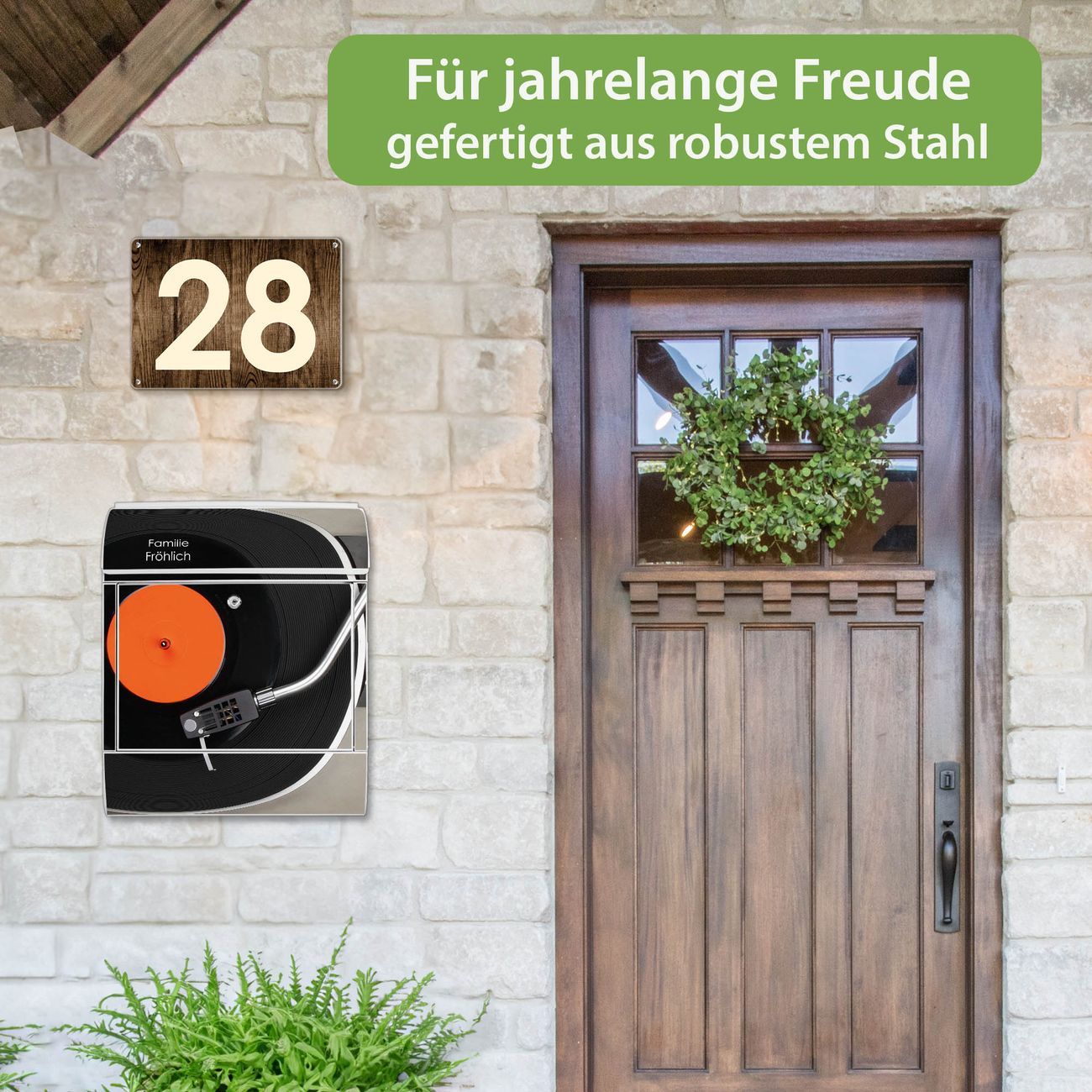 DESIGN: Der Postkasten mit Motiv Motiv Plattenspieler hat ein sehr ansprechendes und ausgefallenes Design, damit entlocken Sie Ihren Nachbarn und dem Postboten ein Lächeln. Heben Sie Sich von der tristen grauen Masse ab, ohne auf Funktionalität zu verzichten. DETAILS: Der Postkasten besteht aus pulverbeschichtetem Stahl. Er ist 38x46x12,5cm groß. Das Motiv besteht aus einer wetter- und UV-resistenten Folie, die mit einem Schutzlaminat überzogen ist, sodass der Briefkasten zusätzlich vor Kratzern geschützt ist. Der Briefkasten wird mit Montagematerial, zusätzlich zwei Schlüssel sowie einer Bohrschablone geliefert. NUTZEN: Sie können diesen Briefkasten sowohl als Wandbriefkasten montieren oder einen passenden Ständer kaufen und als Standbriefkasten einbetonieren. Die Größe bietet genügend Platz für Sendungen aller Art, der Einwurf fasst auch größere A4 Sendungen. BANJADO: Ihr Briefkasten wird in Sachsen in einer kleinen Manufaktur von Hand veredelt. Die Motivfolie ist lösungsmittelfrei und schutzlaminiert für einen langen Halt. Wir legen großen Wert auf die Verbindung von Funktionalität und Design. Sie erhalten Handarbeit aus Sachsen.