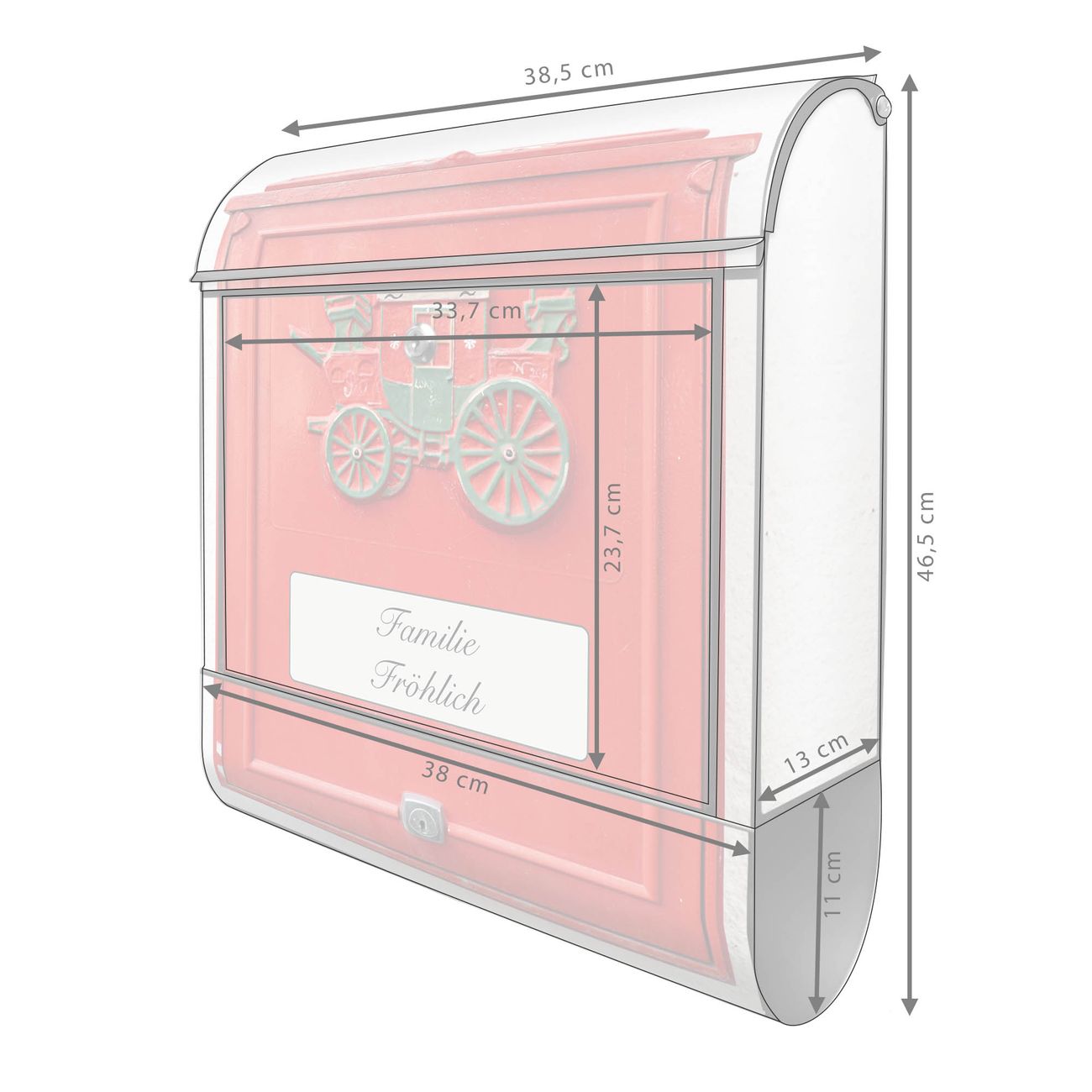DESIGN: Der Postkasten mit Motiv Motiv Postkasten Nostalgie hat ein sehr ansprechendes und ausgefallenes Design, damit entlocken Sie Ihren Nachbarn und dem Postboten ein Lächeln. Heben Sie Sich von der tristen grauen Masse ab, ohne auf Funktionalität zu verzichten. DETAILS: Der Postkasten besteht aus pulverbeschichtetem Stahl. Er ist 38x46x12,5cm groß. Das Motiv besteht aus einer wetter- und UV-resistenten Folie, die mit einem Schutzlaminat überzogen ist, sodass der Briefkasten zusätzlich vor Kratzern geschützt ist. Der Briefkasten wird mit Montagematerial, zusätzlich zwei Schlüssel sowie einer Bohrschablone geliefert. NUTZEN: Sie können diesen Briefkasten sowohl als Wandbriefkasten montieren oder einen passenden Ständer kaufen und als Standbriefkasten einbetonieren. Die Größe bietet genügend Platz für Sendungen aller Art, der Einwurf fasst auch größere A4 Sendungen. BANJADO: Ihr Briefkasten wird in Sachsen in einer kleinen Manufaktur von Hand veredelt. Die Motivfolie ist lösungsmittelfrei und schutzlaminiert für einen langen Halt. Wir legen großen Wert auf die Verbindung von Funktionalität und Design. Sie erhalten Handarbeit aus Sachsen.