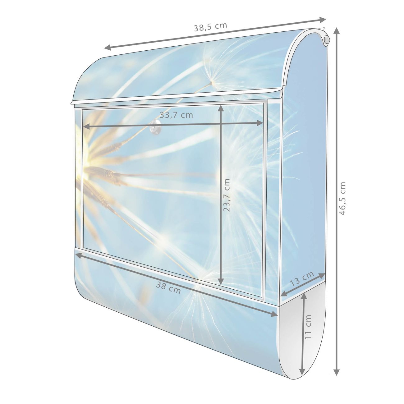 DESIGN: Der Postkasten mit Motiv Motiv Pusteblume Detail hat ein sehr ansprechendes und ausgefallenes Design, damit entlocken Sie Ihren Nachbarn und dem Postboten ein Lächeln. Heben Sie Sich von der tristen grauen Masse ab, ohne auf Funktionalität zu verzichten. DETAILS: Der Postkasten besteht aus pulverbeschichtetem Stahl. Er ist 38x46x12,5cm groß. Das Motiv besteht aus einer wetter- und UV-resistenten Folie, die mit einem Schutzlaminat überzogen ist, sodass der Briefkasten zusätzlich vor Kratzern geschützt ist. Der Briefkasten wird mit Montagematerial, zusätzlich zwei Schlüssel sowie einer Bohrschablone geliefert. NUTZEN: Sie können diesen Briefkasten sowohl als Wandbriefkasten montieren oder einen passenden Ständer kaufen und als Standbriefkasten einbetonieren. Die Größe bietet genügend Platz für Sendungen aller Art, der Einwurf fasst auch größere A4 Sendungen. BANJADO: Ihr Briefkasten wird in Sachsen in einer kleinen Manufaktur von Hand veredelt. Die Motivfolie ist lösungsmittelfrei und schutzlaminiert für einen langen Halt. Wir legen großen Wert auf die Verbindung von Funktionalität und Design. Sie erhalten Handarbeit aus Sachsen.