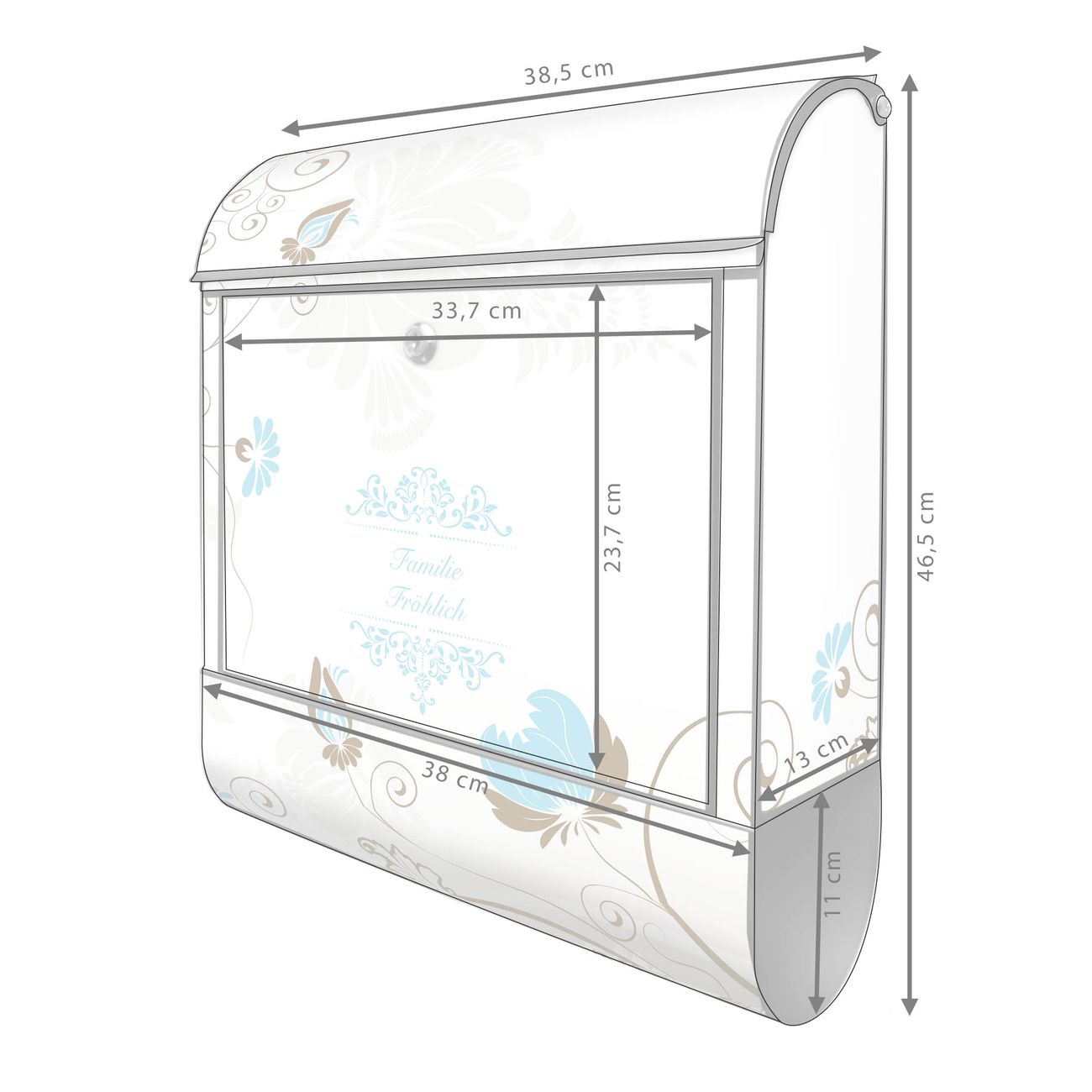 DESIGN: Der Postkasten mit Motiv Motiv Rankenrahmen hat ein sehr ansprechendes und ausgefallenes Design, damit entlocken Sie Ihren Nachbarn und dem Postboten ein Lächeln. Heben Sie Sich von der tristen grauen Masse ab, ohne auf Funktionalität zu verzichten. DETAILS: Der Postkasten besteht aus pulverbeschichtetem Stahl. Er ist 38x46x12,5cm groß. Das Motiv besteht aus einer wetter- und UV-resistenten Folie, die mit einem Schutzlaminat überzogen ist, sodass der Briefkasten zusätzlich vor Kratzern geschützt ist. Der Briefkasten wird mit Montagematerial, zusätzlich zwei Schlüssel sowie einer Bohrschablone geliefert. NUTZEN: Sie können diesen Briefkasten sowohl als Wandbriefkasten montieren oder einen passenden Ständer kaufen und als Standbriefkasten einbetonieren. Die Größe bietet genügend Platz für Sendungen aller Art, der Einwurf fasst auch größere A4 Sendungen. BANJADO: Ihr Briefkasten wird in Sachsen in einer kleinen Manufaktur von Hand veredelt. Die Motivfolie ist lösungsmittelfrei und schutzlaminiert für einen langen Halt. Wir legen großen Wert auf die Verbindung von Funktionalität und Design. Sie erhalten Handarbeit aus Sachsen.