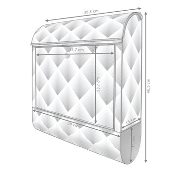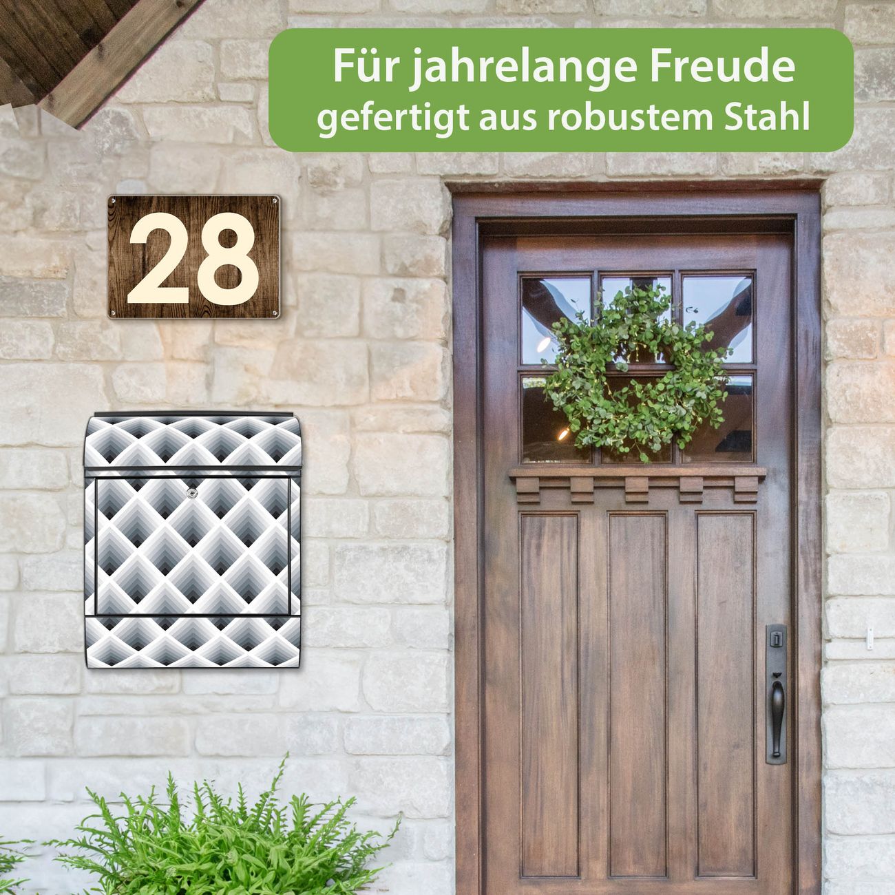 DESIGN: Der Postkasten mit Motiv Motiv Raster 3D Grau hat ein sehr ansprechendes und ausgefallenes Design, damit entlocken Sie Ihren Nachbarn und dem Postboten ein Lächeln. Heben Sie Sich von der tristen grauen Masse ab, ohne auf Funktionalität zu verzichten. DETAILS: Der Postkasten besteht aus pulverbeschichtetem Stahl. Er ist 38x46x12,5cm groß. Das Motiv besteht aus einer wetter- und UV-resistenten Folie, die mit einem Schutzlaminat überzogen ist, sodass der Briefkasten zusätzlich vor Kratzern geschützt ist. Der Briefkasten wird mit Montagematerial, zusätzlich zwei Schlüssel sowie einer Bohrschablone geliefert. NUTZEN: Sie können diesen Briefkasten sowohl als Wandbriefkasten montieren oder einen passenden Ständer kaufen und als Standbriefkasten einbetonieren. Die Größe bietet genügend Platz für Sendungen aller Art, der Einwurf fasst auch größere A4 Sendungen. BANJADO: Ihr Briefkasten wird in Sachsen in einer kleinen Manufaktur von Hand veredelt. Die Motivfolie ist lösungsmittelfrei und schutzlaminiert für einen langen Halt. Wir legen großen Wert auf die Verbindung von Funktionalität und Design. Sie erhalten Handarbeit aus Sachsen.
