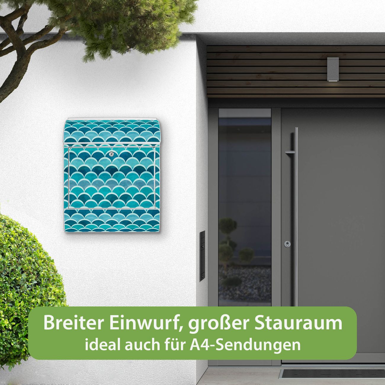 DESIGN: Der Postkasten mit Motiv Motiv Raue See hat ein sehr ansprechendes und ausgefallenes Design, damit entlocken Sie Ihren Nachbarn und dem Postboten ein Lächeln. Heben Sie Sich von der tristen grauen Masse ab, ohne auf Funktionalität zu verzichten. DETAILS: Der Postkasten besteht aus pulverbeschichtetem Stahl. Er ist 38x46x12,5cm groß. Das Motiv besteht aus einer wetter- und UV-resistenten Folie, die mit einem Schutzlaminat überzogen ist, sodass der Briefkasten zusätzlich vor Kratzern geschützt ist. Der Briefkasten wird mit Montagematerial, zusätzlich zwei Schlüssel sowie einer Bohrschablone geliefert. NUTZEN: Sie können diesen Briefkasten sowohl als Wandbriefkasten montieren oder einen passenden Ständer kaufen und als Standbriefkasten einbetonieren. Die Größe bietet genügend Platz für Sendungen aller Art, der Einwurf fasst auch größere A4 Sendungen. BANJADO: Ihr Briefkasten wird in Sachsen in einer kleinen Manufaktur von Hand veredelt. Die Motivfolie ist lösungsmittelfrei und schutzlaminiert für einen langen Halt. Wir legen großen Wert auf die Verbindung von Funktionalität und Design. Sie erhalten Handarbeit aus Sachsen.
