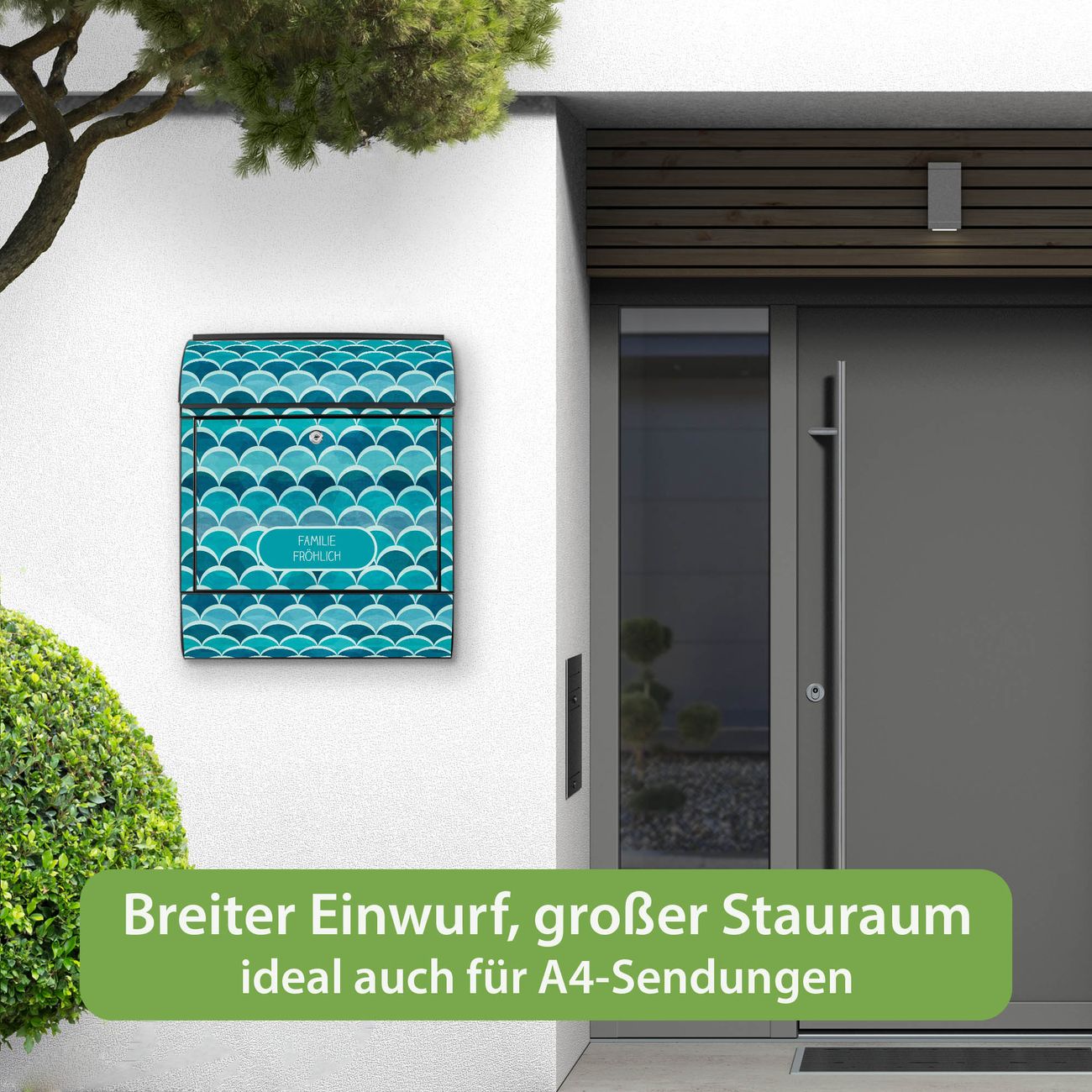 DESIGN: Der Postkasten mit Motiv Motiv Raue See hat ein sehr ansprechendes und ausgefallenes Design, damit entlocken Sie Ihren Nachbarn und dem Postboten ein Lächeln. Heben Sie Sich von der tristen grauen Masse ab, ohne auf Funktionalität zu verzichten. DETAILS: Der Postkasten besteht aus pulverbeschichtetem Stahl. Er ist 38x46x12,5cm groß. Das Motiv besteht aus einer wetter- und UV-resistenten Folie, die mit einem Schutzlaminat überzogen ist, sodass der Briefkasten zusätzlich vor Kratzern geschützt ist. Der Briefkasten wird mit Montagematerial, zusätzlich zwei Schlüssel sowie einer Bohrschablone geliefert. NUTZEN: Sie können diesen Briefkasten sowohl als Wandbriefkasten montieren oder einen passenden Ständer kaufen und als Standbriefkasten einbetonieren. Die Größe bietet genügend Platz für Sendungen aller Art, der Einwurf fasst auch größere A4 Sendungen. BANJADO: Ihr Briefkasten wird in Sachsen in einer kleinen Manufaktur von Hand veredelt. Die Motivfolie ist lösungsmittelfrei und schutzlaminiert für einen langen Halt. Wir legen großen Wert auf die Verbindung von Funktionalität und Design. Sie erhalten Handarbeit aus Sachsen.