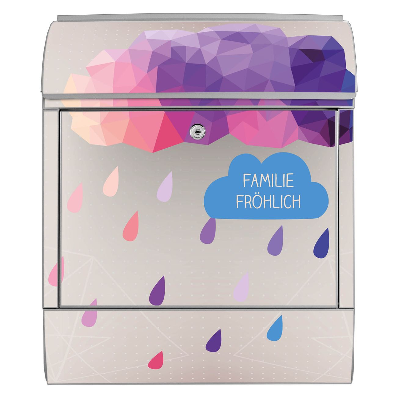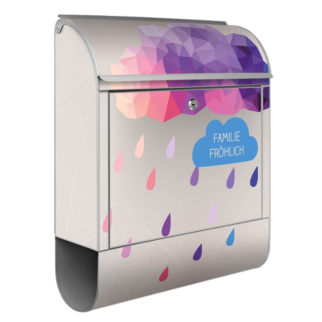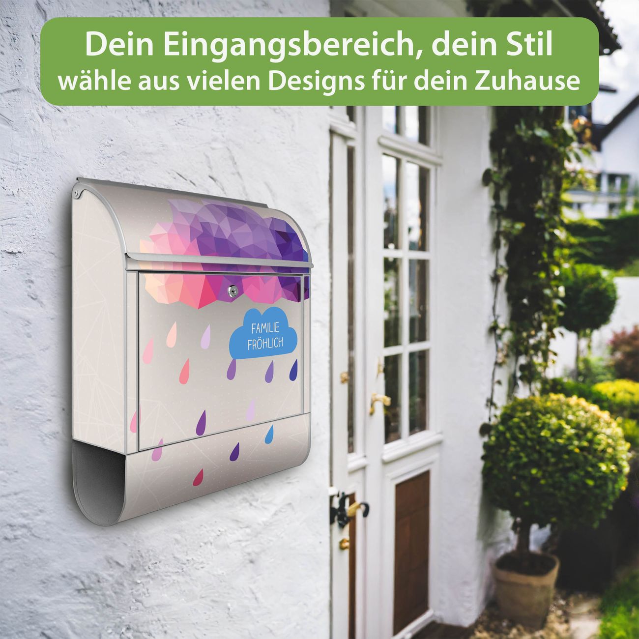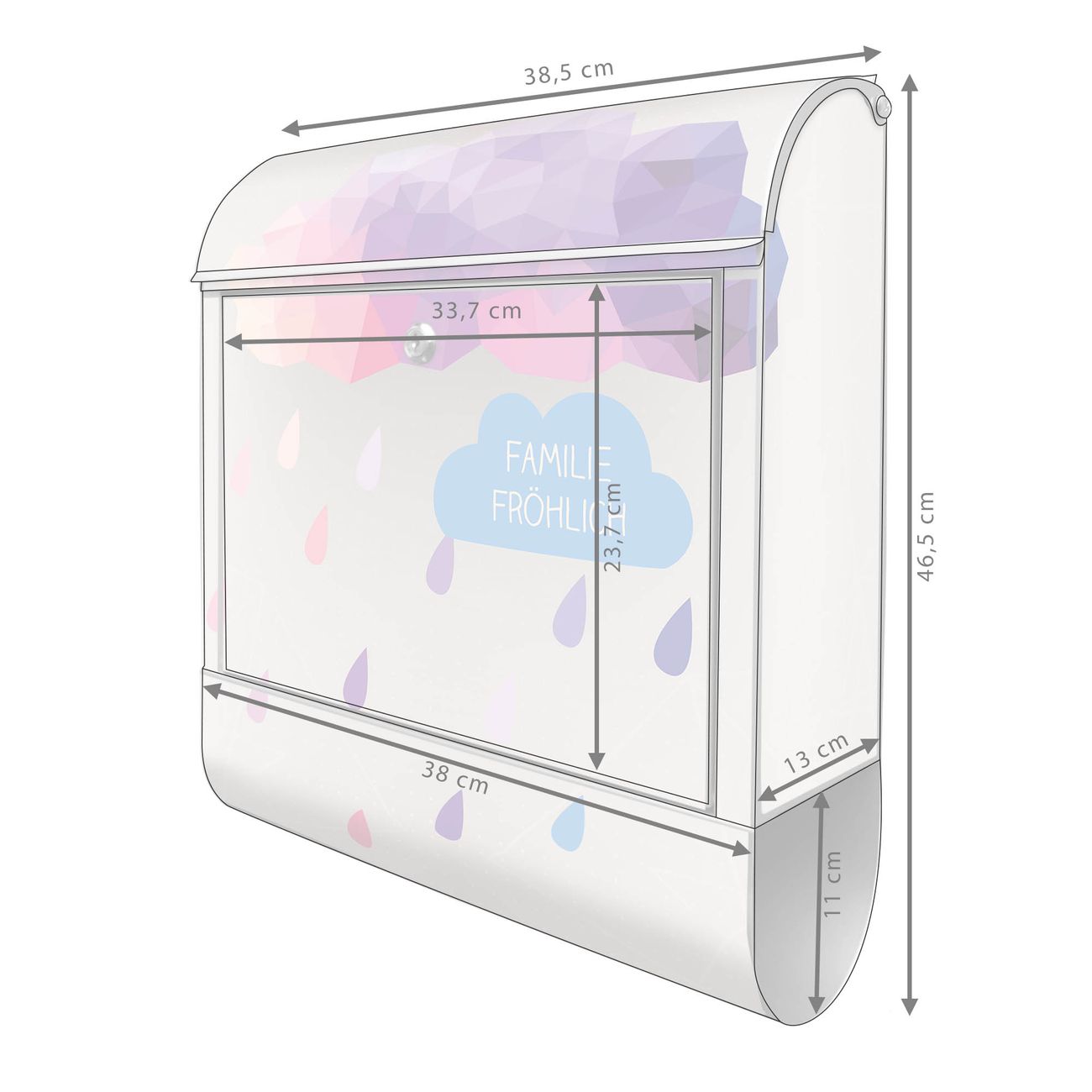 DESIGN: Der Postkasten mit Motiv Motiv Regenwolke hat ein sehr ansprechendes und ausgefallenes Design, damit entlocken Sie Ihren Nachbarn und dem Postboten ein Lächeln. Heben Sie Sich von der tristen grauen Masse ab, ohne auf Funktionalität zu verzichten. DETAILS: Der Postkasten besteht aus pulverbeschichtetem Stahl. Er ist 38x46x12,5cm groß. Das Motiv besteht aus einer wetter- und UV-resistenten Folie, die mit einem Schutzlaminat überzogen ist, sodass der Briefkasten zusätzlich vor Kratzern geschützt ist. Der Briefkasten wird mit Montagematerial, zusätzlich zwei Schlüssel sowie einer Bohrschablone geliefert. NUTZEN: Sie können diesen Briefkasten sowohl als Wandbriefkasten montieren oder einen passenden Ständer kaufen und als Standbriefkasten einbetonieren. Die Größe bietet genügend Platz für Sendungen aller Art, der Einwurf fasst auch größere A4 Sendungen. BANJADO: Ihr Briefkasten wird in Sachsen in einer kleinen Manufaktur von Hand veredelt. Die Motivfolie ist lösungsmittelfrei und schutzlaminiert für einen langen Halt. Wir legen großen Wert auf die Verbindung von Funktionalität und Design. Sie erhalten Handarbeit aus Sachsen.