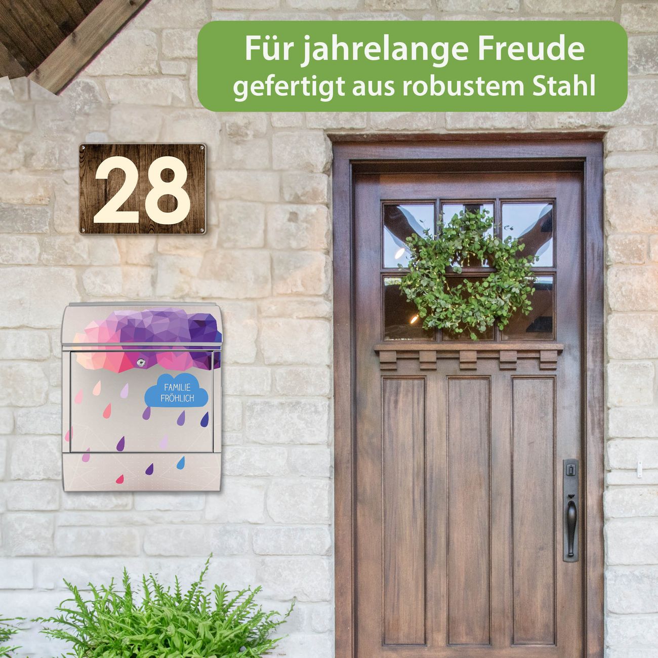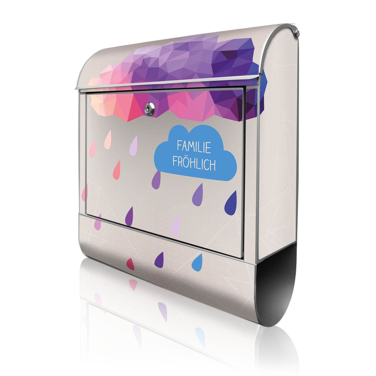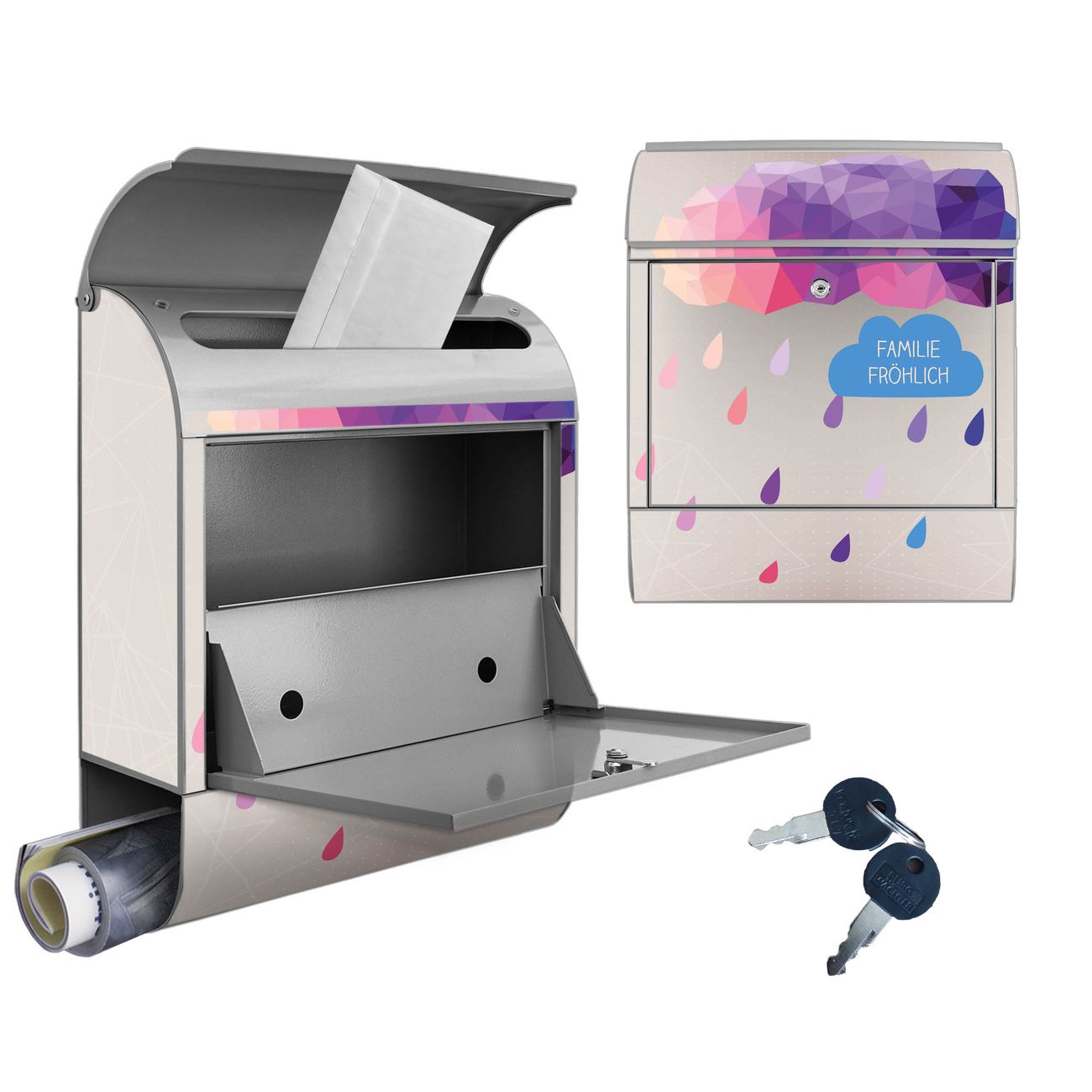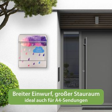 DESIGN: Der Postkasten mit Motiv Motiv Regenwolke hat ein sehr ansprechendes und ausgefallenes Design, damit entlocken Sie Ihren Nachbarn und dem Postboten ein Lächeln. Heben Sie Sich von der tristen grauen Masse ab, ohne auf Funktionalität zu verzichten. DETAILS: Der Postkasten besteht aus pulverbeschichtetem Stahl. Er ist 38x46x12,5cm groß. Das Motiv besteht aus einer wetter- und UV-resistenten Folie, die mit einem Schutzlaminat überzogen ist, sodass der Briefkasten zusätzlich vor Kratzern geschützt ist. Der Briefkasten wird mit Montagematerial, zusätzlich zwei Schlüssel sowie einer Bohrschablone geliefert. NUTZEN: Sie können diesen Briefkasten sowohl als Wandbriefkasten montieren oder einen passenden Ständer kaufen und als Standbriefkasten einbetonieren. Die Größe bietet genügend Platz für Sendungen aller Art, der Einwurf fasst auch größere A4 Sendungen. BANJADO: Ihr Briefkasten wird in Sachsen in einer kleinen Manufaktur von Hand veredelt. Die Motivfolie ist lösungsmittelfrei und schutzlaminiert für einen langen Halt. Wir legen großen Wert auf die Verbindung von Funktionalität und Design. Sie erhalten Handarbeit aus Sachsen.