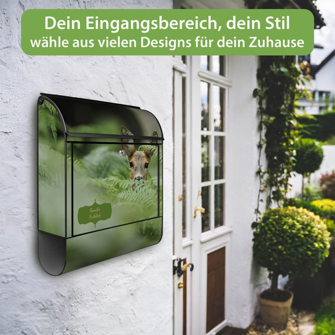 DESIGN: Der Postkasten mit Motiv Motiv Reh hat ein sehr ansprechendes und ausgefallenes Design, damit entlocken Sie Ihren Nachbarn und dem Postboten ein Lächeln. Heben Sie Sich von der tristen grauen Masse ab, ohne auf Funktionalität zu verzichten. DETAILS: Der Postkasten besteht aus pulverbeschichtetem Stahl. Er ist 38x46x12,5cm groß. Das Motiv besteht aus einer wetter- und UV-resistenten Folie, die mit einem Schutzlaminat überzogen ist, sodass der Briefkasten zusätzlich vor Kratzern geschützt ist. Der Briefkasten wird mit Montagematerial, zusätzlich zwei Schlüssel sowie einer Bohrschablone geliefert. NUTZEN: Sie können diesen Briefkasten sowohl als Wandbriefkasten montieren oder einen passenden Ständer kaufen und als Standbriefkasten einbetonieren. Die Größe bietet genügend Platz für Sendungen aller Art, der Einwurf fasst auch größere A4 Sendungen. BANJADO: Ihr Briefkasten wird in Sachsen in einer kleinen Manufaktur von Hand veredelt. Die Motivfolie ist lösungsmittelfrei und schutzlaminiert für einen langen Halt. Wir legen großen Wert auf die Verbindung von Funktionalität und Design. Sie erhalten Handarbeit aus Sachsen.