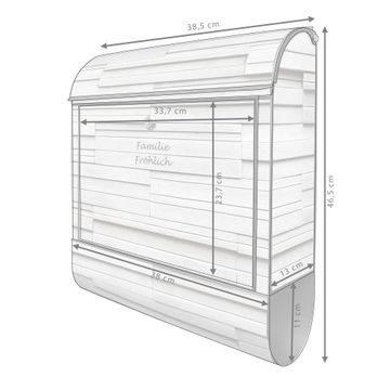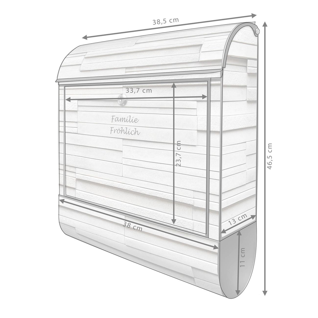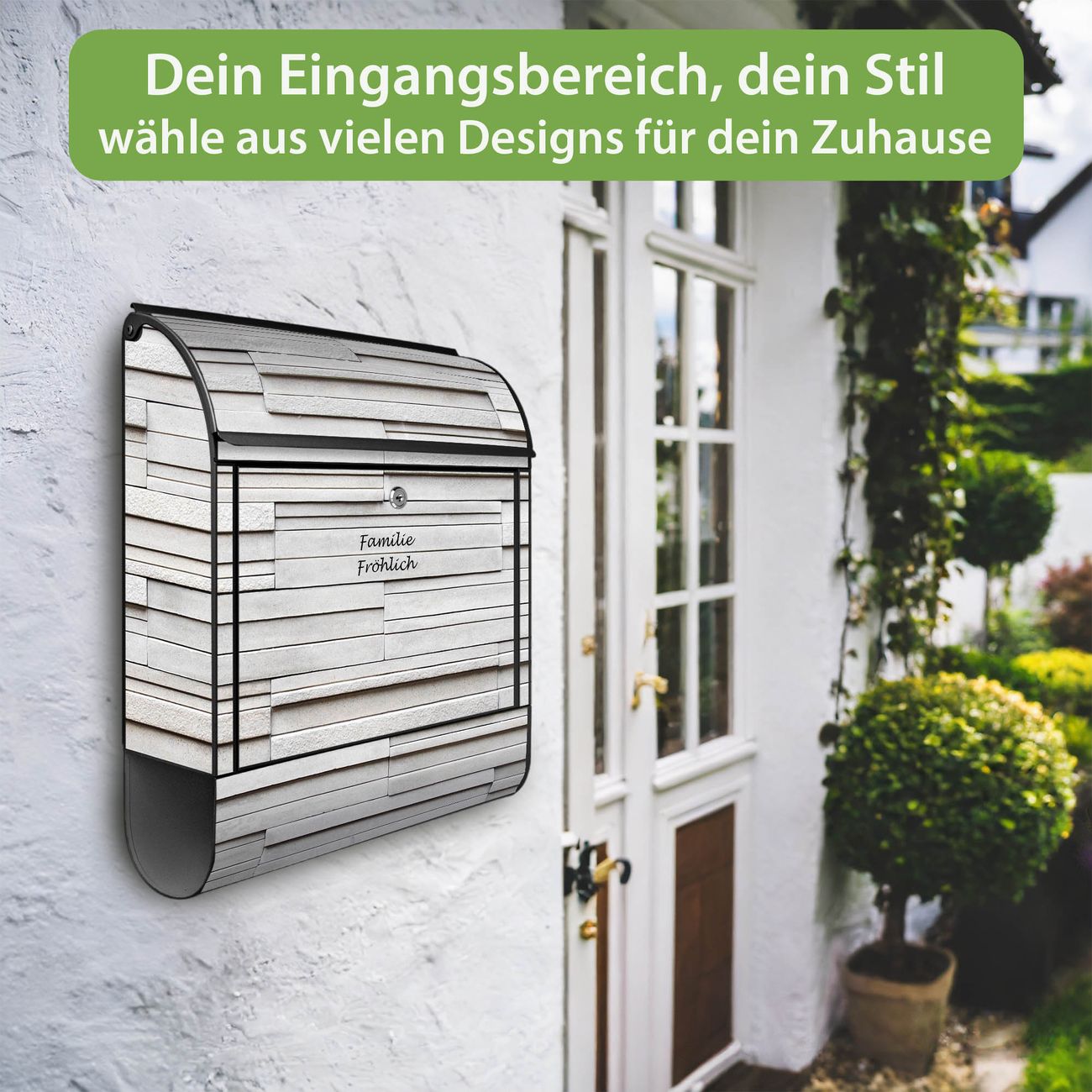 DESIGN: Der Postkasten mit Motiv Motiv Relief hat ein sehr ansprechendes und ausgefallenes Design, damit entlocken Sie Ihren Nachbarn und dem Postboten ein Lächeln. Heben Sie Sich von der tristen grauen Masse ab, ohne auf Funktionalität zu verzichten. DETAILS: Der Postkasten besteht aus pulverbeschichtetem Stahl. Er ist 38x46x12,5cm groß. Das Motiv besteht aus einer wetter- und UV-resistenten Folie, die mit einem Schutzlaminat überzogen ist, sodass der Briefkasten zusätzlich vor Kratzern geschützt ist. Der Briefkasten wird mit Montagematerial, zusätzlich zwei Schlüssel sowie einer Bohrschablone geliefert. NUTZEN: Sie können diesen Briefkasten sowohl als Wandbriefkasten montieren oder einen passenden Ständer kaufen und als Standbriefkasten einbetonieren. Die Größe bietet genügend Platz für Sendungen aller Art, der Einwurf fasst auch größere A4 Sendungen. BANJADO: Ihr Briefkasten wird in Sachsen in einer kleinen Manufaktur von Hand veredelt. Die Motivfolie ist lösungsmittelfrei und schutzlaminiert für einen langen Halt. Wir legen großen Wert auf die Verbindung von Funktionalität und Design. Sie erhalten Handarbeit aus Sachsen.