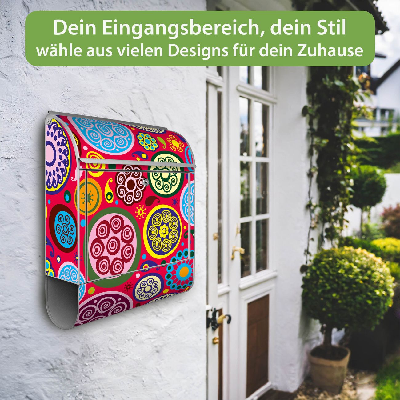 DESIGN: Der Postkasten mit Motiv Motiv Retro Kreise hat ein sehr ansprechendes und ausgefallenes Design, damit entlocken Sie Ihren Nachbarn und dem Postboten ein Lächeln. Heben Sie Sich von der tristen grauen Masse ab, ohne auf Funktionalität zu verzichten. DETAILS: Der Postkasten besteht aus pulverbeschichtetem Stahl. Er ist 38x46x12,5cm groß. Das Motiv besteht aus einer wetter- und UV-resistenten Folie, die mit einem Schutzlaminat überzogen ist, sodass der Briefkasten zusätzlich vor Kratzern geschützt ist. Der Briefkasten wird mit Montagematerial, zusätzlich zwei Schlüssel sowie einer Bohrschablone geliefert. NUTZEN: Sie können diesen Briefkasten sowohl als Wandbriefkasten montieren oder einen passenden Ständer kaufen und als Standbriefkasten einbetonieren. Die Größe bietet genügend Platz für Sendungen aller Art, der Einwurf fasst auch größere A4 Sendungen. BANJADO: Ihr Briefkasten wird in Sachsen in einer kleinen Manufaktur von Hand veredelt. Die Motivfolie ist lösungsmittelfrei und schutzlaminiert für einen langen Halt. Wir legen großen Wert auf die Verbindung von Funktionalität und Design. Sie erhalten Handarbeit aus Sachsen.