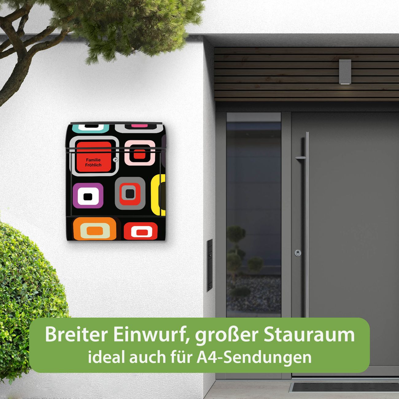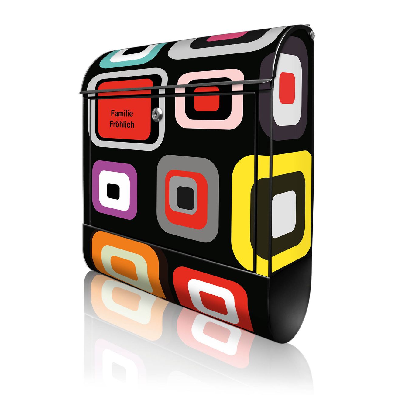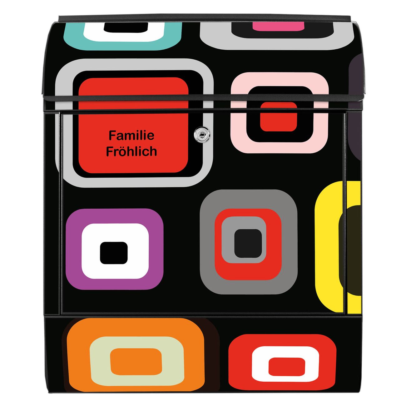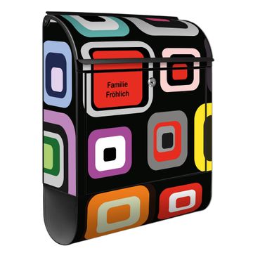 DESIGN: Der Postkasten mit Motiv Motiv Retro hat ein sehr ansprechendes und ausgefallenes Design, damit entlocken Sie Ihren Nachbarn und dem Postboten ein Lächeln. Heben Sie Sich von der tristen grauen Masse ab, ohne auf Funktionalität zu verzichten. DETAILS: Der Postkasten besteht aus pulverbeschichtetem Stahl. Er ist 38x46x12,5cm groß. Das Motiv besteht aus einer wetter- und UV-resistenten Folie, die mit einem Schutzlaminat überzogen ist, sodass der Briefkasten zusätzlich vor Kratzern geschützt ist. Der Briefkasten wird mit Montagematerial, zusätzlich zwei Schlüssel sowie einer Bohrschablone geliefert. NUTZEN: Sie können diesen Briefkasten sowohl als Wandbriefkasten montieren oder einen passenden Ständer kaufen und als Standbriefkasten einbetonieren. Die Größe bietet genügend Platz für Sendungen aller Art, der Einwurf fasst auch größere A4 Sendungen. BANJADO: Ihr Briefkasten wird in Sachsen in einer kleinen Manufaktur von Hand veredelt. Die Motivfolie ist lösungsmittelfrei und schutzlaminiert für einen langen Halt. Wir legen großen Wert auf die Verbindung von Funktionalität und Design. Sie erhalten Handarbeit aus Sachsen.
