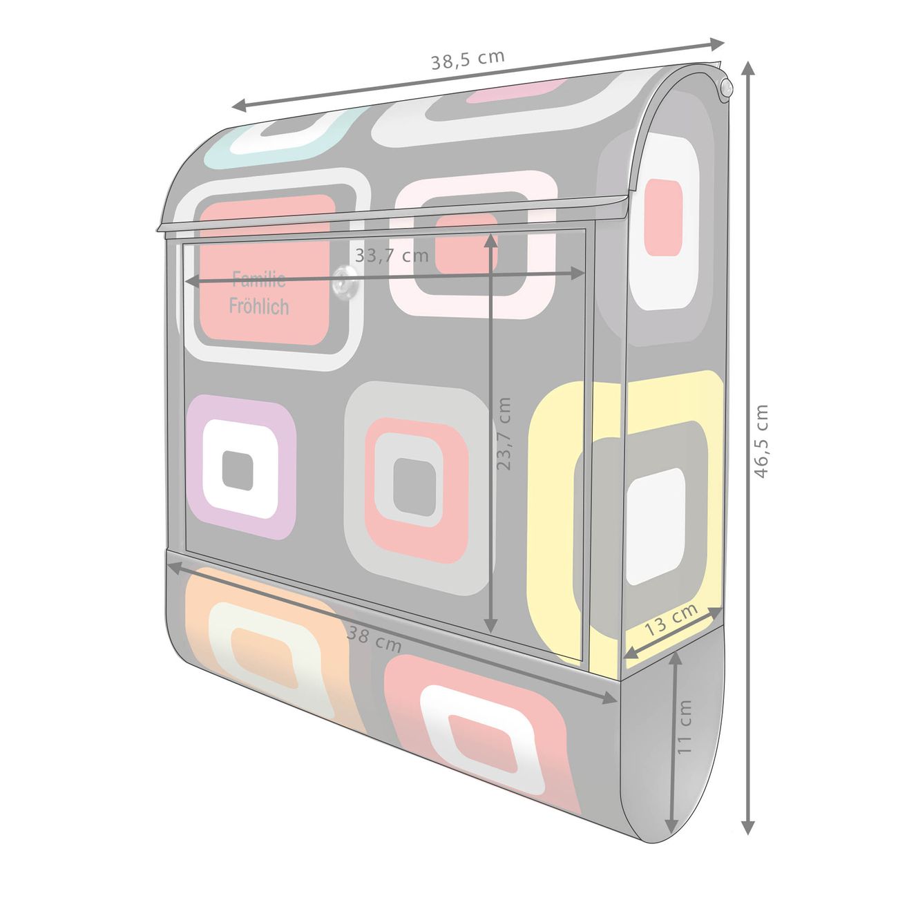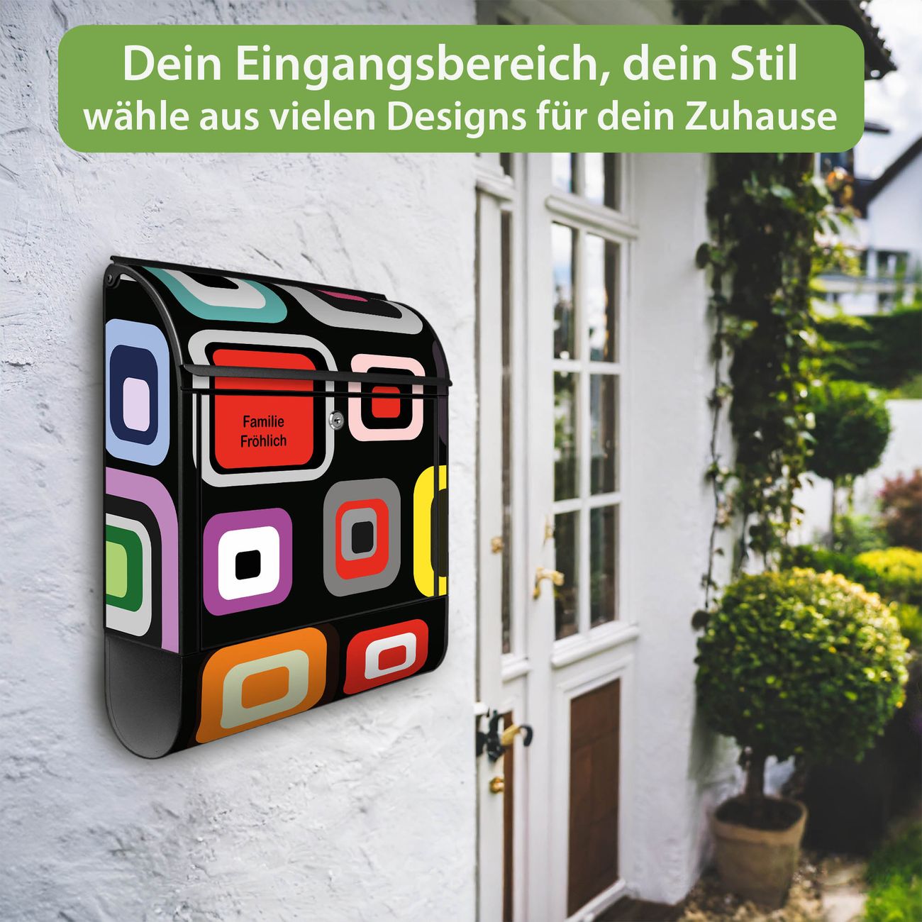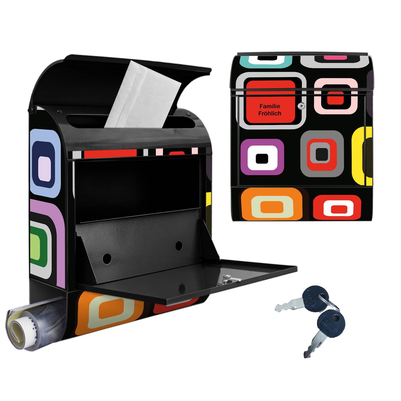 DESIGN: Der Postkasten mit Motiv Motiv Retro hat ein sehr ansprechendes und ausgefallenes Design, damit entlocken Sie Ihren Nachbarn und dem Postboten ein Lächeln. Heben Sie Sich von der tristen grauen Masse ab, ohne auf Funktionalität zu verzichten. DETAILS: Der Postkasten besteht aus pulverbeschichtetem Stahl. Er ist 38x46x12,5cm groß. Das Motiv besteht aus einer wetter- und UV-resistenten Folie, die mit einem Schutzlaminat überzogen ist, sodass der Briefkasten zusätzlich vor Kratzern geschützt ist. Der Briefkasten wird mit Montagematerial, zusätzlich zwei Schlüssel sowie einer Bohrschablone geliefert. NUTZEN: Sie können diesen Briefkasten sowohl als Wandbriefkasten montieren oder einen passenden Ständer kaufen und als Standbriefkasten einbetonieren. Die Größe bietet genügend Platz für Sendungen aller Art, der Einwurf fasst auch größere A4 Sendungen. BANJADO: Ihr Briefkasten wird in Sachsen in einer kleinen Manufaktur von Hand veredelt. Die Motivfolie ist lösungsmittelfrei und schutzlaminiert für einen langen Halt. Wir legen großen Wert auf die Verbindung von Funktionalität und Design. Sie erhalten Handarbeit aus Sachsen.