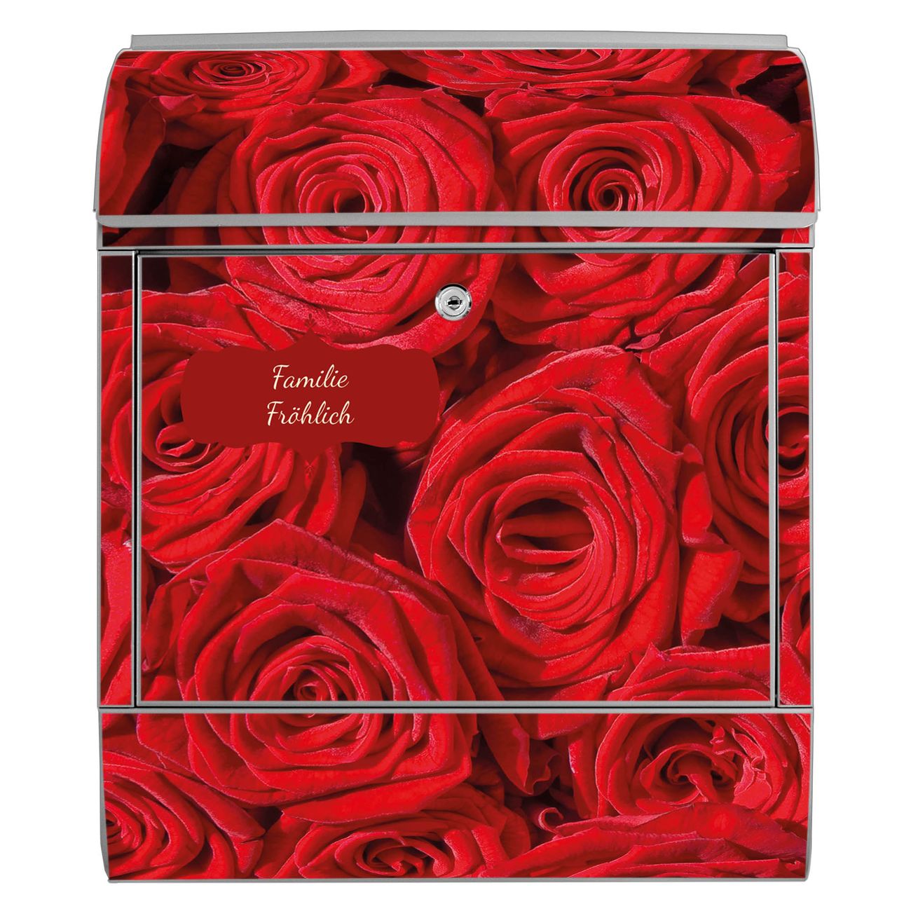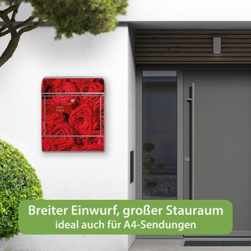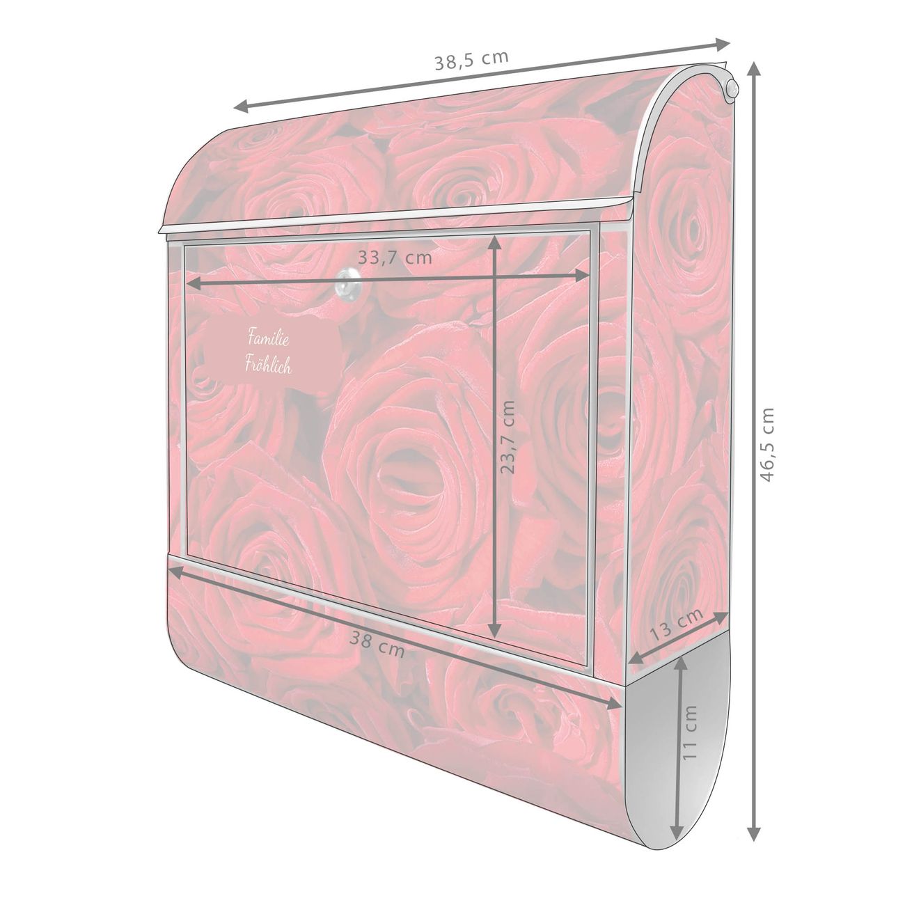 DESIGN: Der Postkasten mit Motiv Motiv Rosenbett hat ein sehr ansprechendes und ausgefallenes Design, damit entlocken Sie Ihren Nachbarn und dem Postboten ein Lächeln. Heben Sie Sich von der tristen grauen Masse ab, ohne auf Funktionalität zu verzichten. DETAILS: Der Postkasten besteht aus pulverbeschichtetem Stahl. Er ist 38x46x12,5cm groß. Das Motiv besteht aus einer wetter- und UV-resistenten Folie, die mit einem Schutzlaminat überzogen ist, sodass der Briefkasten zusätzlich vor Kratzern geschützt ist. Der Briefkasten wird mit Montagematerial, zusätzlich zwei Schlüssel sowie einer Bohrschablone geliefert. NUTZEN: Sie können diesen Briefkasten sowohl als Wandbriefkasten montieren oder einen passenden Ständer kaufen und als Standbriefkasten einbetonieren. Die Größe bietet genügend Platz für Sendungen aller Art, der Einwurf fasst auch größere A4 Sendungen. BANJADO: Ihr Briefkasten wird in Sachsen in einer kleinen Manufaktur von Hand veredelt. Die Motivfolie ist lösungsmittelfrei und schutzlaminiert für einen langen Halt. Wir legen großen Wert auf die Verbindung von Funktionalität und Design. Sie erhalten Handarbeit aus Sachsen.