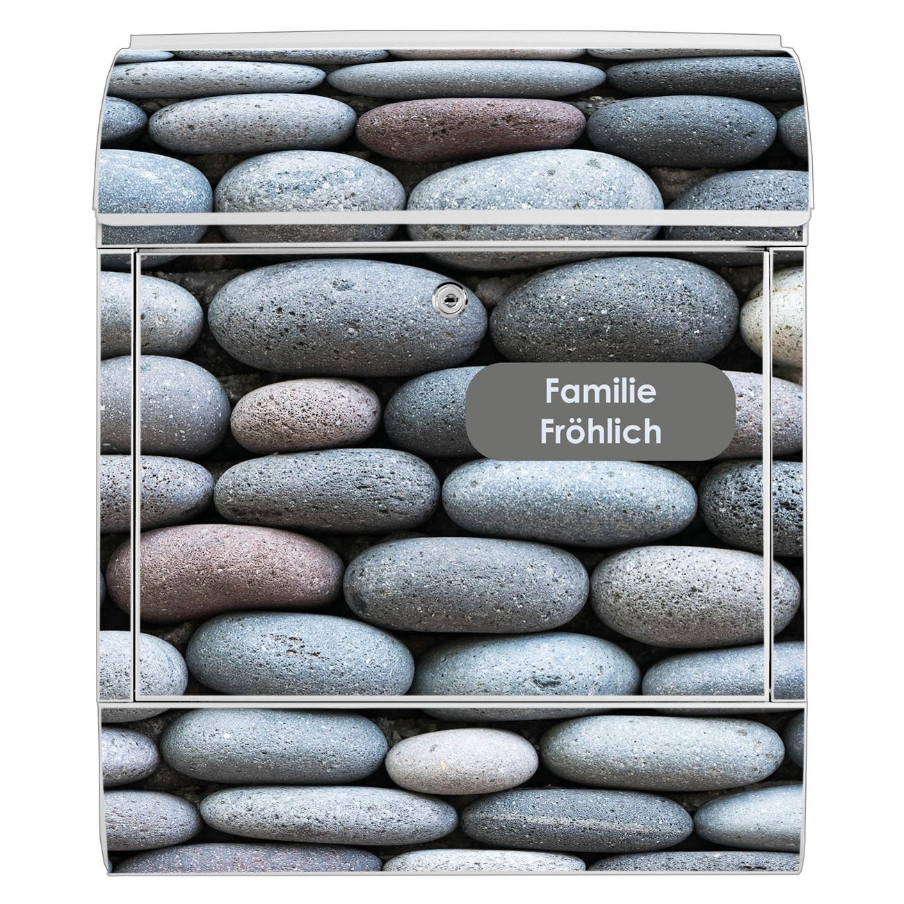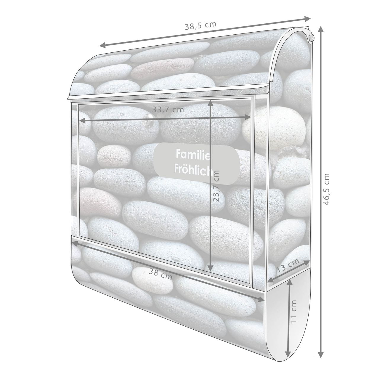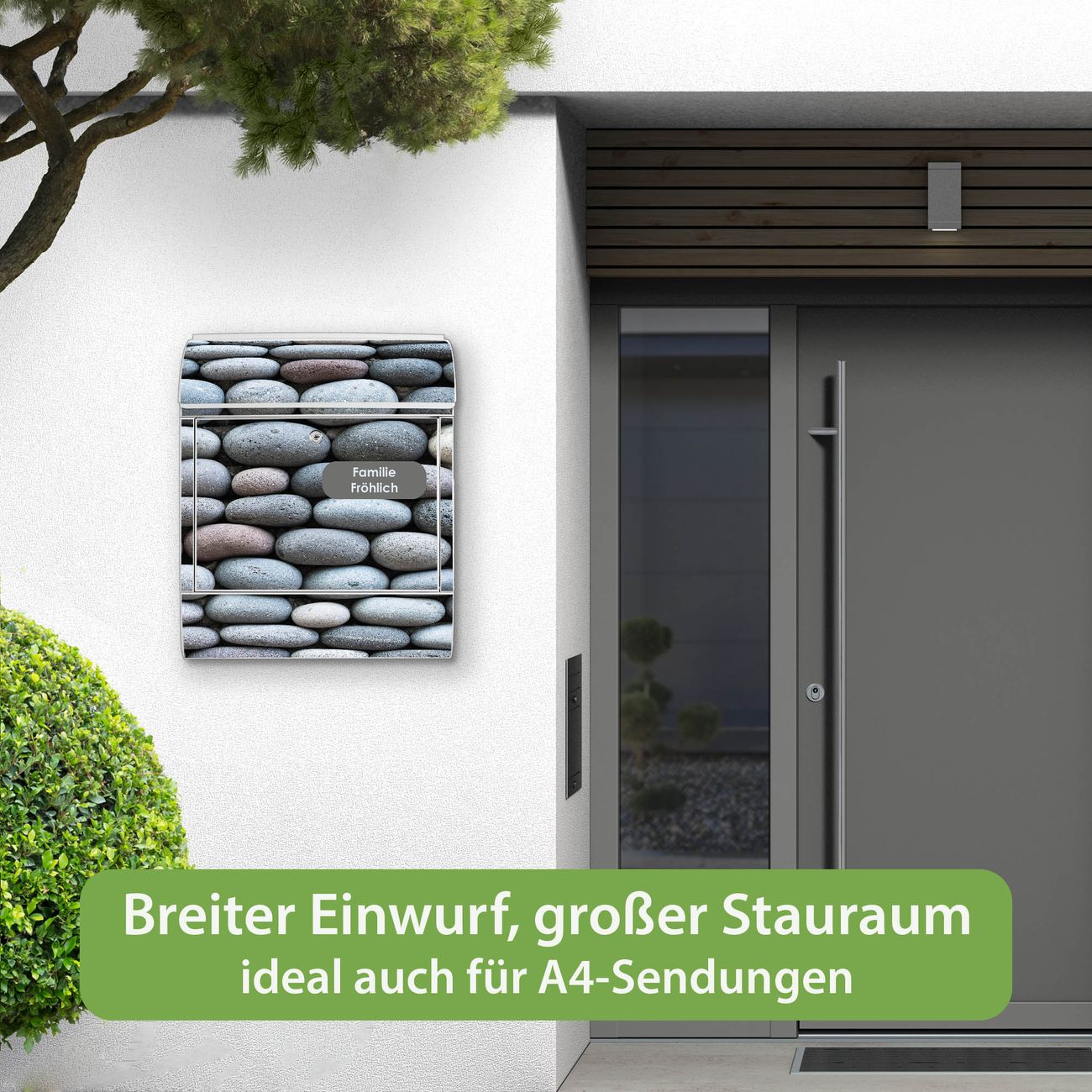 DESIGN: Der Postkasten mit Motiv Motiv Runde Steine hat ein sehr ansprechendes und ausgefallenes Design, damit entlocken Sie Ihren Nachbarn und dem Postboten ein Lächeln. Heben Sie Sich von der tristen grauen Masse ab, ohne auf Funktionalität zu verzichten. DETAILS: Der Postkasten besteht aus pulverbeschichtetem Stahl. Er ist 38x46x12,5cm groß. Das Motiv besteht aus einer wetter- und UV-resistenten Folie, die mit einem Schutzlaminat überzogen ist, sodass der Briefkasten zusätzlich vor Kratzern geschützt ist. Der Briefkasten wird mit Montagematerial, zusätzlich zwei Schlüssel sowie einer Bohrschablone geliefert. NUTZEN: Sie können diesen Briefkasten sowohl als Wandbriefkasten montieren oder einen passenden Ständer kaufen und als Standbriefkasten einbetonieren. Die Größe bietet genügend Platz für Sendungen aller Art, der Einwurf fasst auch größere A4 Sendungen. BANJADO: Ihr Briefkasten wird in Sachsen in einer kleinen Manufaktur von Hand veredelt. Die Motivfolie ist lösungsmittelfrei und schutzlaminiert für einen langen Halt. Wir legen großen Wert auf die Verbindung von Funktionalität und Design. Sie erhalten Handarbeit aus Sachsen.
