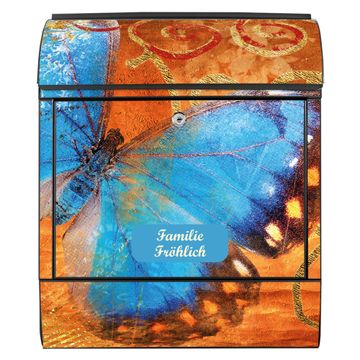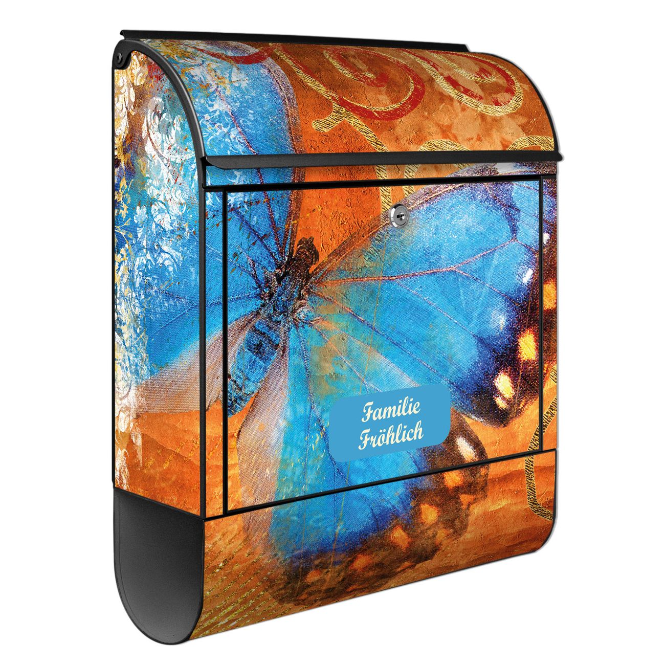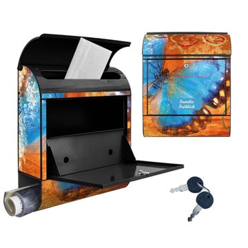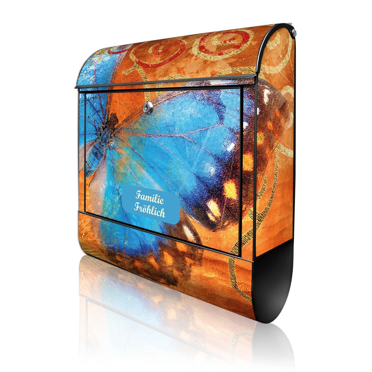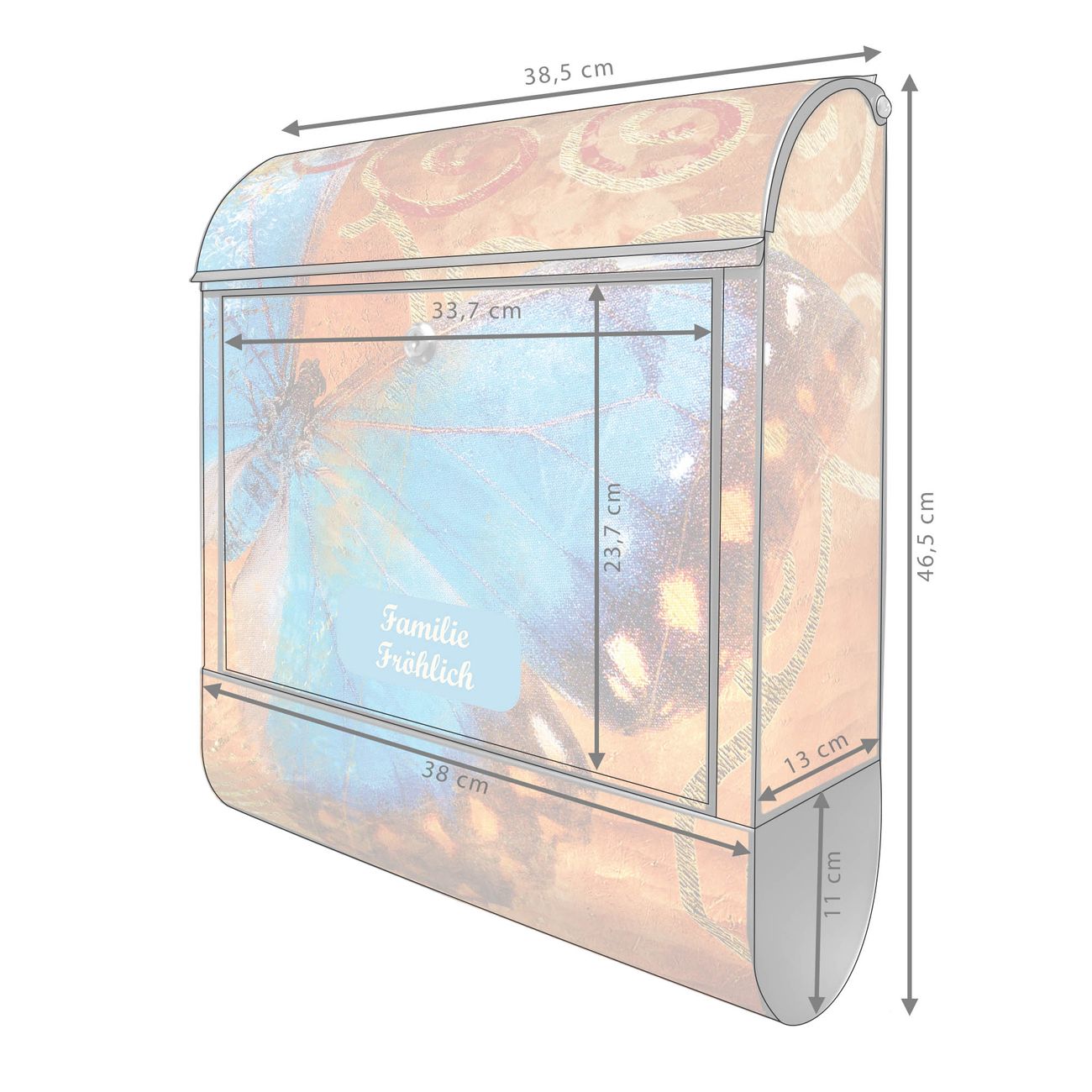 DESIGN: Der Postkasten mit Motiv Motiv Schmetterling hat ein sehr ansprechendes und ausgefallenes Design, damit entlocken Sie Ihren Nachbarn und dem Postboten ein Lächeln. Heben Sie Sich von der tristen grauen Masse ab, ohne auf Funktionalität zu verzichten. DETAILS: Der Postkasten besteht aus pulverbeschichtetem Stahl. Er ist 38x46x12,5cm groß. Das Motiv besteht aus einer wetter- und UV-resistenten Folie, die mit einem Schutzlaminat überzogen ist, sodass der Briefkasten zusätzlich vor Kratzern geschützt ist. Der Briefkasten wird mit Montagematerial, zusätzlich zwei Schlüssel sowie einer Bohrschablone geliefert. NUTZEN: Sie können diesen Briefkasten sowohl als Wandbriefkasten montieren oder einen passenden Ständer kaufen und als Standbriefkasten einbetonieren. Die Größe bietet genügend Platz für Sendungen aller Art, der Einwurf fasst auch größere A4 Sendungen. BANJADO: Ihr Briefkasten wird in Sachsen in einer kleinen Manufaktur von Hand veredelt. Die Motivfolie ist lösungsmittelfrei und schutzlaminiert für einen langen Halt. Wir legen großen Wert auf die Verbindung von Funktionalität und Design. Sie erhalten Handarbeit aus Sachsen.