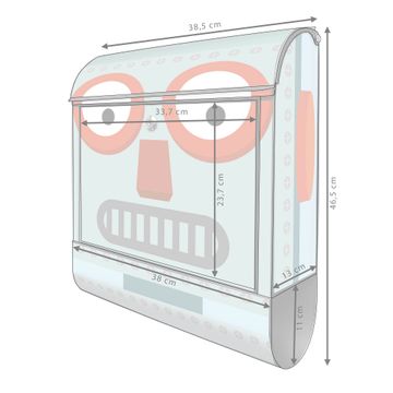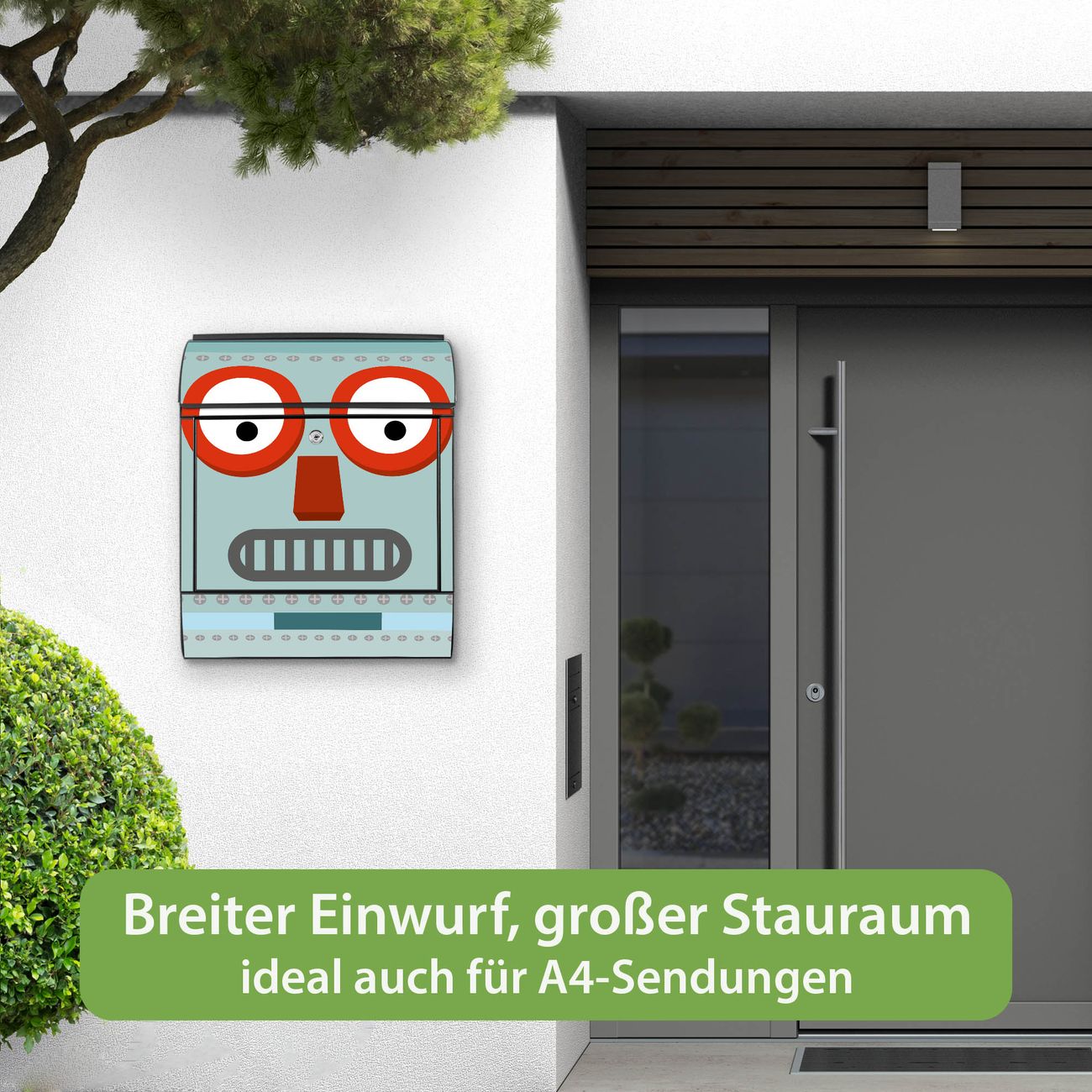 DESIGN: Der Postkasten mit Motiv Motiv Shocked Robot hat ein sehr ansprechendes und ausgefallenes Design, damit entlocken Sie Ihren Nachbarn und dem Postboten ein Lächeln. Heben Sie Sich von der tristen grauen Masse ab, ohne auf Funktionalität zu verzichten. DETAILS: Der Postkasten besteht aus pulverbeschichtetem Stahl. Er ist 38x46x12,5cm groß. Das Motiv besteht aus einer wetter- und UV-resistenten Folie, die mit einem Schutzlaminat überzogen ist, sodass der Briefkasten zusätzlich vor Kratzern geschützt ist. Der Briefkasten wird mit Montagematerial, zusätzlich zwei Schlüssel sowie einer Bohrschablone geliefert. NUTZEN: Sie können diesen Briefkasten sowohl als Wandbriefkasten montieren oder einen passenden Ständer kaufen und als Standbriefkasten einbetonieren. Die Größe bietet genügend Platz für Sendungen aller Art, der Einwurf fasst auch größere A4 Sendungen. BANJADO: Ihr Briefkasten wird in Sachsen in einer kleinen Manufaktur von Hand veredelt. Die Motivfolie ist lösungsmittelfrei und schutzlaminiert für einen langen Halt. Wir legen großen Wert auf die Verbindung von Funktionalität und Design. Sie erhalten Handarbeit aus Sachsen.