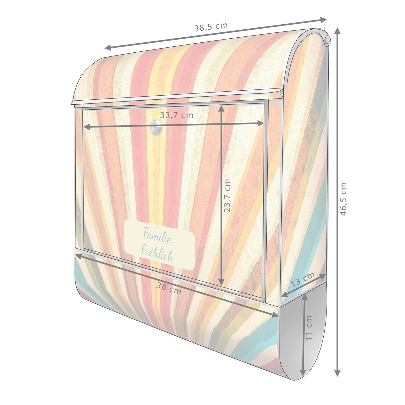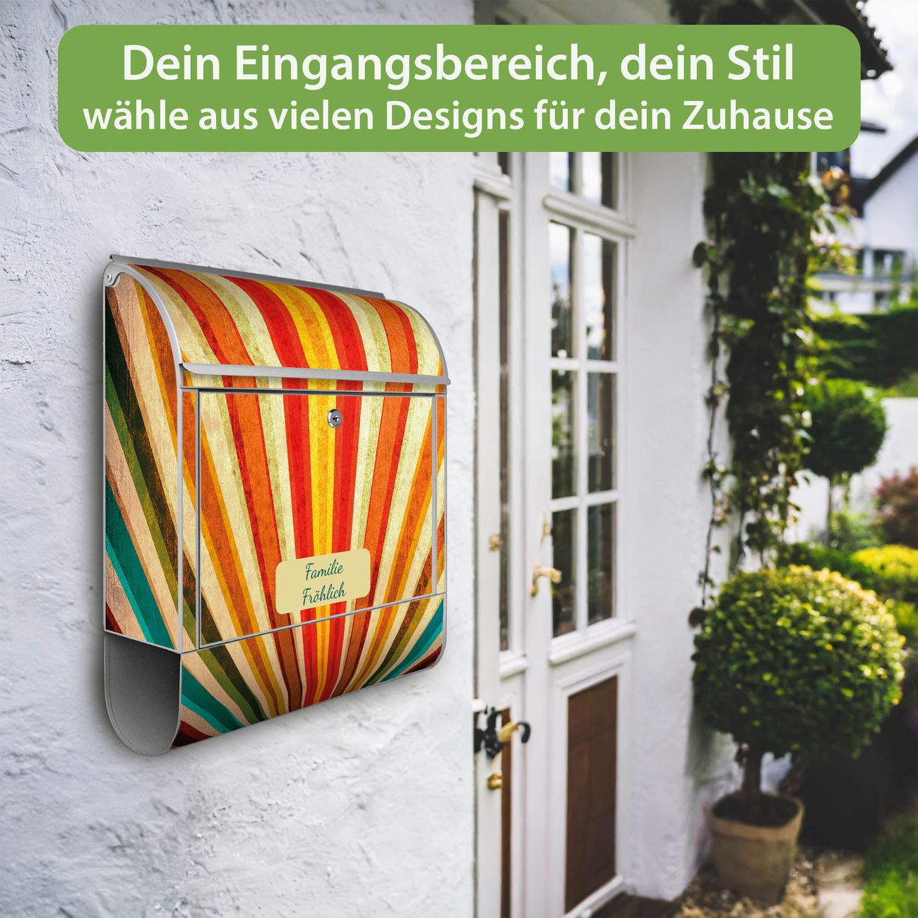 DESIGN: Der Postkasten mit Motiv Motiv Sonnenuntergang Abstrakt hat ein sehr ansprechendes und ausgefallenes Design, damit entlocken Sie Ihren Nachbarn und dem Postboten ein Lächeln. Heben Sie Sich von der tristen grauen Masse ab, ohne auf Funktionalität zu verzichten. DETAILS: Der Postkasten besteht aus pulverbeschichtetem Stahl. Er ist 38x46x12,5cm groß. Das Motiv besteht aus einer wetter- und UV-resistenten Folie, die mit einem Schutzlaminat überzogen ist, sodass der Briefkasten zusätzlich vor Kratzern geschützt ist. Der Briefkasten wird mit Montagematerial, zusätzlich zwei Schlüssel sowie einer Bohrschablone geliefert. NUTZEN: Sie können diesen Briefkasten sowohl als Wandbriefkasten montieren oder einen passenden Ständer kaufen und als Standbriefkasten einbetonieren. Die Größe bietet genügend Platz für Sendungen aller Art, der Einwurf fasst auch größere A4 Sendungen. BANJADO: Ihr Briefkasten wird in Sachsen in einer kleinen Manufaktur von Hand veredelt. Die Motivfolie ist lösungsmittelfrei und schutzlaminiert für einen langen Halt. Wir legen großen Wert auf die Verbindung von Funktionalität und Design. Sie erhalten Handarbeit aus Sachsen.