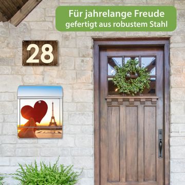 DESIGN: Der Postkasten mit Motiv Motiv Stadt Der Liebe hat ein sehr ansprechendes und ausgefallenes Design, damit entlocken Sie Ihren Nachbarn und dem Postboten ein Lächeln. Heben Sie Sich von der tristen grauen Masse ab, ohne auf Funktionalität zu verzichten. DETAILS: Der Postkasten besteht aus pulverbeschichtetem Stahl. Er ist 38x46x12,5cm groß. Das Motiv besteht aus einer wetter- und UV-resistenten Folie, die mit einem Schutzlaminat überzogen ist, sodass der Briefkasten zusätzlich vor Kratzern geschützt ist. Der Briefkasten wird mit Montagematerial, zusätzlich zwei Schlüssel sowie einer Bohrschablone geliefert. NUTZEN: Sie können diesen Briefkasten sowohl als Wandbriefkasten montieren oder einen passenden Ständer kaufen und als Standbriefkasten einbetonieren. Die Größe bietet genügend Platz für Sendungen aller Art, der Einwurf fasst auch größere A4 Sendungen. BANJADO: Ihr Briefkasten wird in Sachsen in einer kleinen Manufaktur von Hand veredelt. Die Motivfolie ist lösungsmittelfrei und schutzlaminiert für einen langen Halt. Wir legen großen Wert auf die Verbindung von Funktionalität und Design. Sie erhalten Handarbeit aus Sachsen.