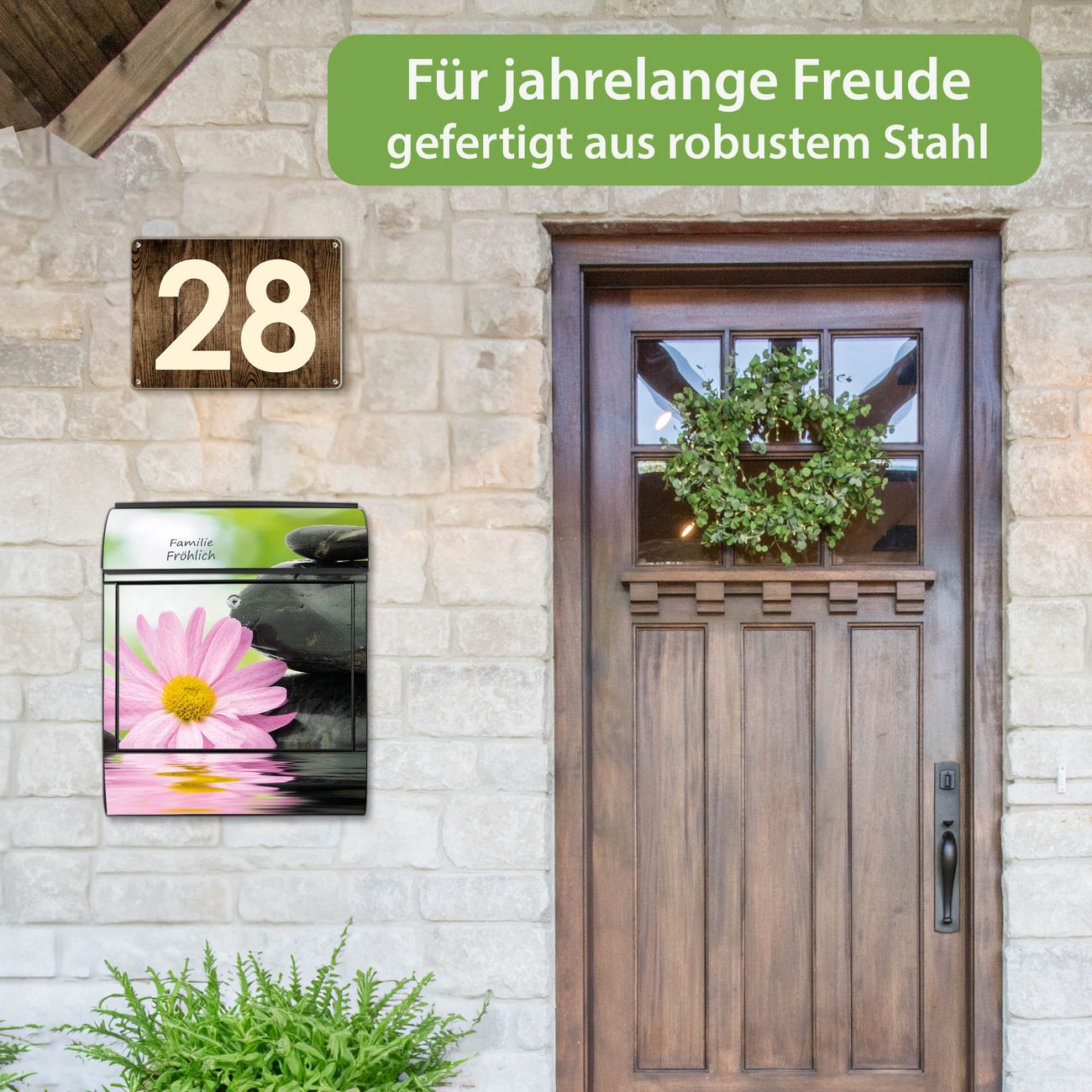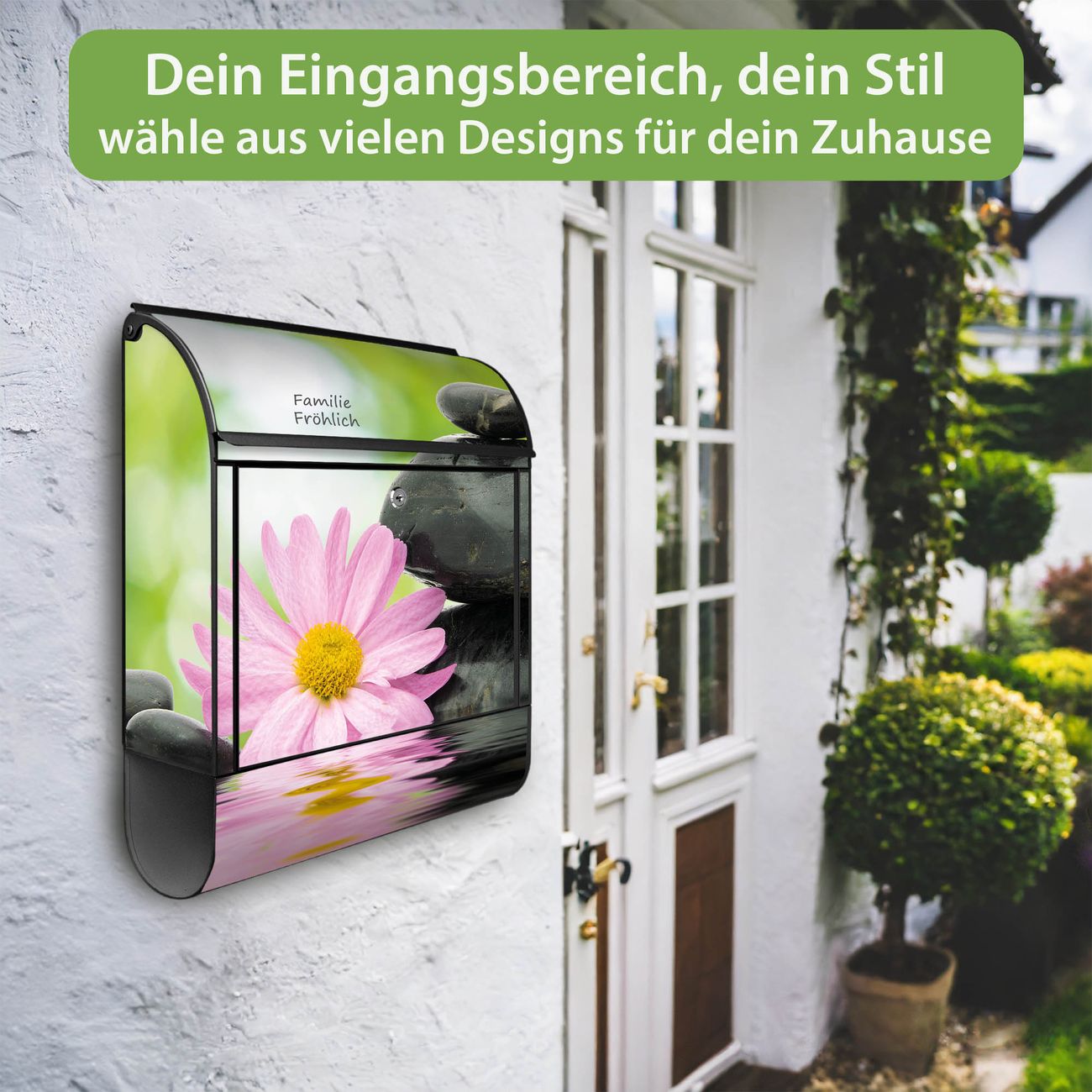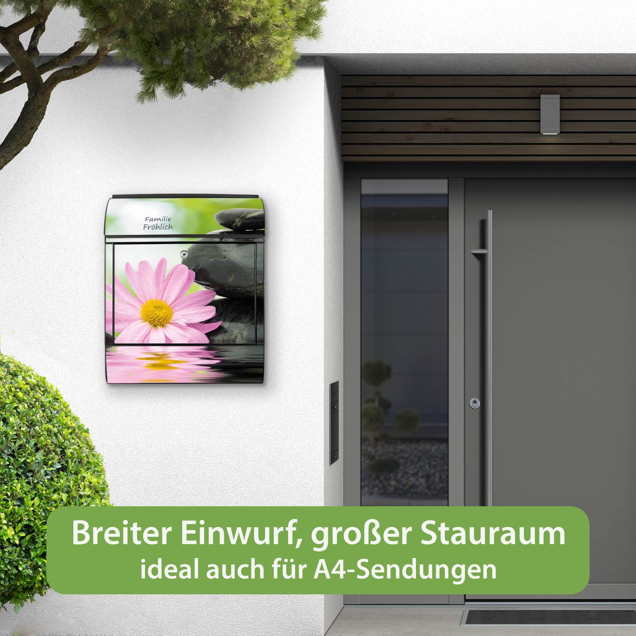 DESIGN: Der Postkasten mit Motiv Motiv Steine & Relax 2 hat ein sehr ansprechendes und ausgefallenes Design, damit entlocken Sie Ihren Nachbarn und dem Postboten ein Lächeln. Heben Sie Sich von der tristen grauen Masse ab, ohne auf Funktionalität zu verzichten. DETAILS: Der Postkasten besteht aus pulverbeschichtetem Stahl. Er ist 38x46x12,5cm groß. Das Motiv besteht aus einer wetter- und UV-resistenten Folie, die mit einem Schutzlaminat überzogen ist, sodass der Briefkasten zusätzlich vor Kratzern geschützt ist. Der Briefkasten wird mit Montagematerial, zusätzlich zwei Schlüssel sowie einer Bohrschablone geliefert. NUTZEN: Sie können diesen Briefkasten sowohl als Wandbriefkasten montieren oder einen passenden Ständer kaufen und als Standbriefkasten einbetonieren. Die Größe bietet genügend Platz für Sendungen aller Art, der Einwurf fasst auch größere A4 Sendungen. BANJADO: Ihr Briefkasten wird in Sachsen in einer kleinen Manufaktur von Hand veredelt. Die Motivfolie ist lösungsmittelfrei und schutzlaminiert für einen langen Halt. Wir legen großen Wert auf die Verbindung von Funktionalität und Design. Sie erhalten Handarbeit aus Sachsen.