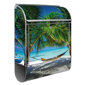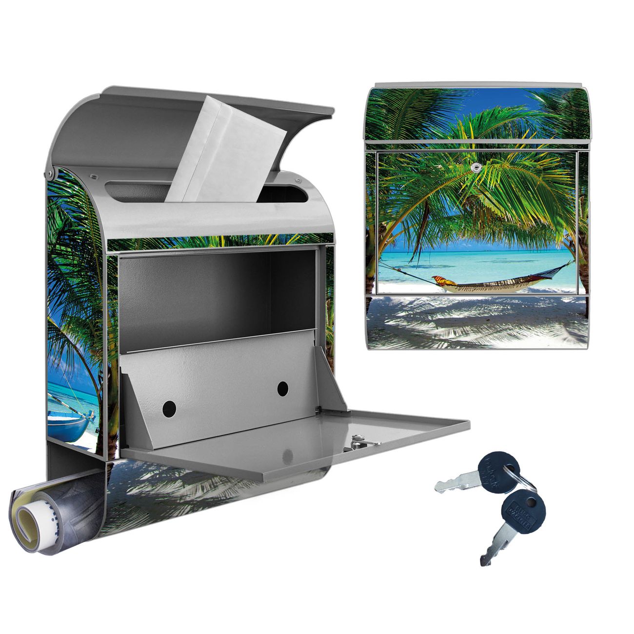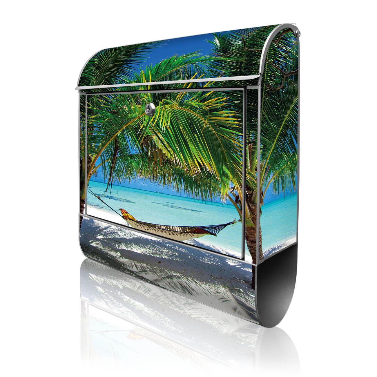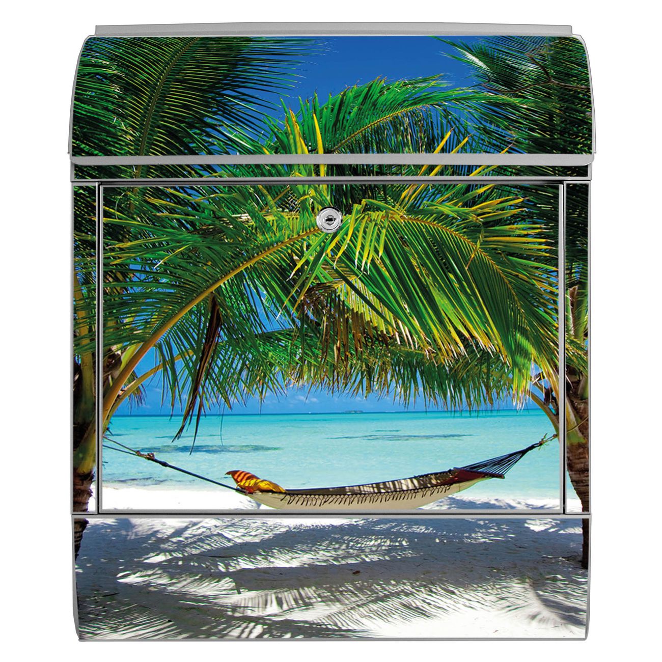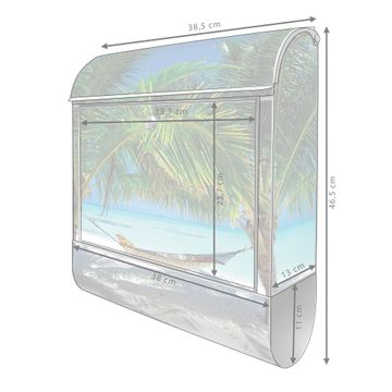 DESIGN: Der Postkasten mit Motiv Motiv Strand hat ein sehr ansprechendes und ausgefallenes Design, damit entlocken Sie Ihren Nachbarn und dem Postboten ein Lächeln. Heben Sie Sich von der tristen grauen Masse ab, ohne auf Funktionalität zu verzichten. DETAILS: Der Postkasten besteht aus pulverbeschichtetem Stahl. Er ist 38x46x12,5cm groß. Das Motiv besteht aus einer wetter- und UV-resistenten Folie, die mit einem Schutzlaminat überzogen ist, sodass der Briefkasten zusätzlich vor Kratzern geschützt ist. Der Briefkasten wird mit Montagematerial, zusätzlich zwei Schlüssel sowie einer Bohrschablone geliefert. NUTZEN: Sie können diesen Briefkasten sowohl als Wandbriefkasten montieren oder einen passenden Ständer kaufen und als Standbriefkasten einbetonieren. Die Größe bietet genügend Platz für Sendungen aller Art, der Einwurf fasst auch größere A4 Sendungen. BANJADO: Ihr Briefkasten wird in Sachsen in einer kleinen Manufaktur von Hand veredelt. Die Motivfolie ist lösungsmittelfrei und schutzlaminiert für einen langen Halt. Wir legen großen Wert auf die Verbindung von Funktionalität und Design. Sie erhalten Handarbeit aus Sachsen.