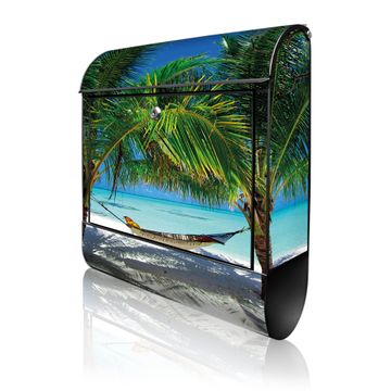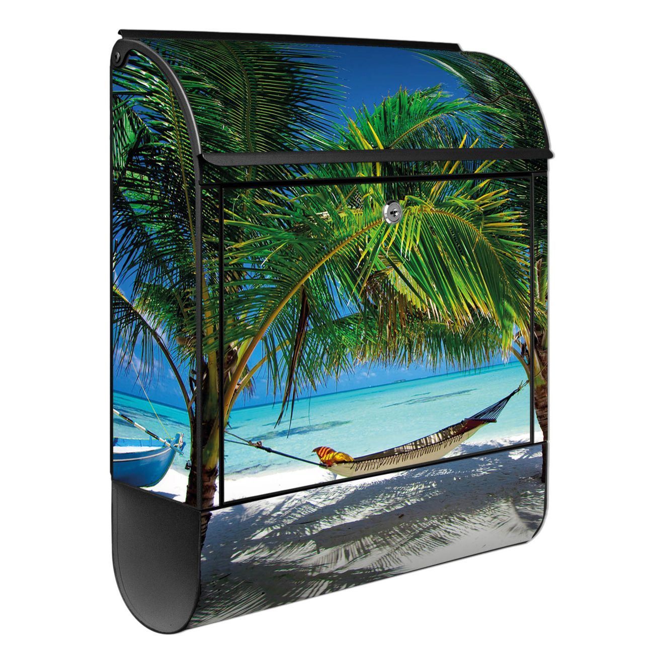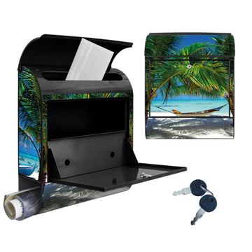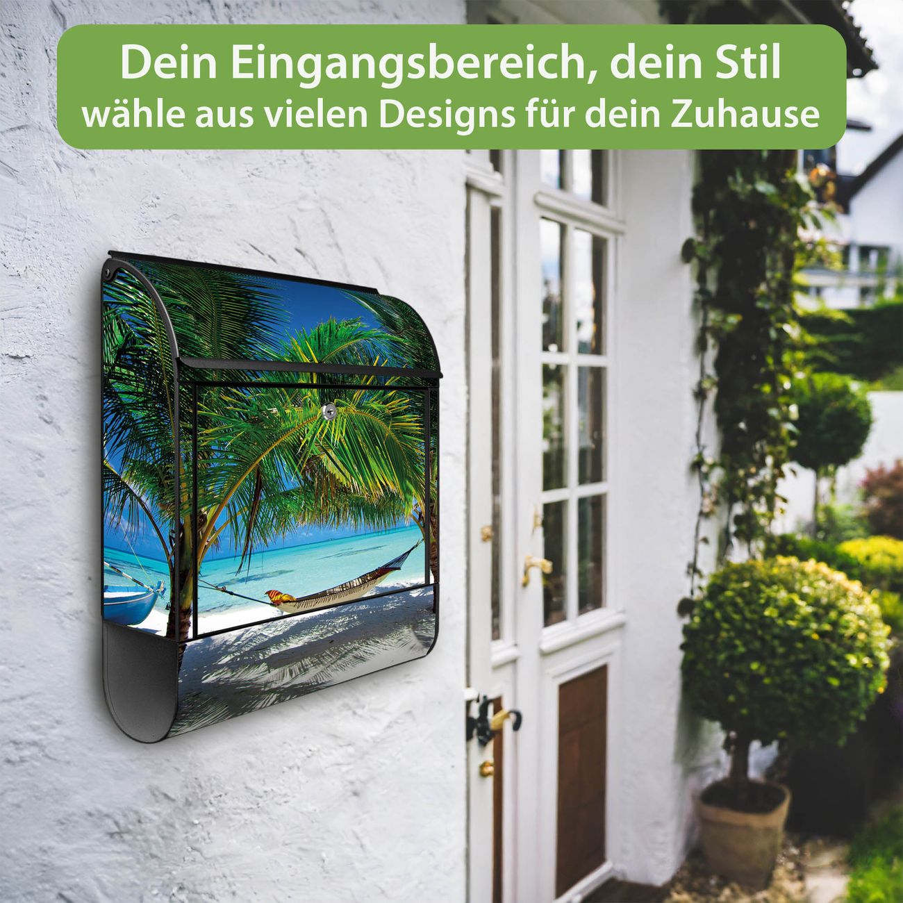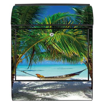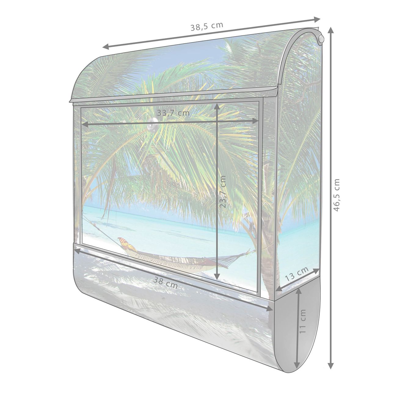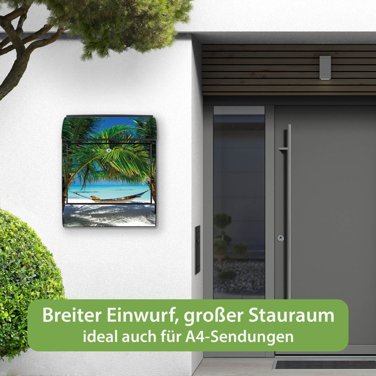 DESIGN: Der Postkasten mit Motiv Motiv Strand hat ein sehr ansprechendes und ausgefallenes Design, damit entlocken Sie Ihren Nachbarn und dem Postboten ein Lächeln. Heben Sie Sich von der tristen grauen Masse ab, ohne auf Funktionalität zu verzichten. DETAILS: Der Postkasten besteht aus pulverbeschichtetem Stahl. Er ist 38x46x12,5cm groß. Das Motiv besteht aus einer wetter- und UV-resistenten Folie, die mit einem Schutzlaminat überzogen ist, sodass der Briefkasten zusätzlich vor Kratzern geschützt ist. Der Briefkasten wird mit Montagematerial, zusätzlich zwei Schlüssel sowie einer Bohrschablone geliefert. NUTZEN: Sie können diesen Briefkasten sowohl als Wandbriefkasten montieren oder einen passenden Ständer kaufen und als Standbriefkasten einbetonieren. Die Größe bietet genügend Platz für Sendungen aller Art, der Einwurf fasst auch größere A4 Sendungen. BANJADO: Ihr Briefkasten wird in Sachsen in einer kleinen Manufaktur von Hand veredelt. Die Motivfolie ist lösungsmittelfrei und schutzlaminiert für einen langen Halt. Wir legen großen Wert auf die Verbindung von Funktionalität und Design. Sie erhalten Handarbeit aus Sachsen.