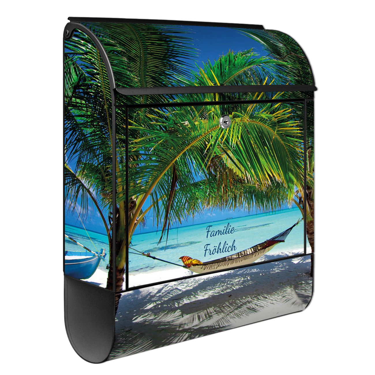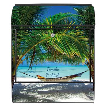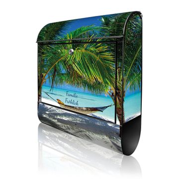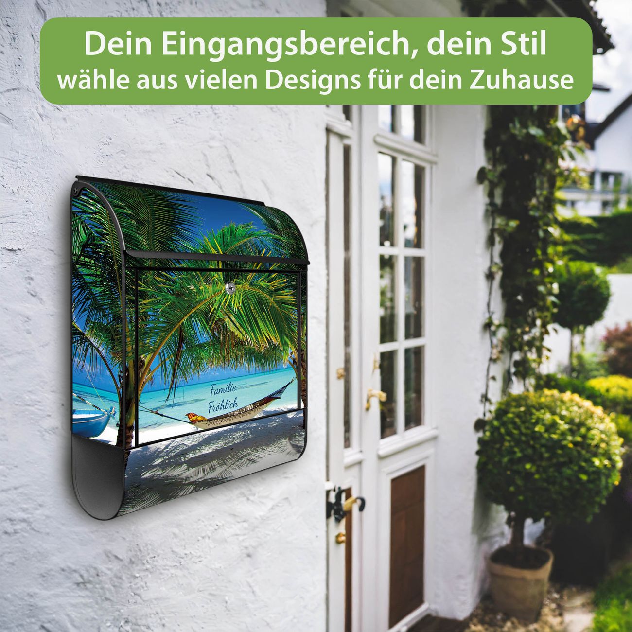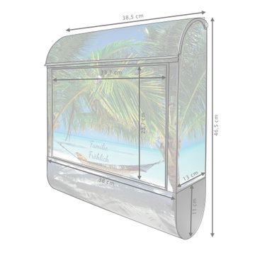 DESIGN: Der Postkasten mit Motiv Motiv Strand hat ein sehr ansprechendes und ausgefallenes Design, damit entlocken Sie Ihren Nachbarn und dem Postboten ein Lächeln. Heben Sie Sich von der tristen grauen Masse ab, ohne auf Funktionalität zu verzichten. DETAILS: Der Postkasten besteht aus pulverbeschichtetem Stahl. Er ist 38x46x12,5cm groß. Das Motiv besteht aus einer wetter- und UV-resistenten Folie, die mit einem Schutzlaminat überzogen ist, sodass der Briefkasten zusätzlich vor Kratzern geschützt ist. Der Briefkasten wird mit Montagematerial, zusätzlich zwei Schlüssel sowie einer Bohrschablone geliefert. NUTZEN: Sie können diesen Briefkasten sowohl als Wandbriefkasten montieren oder einen passenden Ständer kaufen und als Standbriefkasten einbetonieren. Die Größe bietet genügend Platz für Sendungen aller Art, der Einwurf fasst auch größere A4 Sendungen. BANJADO: Ihr Briefkasten wird in Sachsen in einer kleinen Manufaktur von Hand veredelt. Die Motivfolie ist lösungsmittelfrei und schutzlaminiert für einen langen Halt. Wir legen großen Wert auf die Verbindung von Funktionalität und Design. Sie erhalten Handarbeit aus Sachsen.