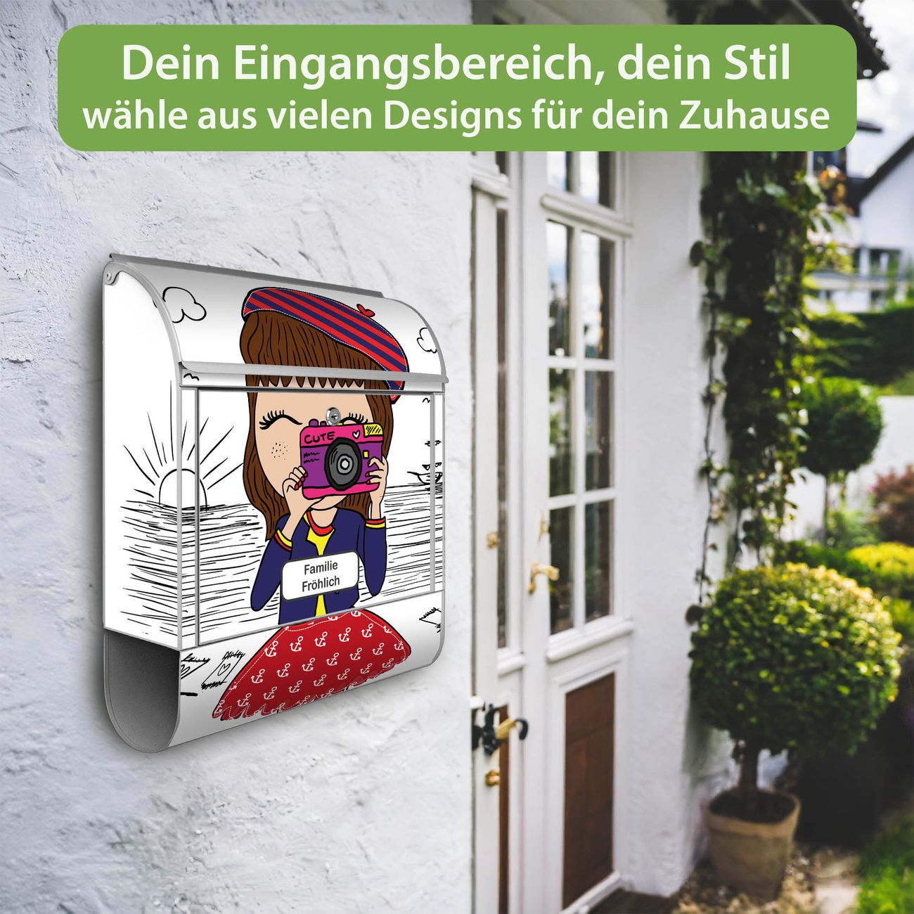 DESIGN: Der Postkasten mit Motiv Motiv Süße Kamera hat ein sehr ansprechendes und ausgefallenes Design, damit entlocken Sie Ihren Nachbarn und dem Postboten ein Lächeln. Heben Sie Sich von der tristen grauen Masse ab, ohne auf Funktionalität zu verzichten. DETAILS: Der Postkasten besteht aus pulverbeschichtetem Stahl. Er ist 38x46x12,5cm groß. Das Motiv besteht aus einer wetter- und UV-resistenten Folie, die mit einem Schutzlaminat überzogen ist, sodass der Briefkasten zusätzlich vor Kratzern geschützt ist. Der Briefkasten wird mit Montagematerial, zusätzlich zwei Schlüssel sowie einer Bohrschablone geliefert. NUTZEN: Sie können diesen Briefkasten sowohl als Wandbriefkasten montieren oder einen passenden Ständer kaufen und als Standbriefkasten einbetonieren. Die Größe bietet genügend Platz für Sendungen aller Art, der Einwurf fasst auch größere A4 Sendungen. BANJADO: Ihr Briefkasten wird in Sachsen in einer kleinen Manufaktur von Hand veredelt. Die Motivfolie ist lösungsmittelfrei und schutzlaminiert für einen langen Halt. Wir legen großen Wert auf die Verbindung von Funktionalität und Design. Sie erhalten Handarbeit aus Sachsen.