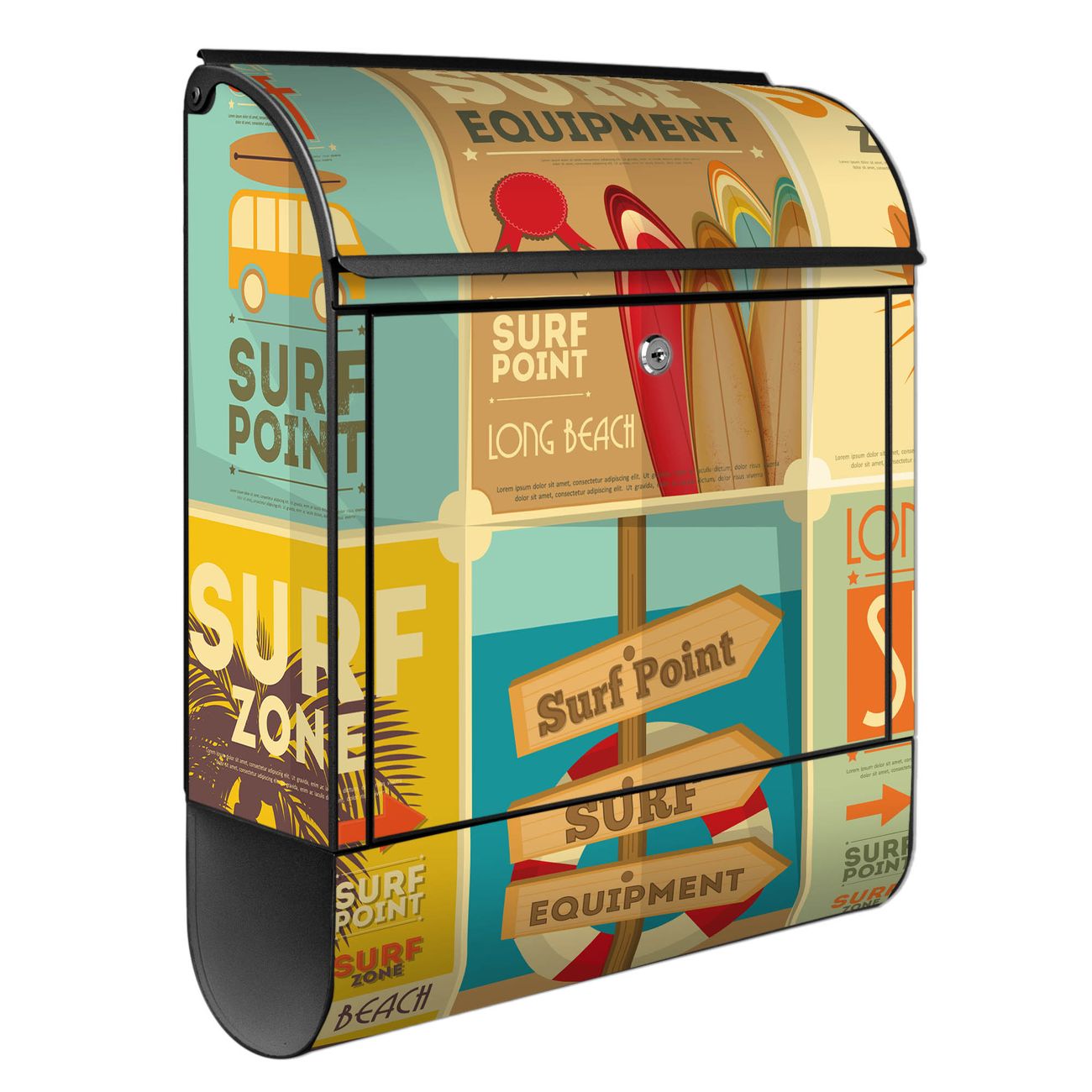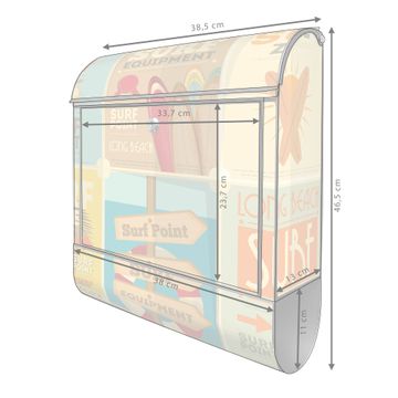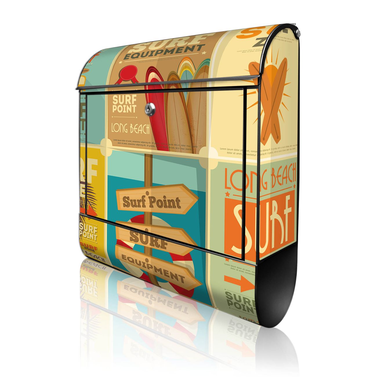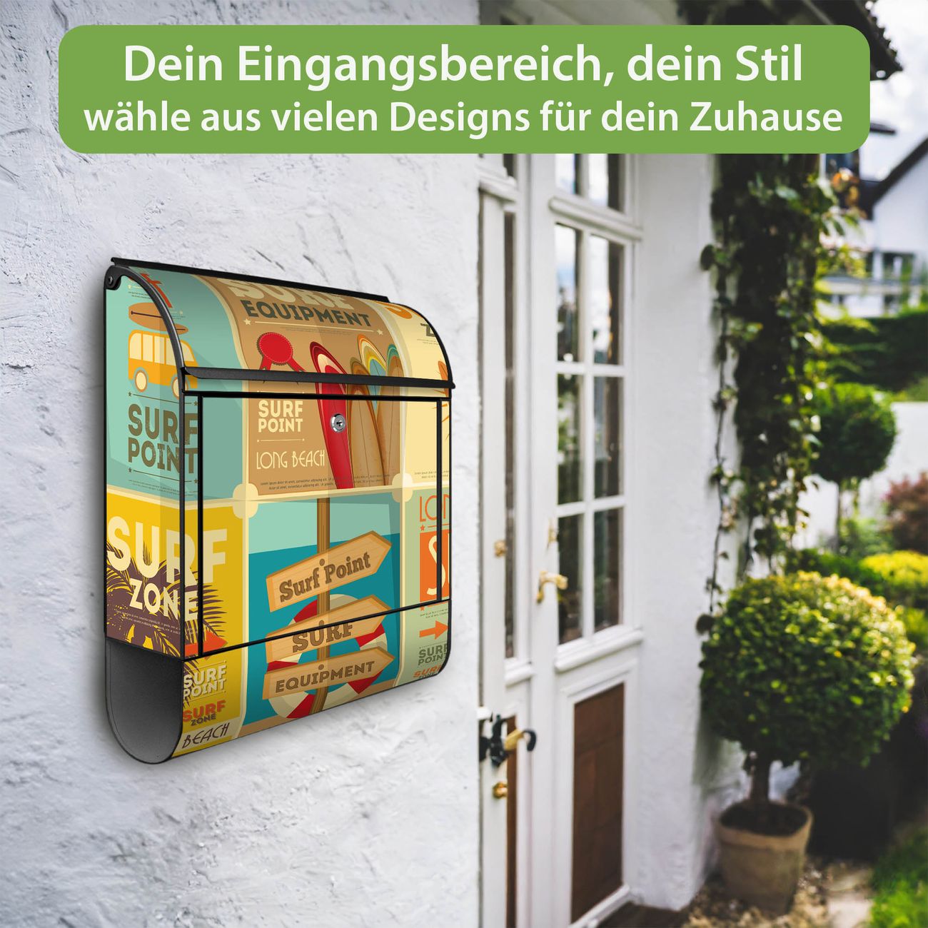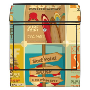 DESIGN: Der Postkasten mit Motiv Motiv Surf Point hat ein sehr ansprechendes und ausgefallenes Design, damit entlocken Sie Ihren Nachbarn und dem Postboten ein Lächeln. Heben Sie Sich von der tristen grauen Masse ab, ohne auf Funktionalität zu verzichten. DETAILS: Der Postkasten besteht aus pulverbeschichtetem Stahl. Er ist 38x46x12,5cm groß. Das Motiv besteht aus einer wetter- und UV-resistenten Folie, die mit einem Schutzlaminat überzogen ist, sodass der Briefkasten zusätzlich vor Kratzern geschützt ist. Der Briefkasten wird mit Montagematerial, zusätzlich zwei Schlüssel sowie einer Bohrschablone geliefert. NUTZEN: Sie können diesen Briefkasten sowohl als Wandbriefkasten montieren oder einen passenden Ständer kaufen und als Standbriefkasten einbetonieren. Die Größe bietet genügend Platz für Sendungen aller Art, der Einwurf fasst auch größere A4 Sendungen. BANJADO: Ihr Briefkasten wird in Sachsen in einer kleinen Manufaktur von Hand veredelt. Die Motivfolie ist lösungsmittelfrei und schutzlaminiert für einen langen Halt. Wir legen großen Wert auf die Verbindung von Funktionalität und Design. Sie erhalten Handarbeit aus Sachsen.