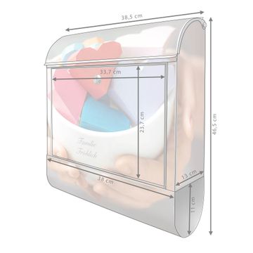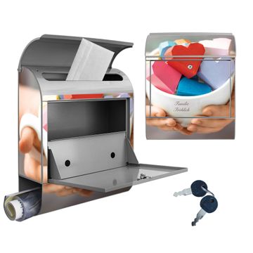 DESIGN: Der Postkasten mit Motiv Motiv Tasse voller Herzen hat ein sehr ansprechendes und ausgefallenes Design, damit entlocken Sie Ihren Nachbarn und dem Postboten ein Lächeln. Heben Sie Sich von der tristen grauen Masse ab, ohne auf Funktionalität zu verzichten. DETAILS: Der Postkasten besteht aus pulverbeschichtetem Stahl. Er ist 38x46x12,5cm groß. Das Motiv besteht aus einer wetter- und UV-resistenten Folie, die mit einem Schutzlaminat überzogen ist, sodass der Briefkasten zusätzlich vor Kratzern geschützt ist. Der Briefkasten wird mit Montagematerial, zusätzlich zwei Schlüssel sowie einer Bohrschablone geliefert. NUTZEN: Sie können diesen Briefkasten sowohl als Wandbriefkasten montieren oder einen passenden Ständer kaufen und als Standbriefkasten einbetonieren. Die Größe bietet genügend Platz für Sendungen aller Art, der Einwurf fasst auch größere A4 Sendungen. BANJADO: Ihr Briefkasten wird in Sachsen in einer kleinen Manufaktur von Hand veredelt. Die Motivfolie ist lösungsmittelfrei und schutzlaminiert für einen langen Halt. Wir legen großen Wert auf die Verbindung von Funktionalität und Design. Sie erhalten Handarbeit aus Sachsen.