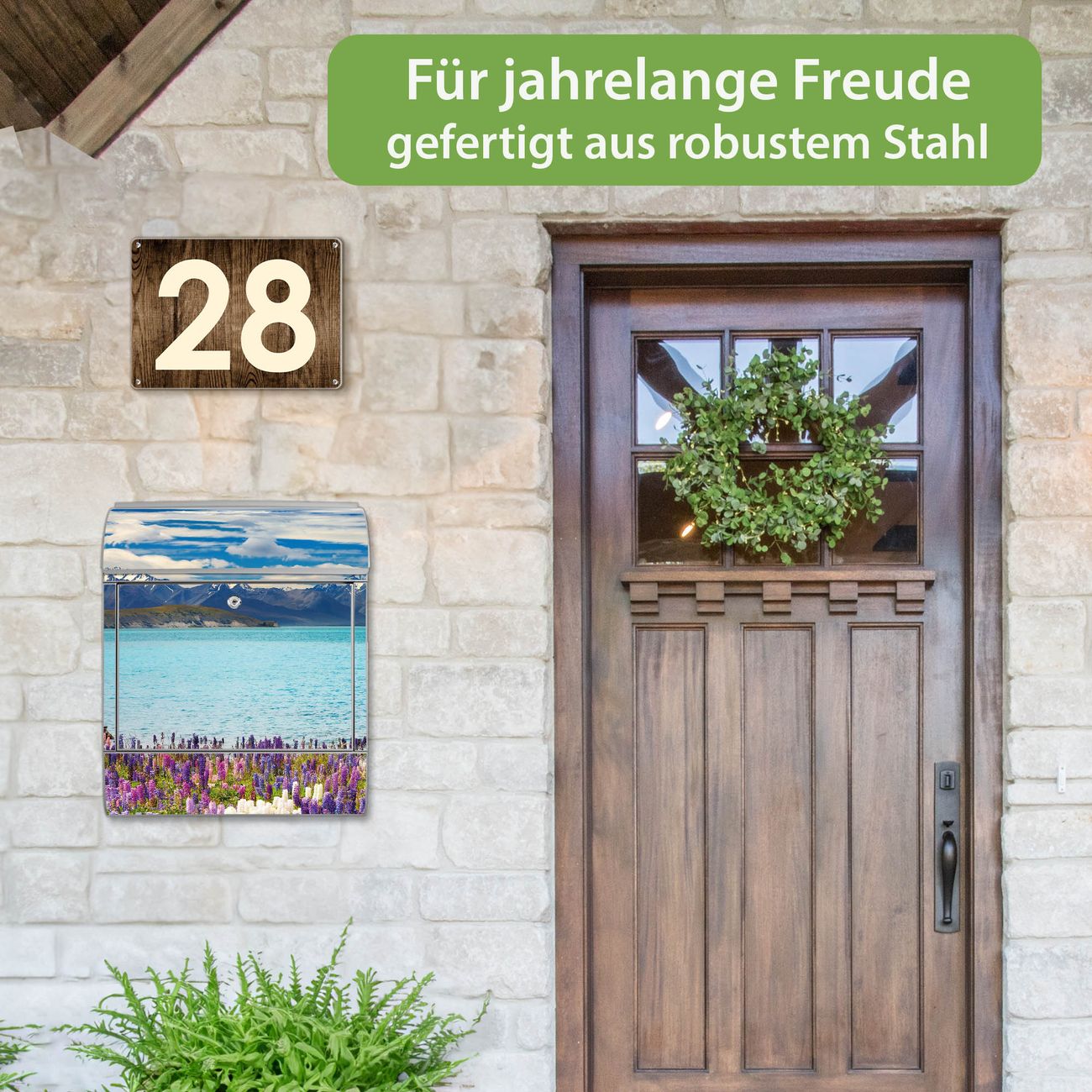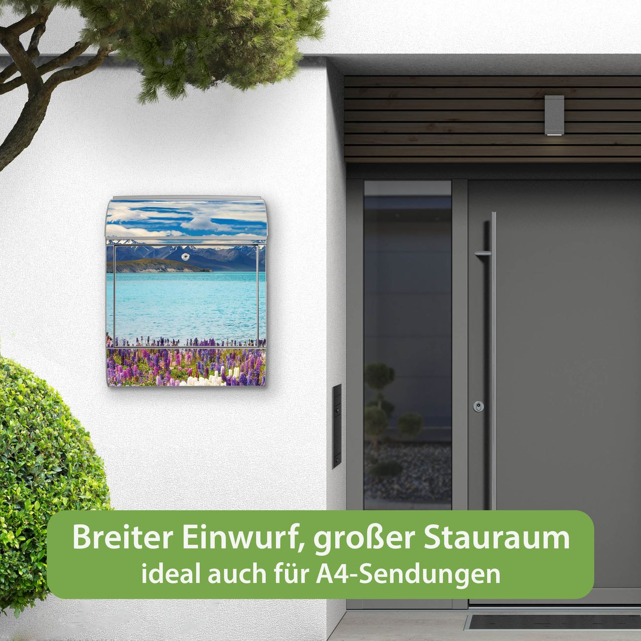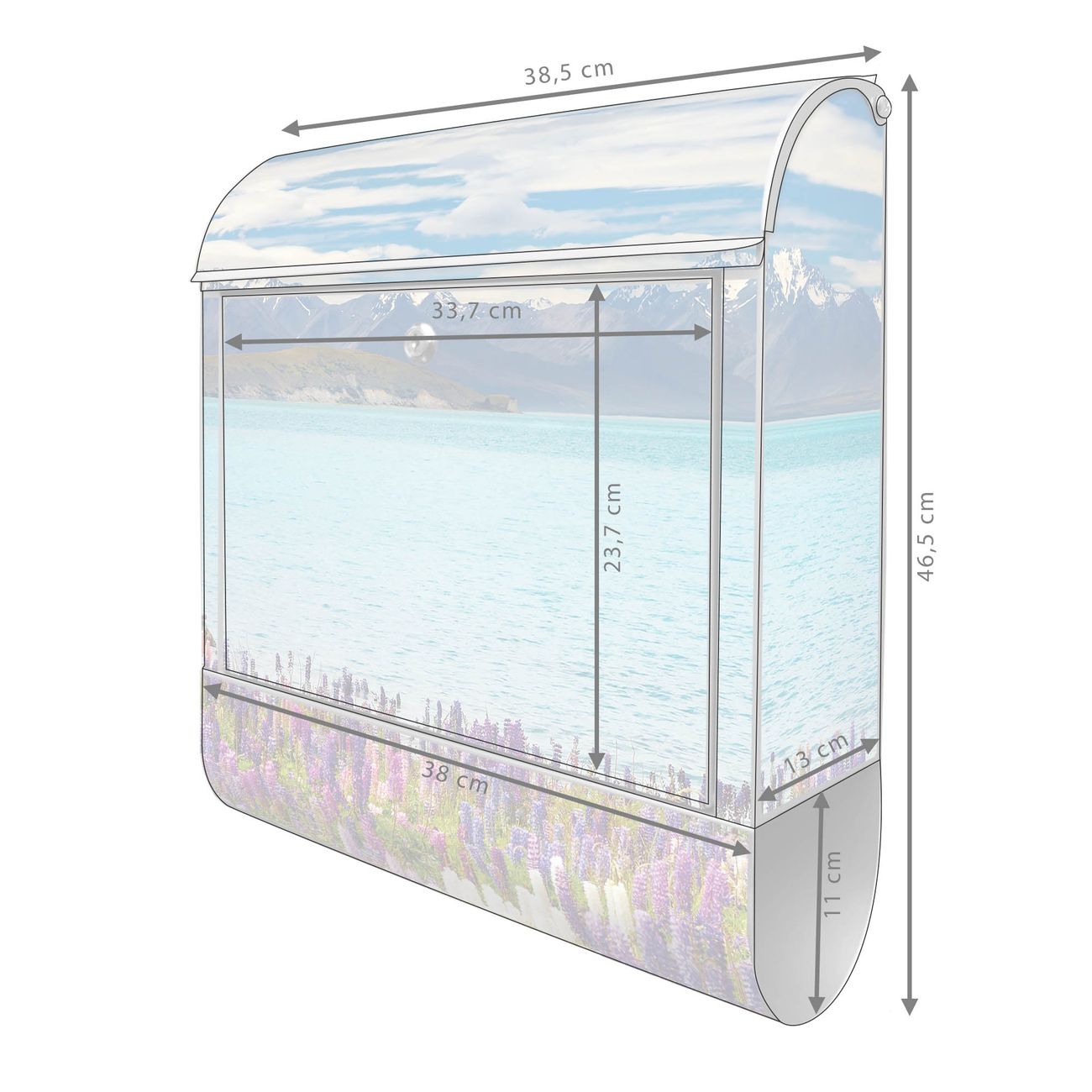 DESIGN: Der Postkasten mit Motiv Motiv Tekapo See hat ein sehr ansprechendes und ausgefallenes Design, damit entlocken Sie Ihren Nachbarn und dem Postboten ein Lächeln. Heben Sie Sich von der tristen grauen Masse ab, ohne auf Funktionalität zu verzichten. DETAILS: Der Postkasten besteht aus pulverbeschichtetem Stahl. Er ist 38x46x12,5cm groß. Das Motiv besteht aus einer wetter- und UV-resistenten Folie, die mit einem Schutzlaminat überzogen ist, sodass der Briefkasten zusätzlich vor Kratzern geschützt ist. Der Briefkasten wird mit Montagematerial, zusätzlich zwei Schlüssel sowie einer Bohrschablone geliefert. NUTZEN: Sie können diesen Briefkasten sowohl als Wandbriefkasten montieren oder einen passenden Ständer kaufen und als Standbriefkasten einbetonieren. Die Größe bietet genügend Platz für Sendungen aller Art, der Einwurf fasst auch größere A4 Sendungen. BANJADO: Ihr Briefkasten wird in Sachsen in einer kleinen Manufaktur von Hand veredelt. Die Motivfolie ist lösungsmittelfrei und schutzlaminiert für einen langen Halt. Wir legen großen Wert auf die Verbindung von Funktionalität und Design. Sie erhalten Handarbeit aus Sachsen.