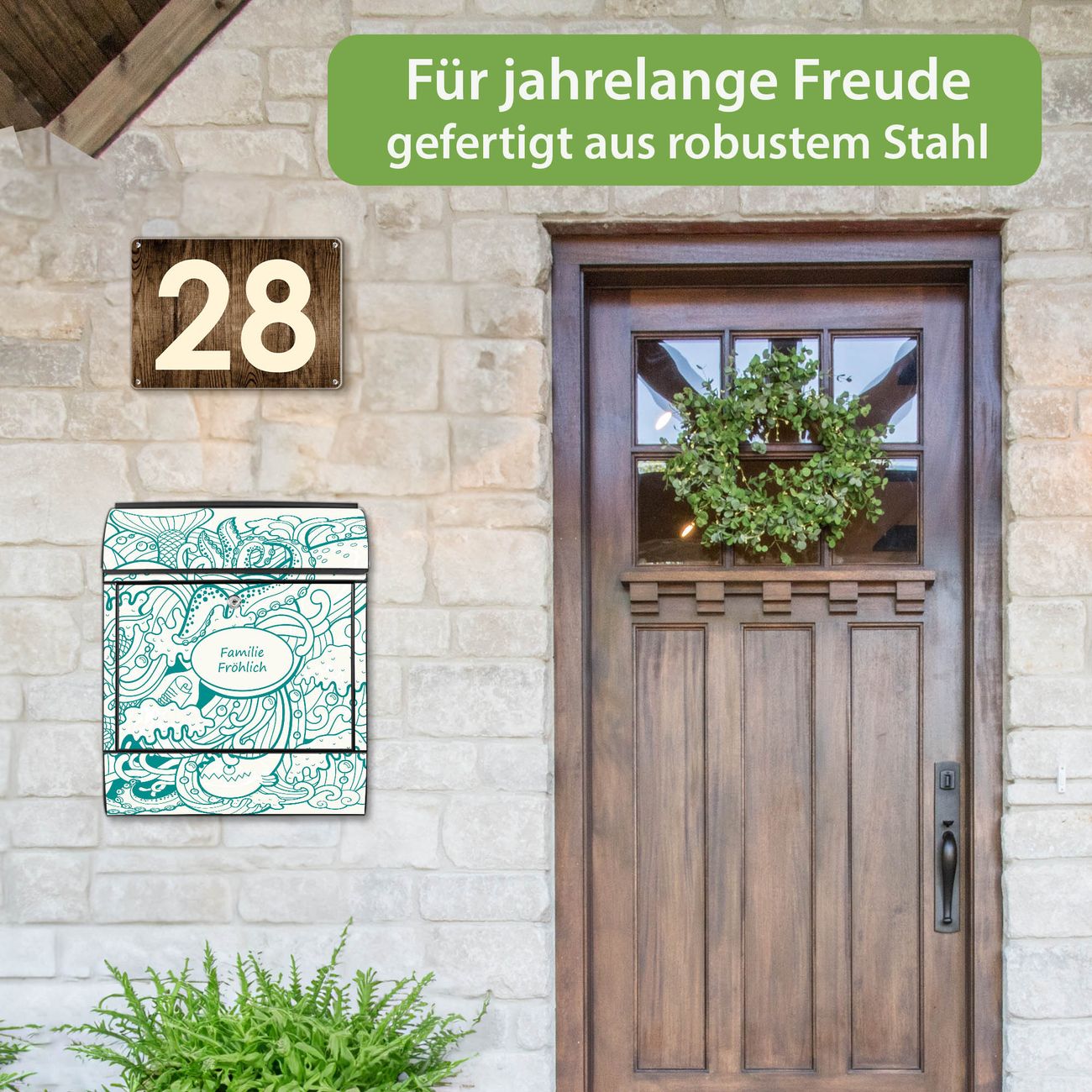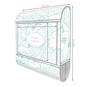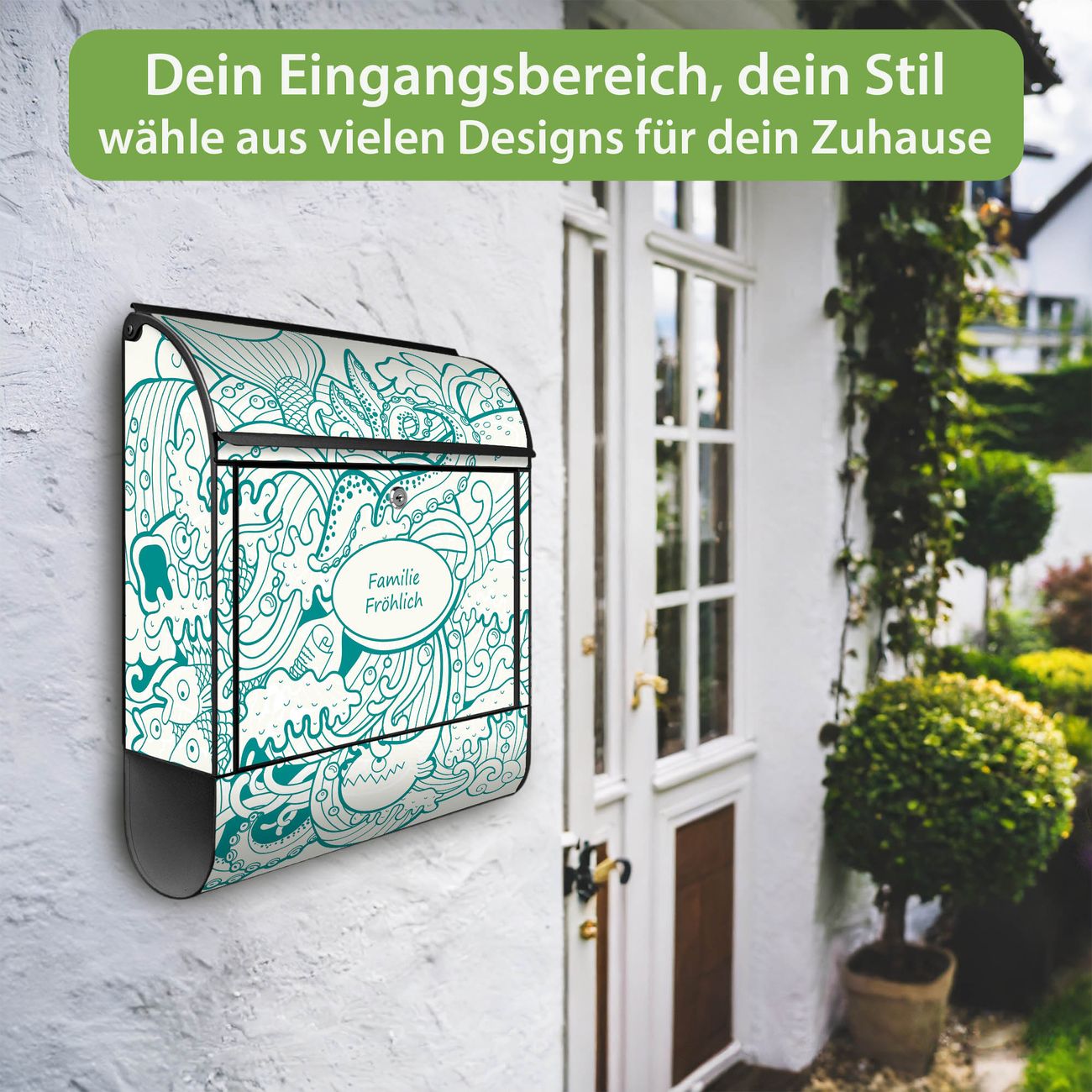 DESIGN: Der Postkasten mit Motiv Motiv Tiefsee hat ein sehr ansprechendes und ausgefallenes Design, damit entlocken Sie Ihren Nachbarn und dem Postboten ein Lächeln. Heben Sie Sich von der tristen grauen Masse ab, ohne auf Funktionalität zu verzichten. DETAILS: Der Postkasten besteht aus pulverbeschichtetem Stahl. Er ist 38x46x12,5cm groß. Das Motiv besteht aus einer wetter- und UV-resistenten Folie, die mit einem Schutzlaminat überzogen ist, sodass der Briefkasten zusätzlich vor Kratzern geschützt ist. Der Briefkasten wird mit Montagematerial, zusätzlich zwei Schlüssel sowie einer Bohrschablone geliefert. NUTZEN: Sie können diesen Briefkasten sowohl als Wandbriefkasten montieren oder einen passenden Ständer kaufen und als Standbriefkasten einbetonieren. Die Größe bietet genügend Platz für Sendungen aller Art, der Einwurf fasst auch größere A4 Sendungen. BANJADO: Ihr Briefkasten wird in Sachsen in einer kleinen Manufaktur von Hand veredelt. Die Motivfolie ist lösungsmittelfrei und schutzlaminiert für einen langen Halt. Wir legen großen Wert auf die Verbindung von Funktionalität und Design. Sie erhalten Handarbeit aus Sachsen.