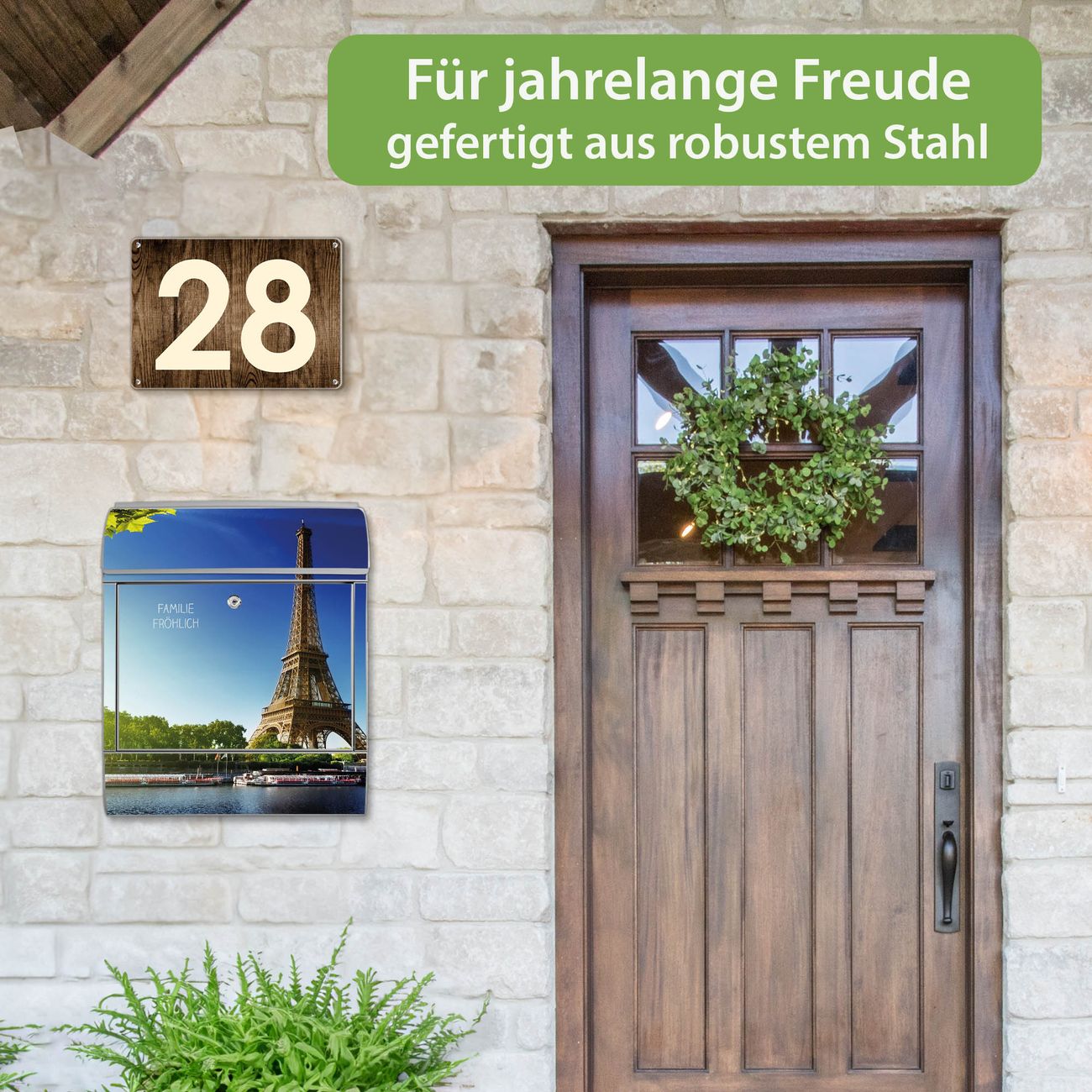 DESIGN: Der Postkasten mit Motiv Motiv Tour Eiffel hat ein sehr ansprechendes und ausgefallenes Design, damit entlocken Sie Ihren Nachbarn und dem Postboten ein Lächeln. Heben Sie Sich von der tristen grauen Masse ab, ohne auf Funktionalität zu verzichten. DETAILS: Der Postkasten besteht aus pulverbeschichtetem Stahl. Er ist 38x46x12,5cm groß. Das Motiv besteht aus einer wetter- und UV-resistenten Folie, die mit einem Schutzlaminat überzogen ist, sodass der Briefkasten zusätzlich vor Kratzern geschützt ist. Der Briefkasten wird mit Montagematerial, zusätzlich zwei Schlüssel sowie einer Bohrschablone geliefert. NUTZEN: Sie können diesen Briefkasten sowohl als Wandbriefkasten montieren oder einen passenden Ständer kaufen und als Standbriefkasten einbetonieren. Die Größe bietet genügend Platz für Sendungen aller Art, der Einwurf fasst auch größere A4 Sendungen. BANJADO: Ihr Briefkasten wird in Sachsen in einer kleinen Manufaktur von Hand veredelt. Die Motivfolie ist lösungsmittelfrei und schutzlaminiert für einen langen Halt. Wir legen großen Wert auf die Verbindung von Funktionalität und Design. Sie erhalten Handarbeit aus Sachsen.