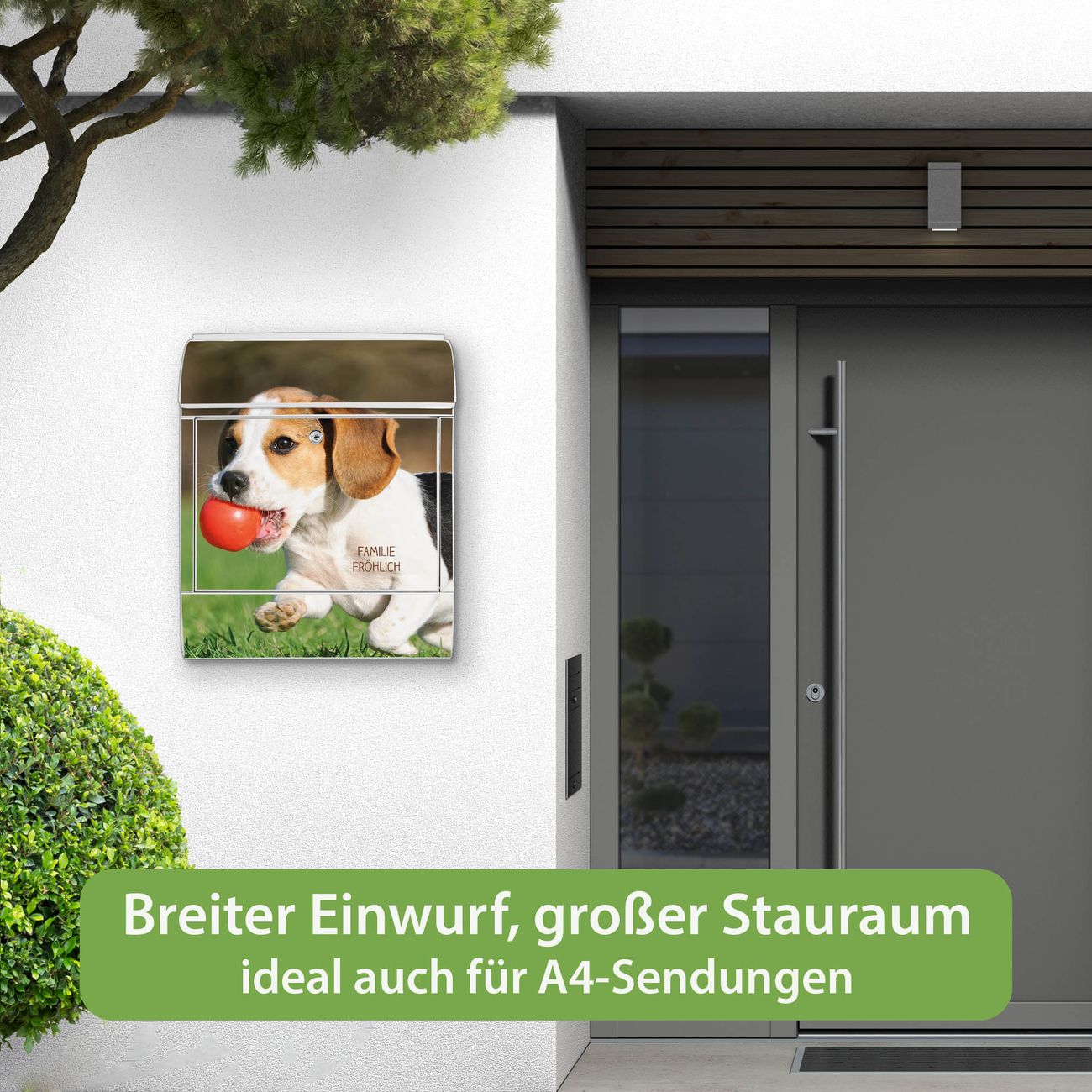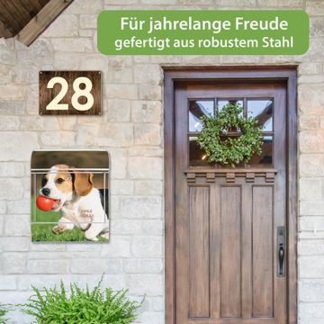 DESIGN: Der Postkasten mit Motiv Motiv Trixi hat ein sehr ansprechendes und ausgefallenes Design, damit entlocken Sie Ihren Nachbarn und dem Postboten ein Lächeln. Heben Sie Sich von der tristen grauen Masse ab, ohne auf Funktionalität zu verzichten. DETAILS: Der Postkasten besteht aus pulverbeschichtetem Stahl. Er ist 38x46x12,5cm groß. Das Motiv besteht aus einer wetter- und UV-resistenten Folie, die mit einem Schutzlaminat überzogen ist, sodass der Briefkasten zusätzlich vor Kratzern geschützt ist. Der Briefkasten wird mit Montagematerial, zusätzlich zwei Schlüssel sowie einer Bohrschablone geliefert. NUTZEN: Sie können diesen Briefkasten sowohl als Wandbriefkasten montieren oder einen passenden Ständer kaufen und als Standbriefkasten einbetonieren. Die Größe bietet genügend Platz für Sendungen aller Art, der Einwurf fasst auch größere A4 Sendungen. BANJADO: Ihr Briefkasten wird in Sachsen in einer kleinen Manufaktur von Hand veredelt. Die Motivfolie ist lösungsmittelfrei und schutzlaminiert für einen langen Halt. Wir legen großen Wert auf die Verbindung von Funktionalität und Design. Sie erhalten Handarbeit aus Sachsen.