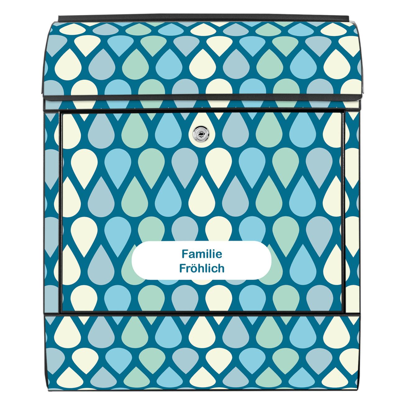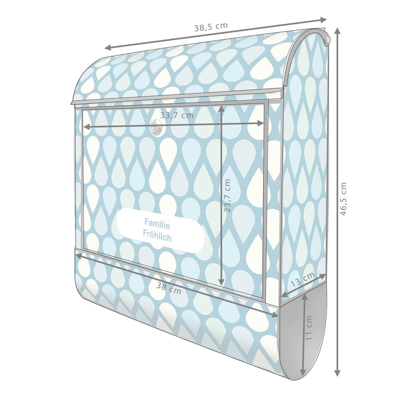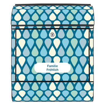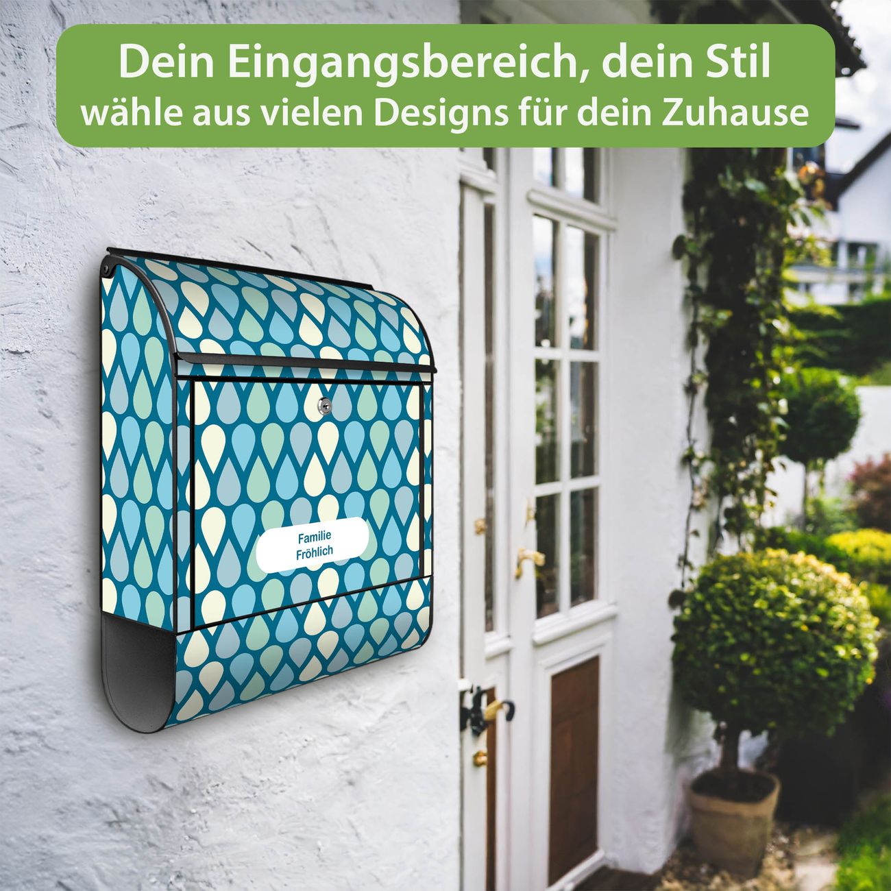 DESIGN: Der Postkasten mit Motiv Motiv Tropfen hat ein sehr ansprechendes und ausgefallenes Design, damit entlocken Sie Ihren Nachbarn und dem Postboten ein Lächeln. Heben Sie Sich von der tristen grauen Masse ab, ohne auf Funktionalität zu verzichten. DETAILS: Der Postkasten besteht aus pulverbeschichtetem Stahl. Er ist 38x46x12,5cm groß. Das Motiv besteht aus einer wetter- und UV-resistenten Folie, die mit einem Schutzlaminat überzogen ist, sodass der Briefkasten zusätzlich vor Kratzern geschützt ist. Der Briefkasten wird mit Montagematerial, zusätzlich zwei Schlüssel sowie einer Bohrschablone geliefert. NUTZEN: Sie können diesen Briefkasten sowohl als Wandbriefkasten montieren oder einen passenden Ständer kaufen und als Standbriefkasten einbetonieren. Die Größe bietet genügend Platz für Sendungen aller Art, der Einwurf fasst auch größere A4 Sendungen. BANJADO: Ihr Briefkasten wird in Sachsen in einer kleinen Manufaktur von Hand veredelt. Die Motivfolie ist lösungsmittelfrei und schutzlaminiert für einen langen Halt. Wir legen großen Wert auf die Verbindung von Funktionalität und Design. Sie erhalten Handarbeit aus Sachsen.