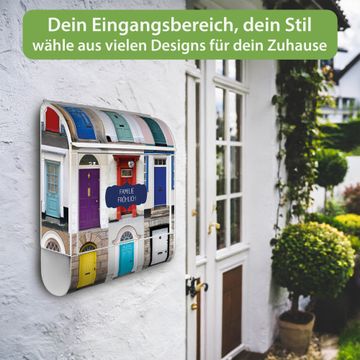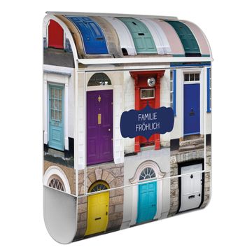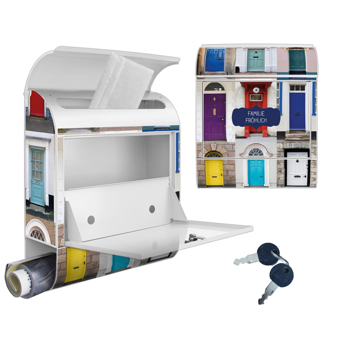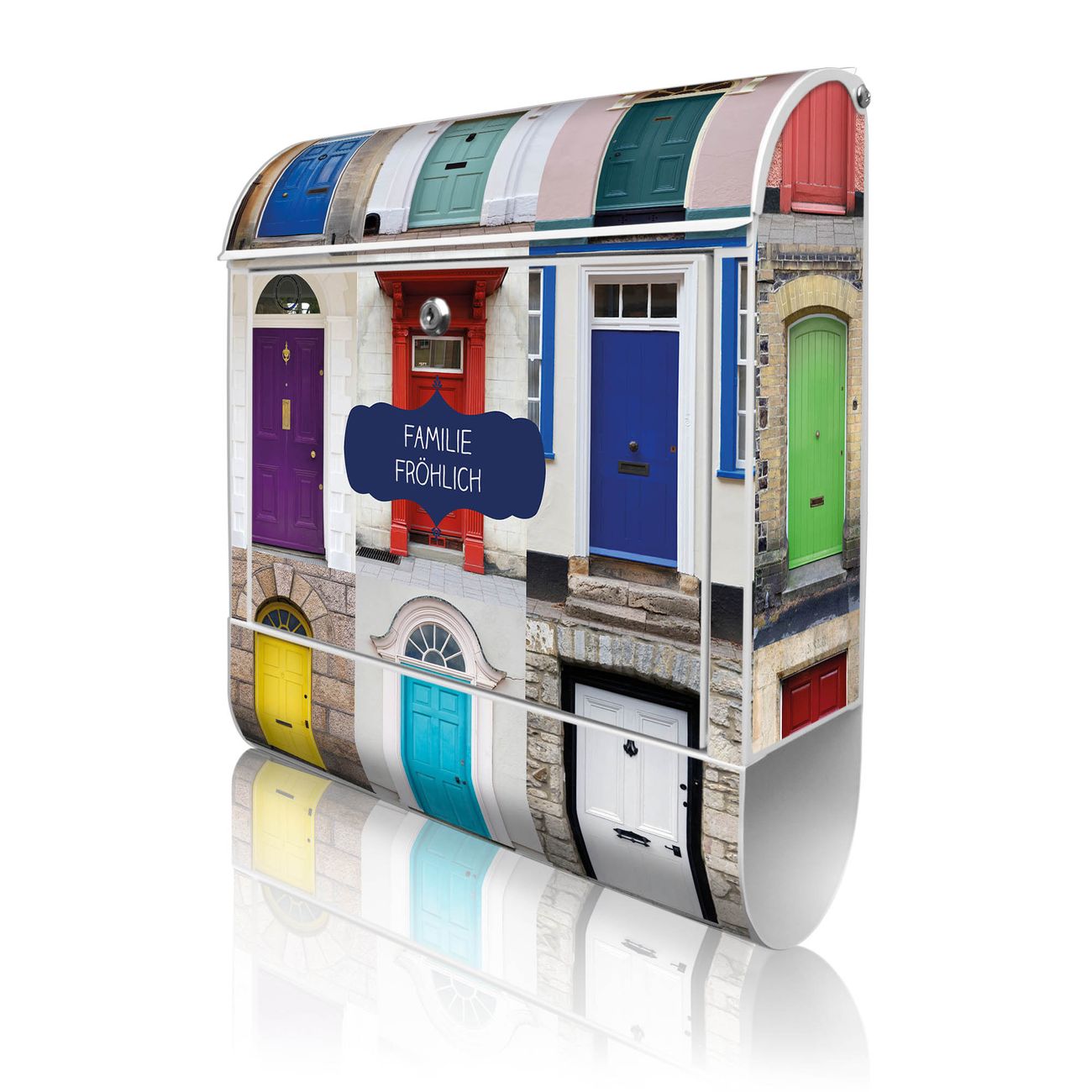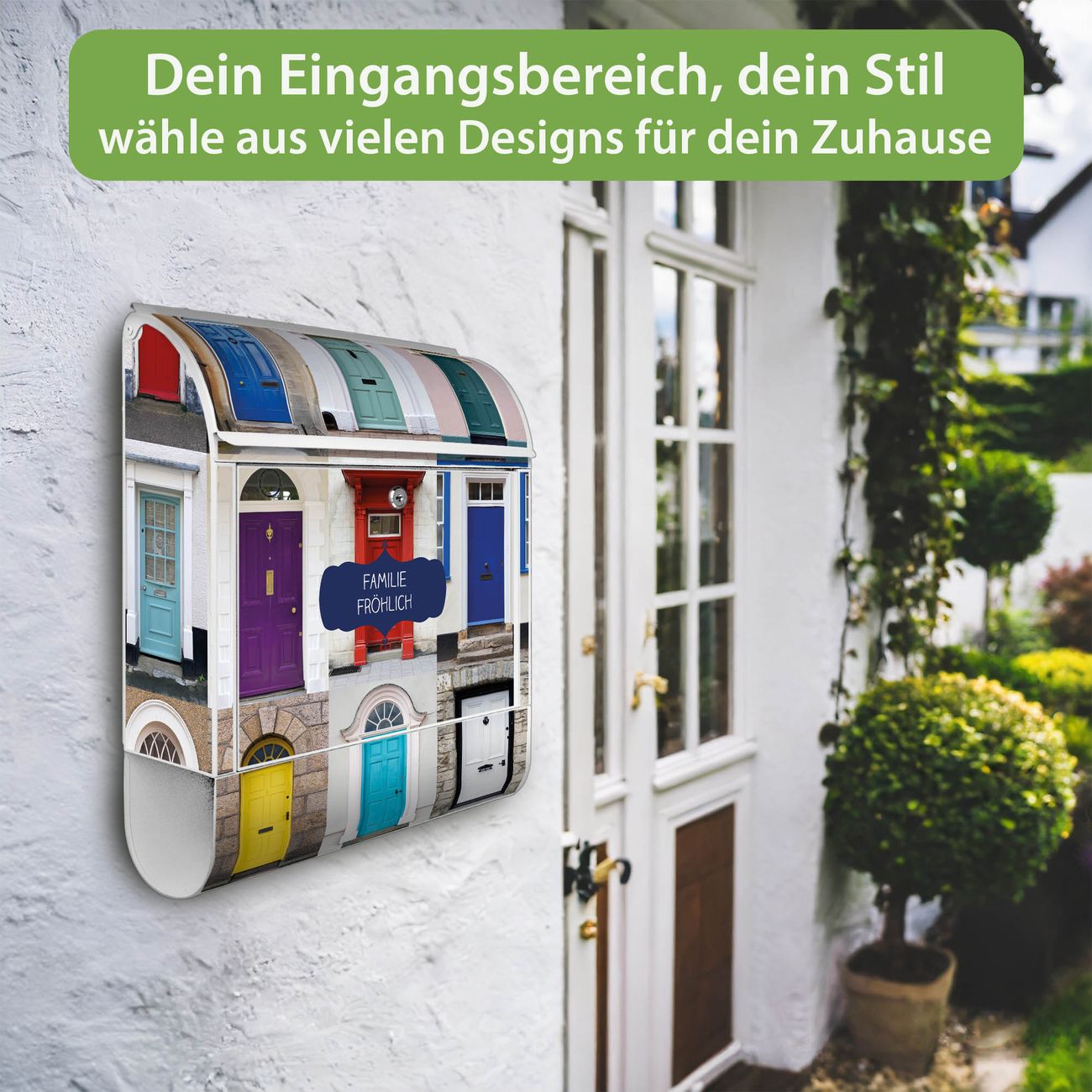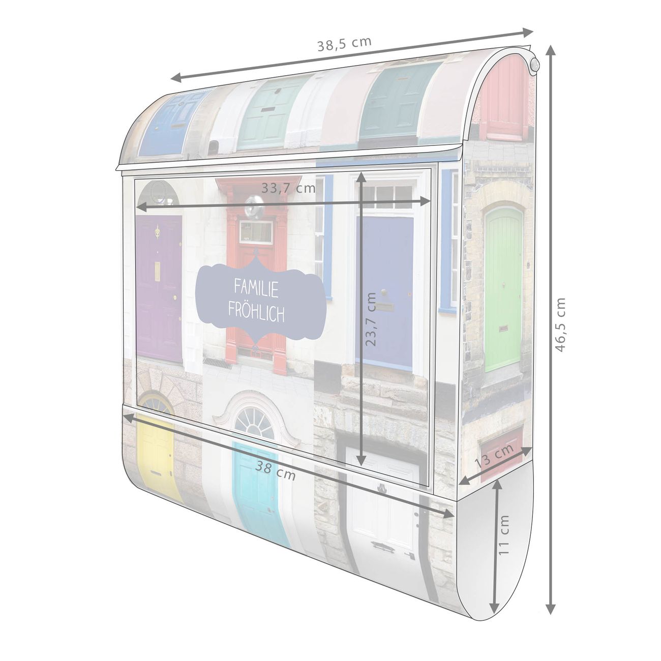 DESIGN: Der Postkasten mit Motiv Motiv Türen hat ein sehr ansprechendes und ausgefallenes Design, damit entlocken Sie Ihren Nachbarn und dem Postboten ein Lächeln. Heben Sie Sich von der tristen grauen Masse ab, ohne auf Funktionalität zu verzichten. DETAILS: Der Postkasten besteht aus pulverbeschichtetem Stahl. Er ist 38x46x12,5cm groß. Das Motiv besteht aus einer wetter- und UV-resistenten Folie, die mit einem Schutzlaminat überzogen ist, sodass der Briefkasten zusätzlich vor Kratzern geschützt ist. Der Briefkasten wird mit Montagematerial, zusätzlich zwei Schlüssel sowie einer Bohrschablone geliefert. NUTZEN: Sie können diesen Briefkasten sowohl als Wandbriefkasten montieren oder einen passenden Ständer kaufen und als Standbriefkasten einbetonieren. Die Größe bietet genügend Platz für Sendungen aller Art, der Einwurf fasst auch größere A4 Sendungen. BANJADO: Ihr Briefkasten wird in Sachsen in einer kleinen Manufaktur von Hand veredelt. Die Motivfolie ist lösungsmittelfrei und schutzlaminiert für einen langen Halt. Wir legen großen Wert auf die Verbindung von Funktionalität und Design. Sie erhalten Handarbeit aus Sachsen.