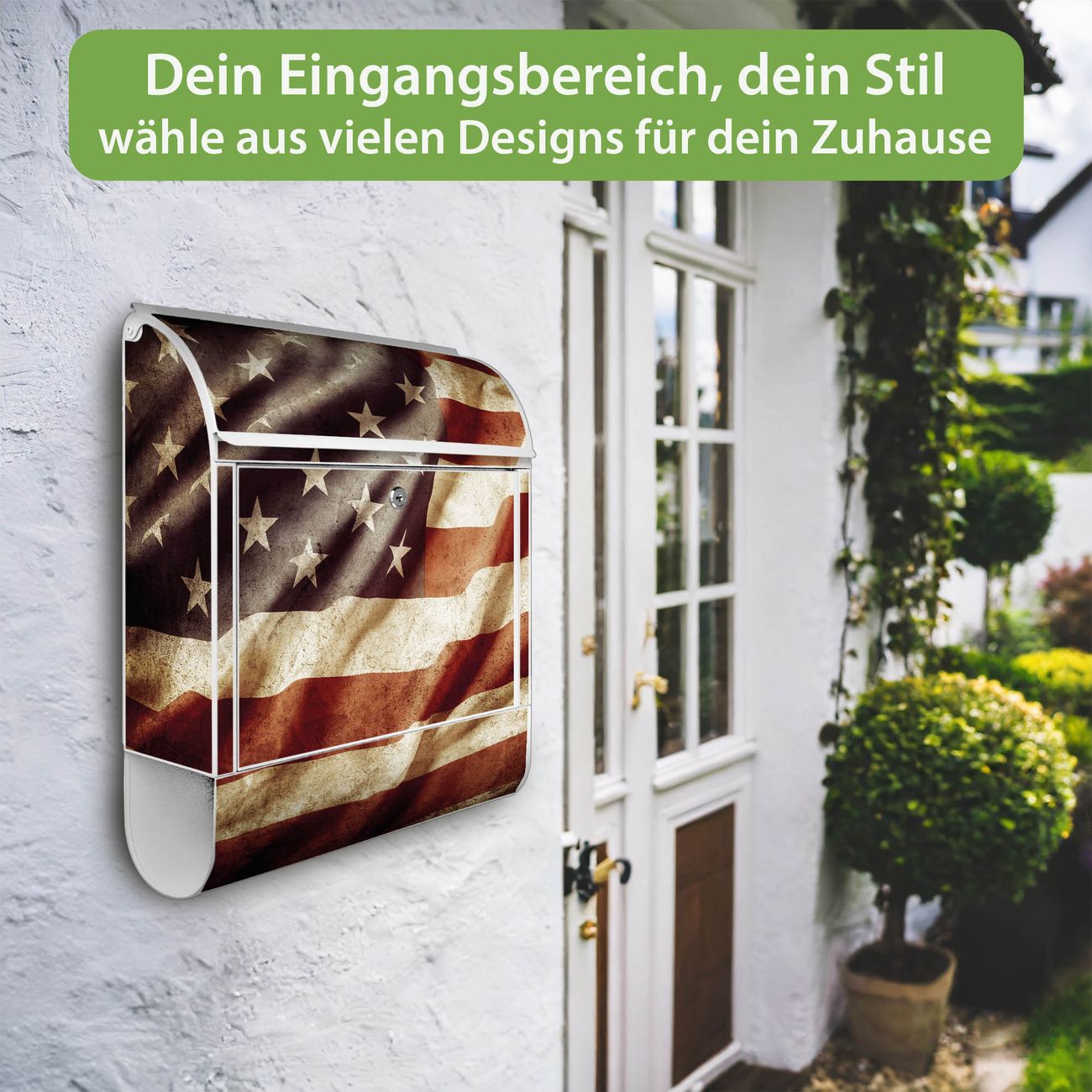 DESIGN: Der Postkasten mit Motiv Motiv United States hat ein sehr ansprechendes und ausgefallenes Design, damit entlocken Sie Ihren Nachbarn und dem Postboten ein Lächeln. Heben Sie Sich von der tristen grauen Masse ab, ohne auf Funktionalität zu verzichten. DETAILS: Der Postkasten besteht aus pulverbeschichtetem Stahl. Er ist 38x46x12,5cm groß. Das Motiv besteht aus einer wetter- und UV-resistenten Folie, die mit einem Schutzlaminat überzogen ist, sodass der Briefkasten zusätzlich vor Kratzern geschützt ist. Der Briefkasten wird mit Montagematerial, zusätzlich zwei Schlüssel sowie einer Bohrschablone geliefert. NUTZEN: Sie können diesen Briefkasten sowohl als Wandbriefkasten montieren oder einen passenden Ständer kaufen und als Standbriefkasten einbetonieren. Die Größe bietet genügend Platz für Sendungen aller Art, der Einwurf fasst auch größere A4 Sendungen. BANJADO: Ihr Briefkasten wird in Sachsen in einer kleinen Manufaktur von Hand veredelt. Die Motivfolie ist lösungsmittelfrei und schutzlaminiert für einen langen Halt. Wir legen großen Wert auf die Verbindung von Funktionalität und Design. Sie erhalten Handarbeit aus Sachsen.