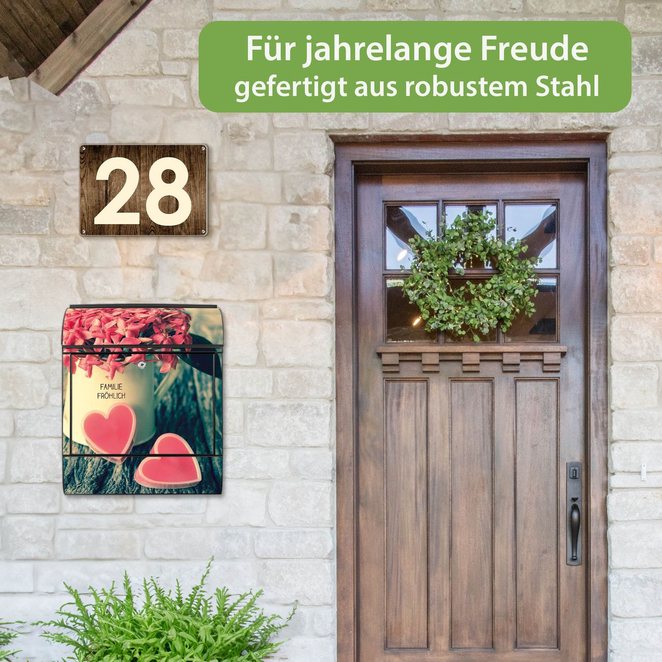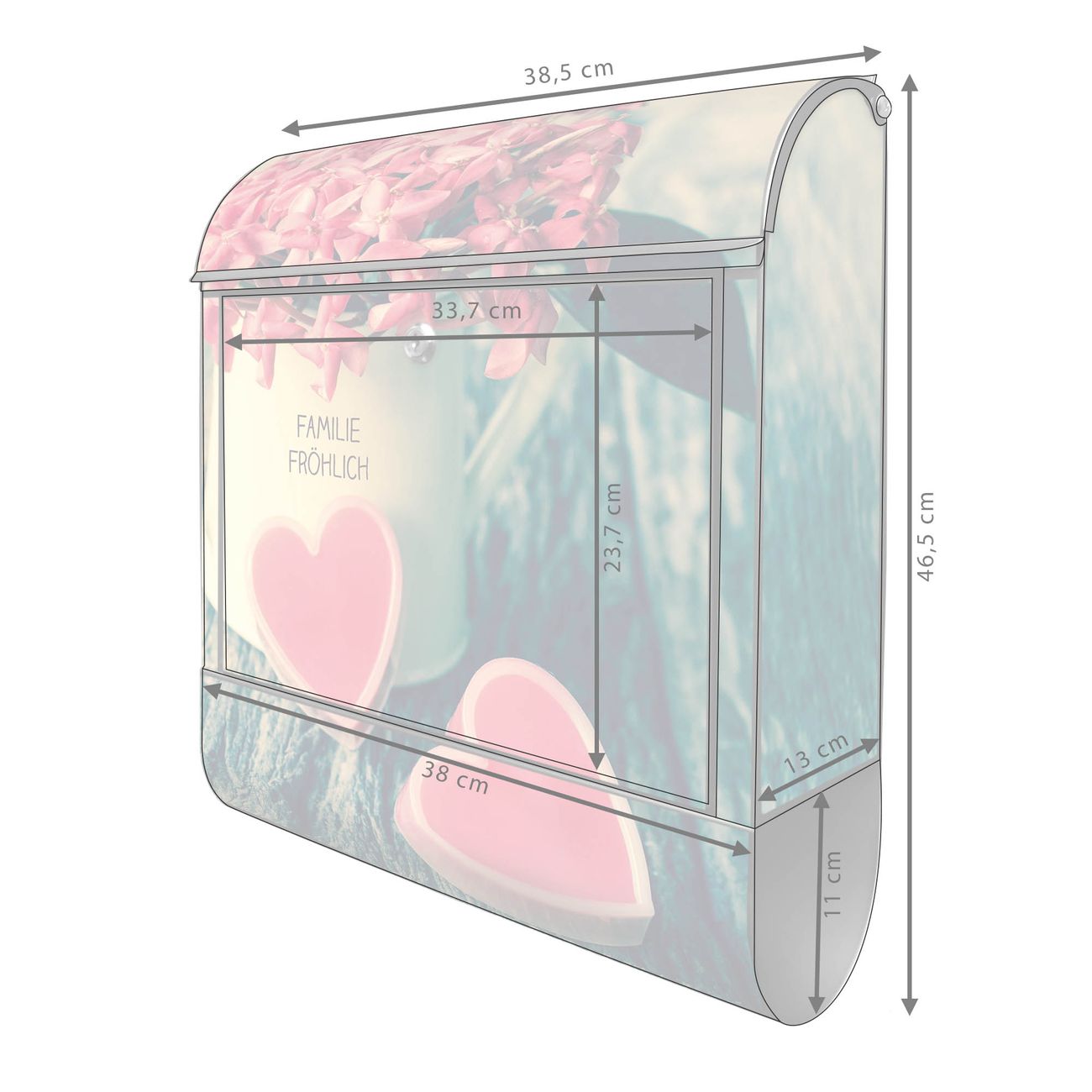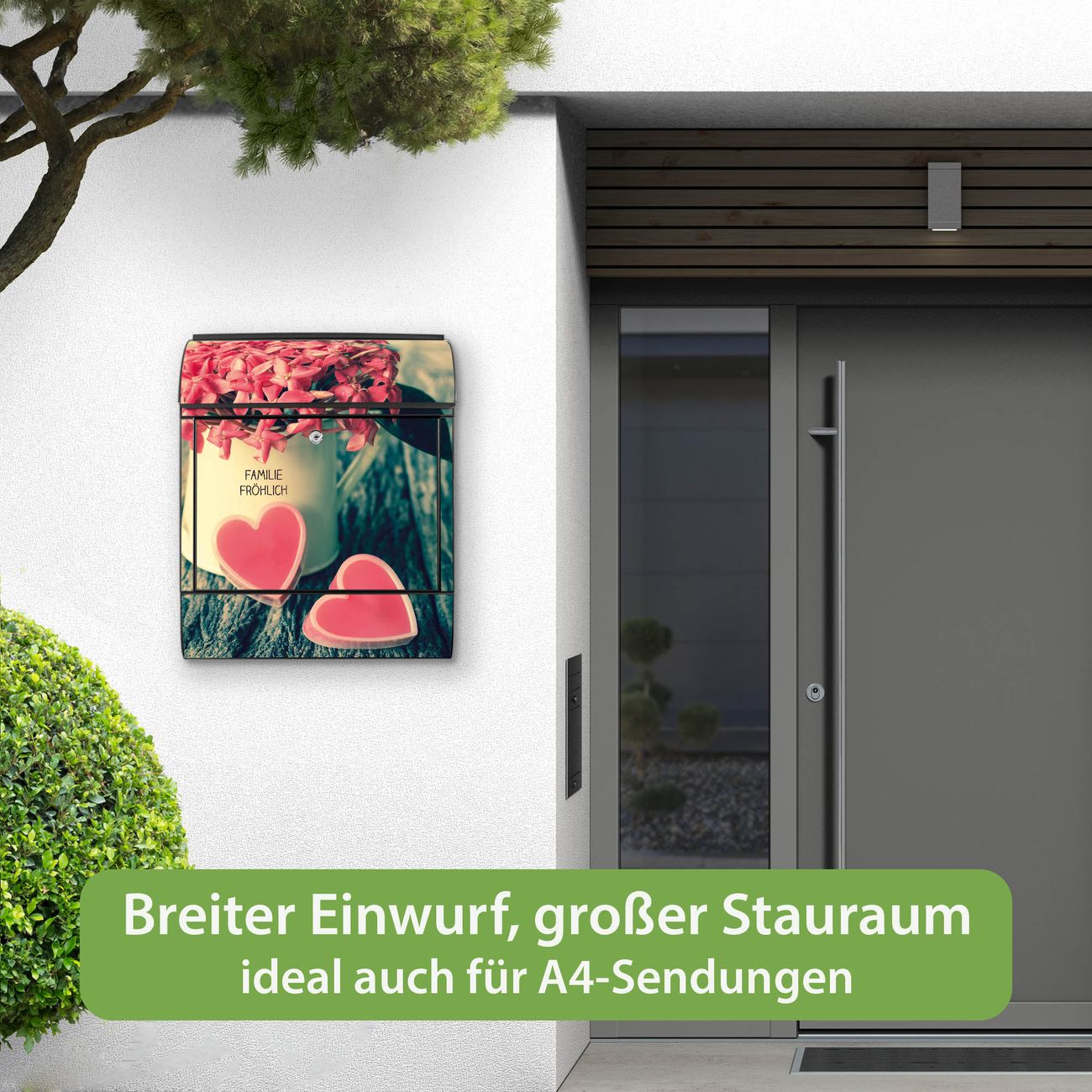 DESIGN: Der Postkasten mit Motiv Motiv Valentin hat ein sehr ansprechendes und ausgefallenes Design, damit entlocken Sie Ihren Nachbarn und dem Postboten ein Lächeln. Heben Sie Sich von der tristen grauen Masse ab, ohne auf Funktionalität zu verzichten. DETAILS: Der Postkasten besteht aus pulverbeschichtetem Stahl. Er ist 38x46x12,5cm groß. Das Motiv besteht aus einer wetter- und UV-resistenten Folie, die mit einem Schutzlaminat überzogen ist, sodass der Briefkasten zusätzlich vor Kratzern geschützt ist. Der Briefkasten wird mit Montagematerial, zusätzlich zwei Schlüssel sowie einer Bohrschablone geliefert. NUTZEN: Sie können diesen Briefkasten sowohl als Wandbriefkasten montieren oder einen passenden Ständer kaufen und als Standbriefkasten einbetonieren. Die Größe bietet genügend Platz für Sendungen aller Art, der Einwurf fasst auch größere A4 Sendungen. BANJADO: Ihr Briefkasten wird in Sachsen in einer kleinen Manufaktur von Hand veredelt. Die Motivfolie ist lösungsmittelfrei und schutzlaminiert für einen langen Halt. Wir legen großen Wert auf die Verbindung von Funktionalität und Design. Sie erhalten Handarbeit aus Sachsen.