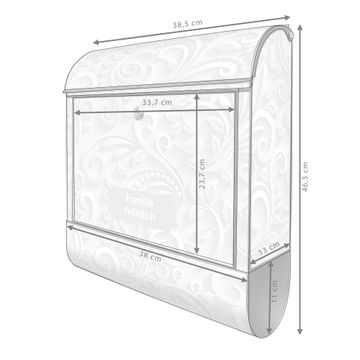 DESIGN: Der Postkasten mit Motiv Motiv White Swirl hat ein sehr ansprechendes und ausgefallenes Design, damit entlocken Sie Ihren Nachbarn und dem Postboten ein Lächeln. Heben Sie Sich von der tristen grauen Masse ab, ohne auf Funktionalität zu verzichten. DETAILS: Der Postkasten besteht aus pulverbeschichtetem Stahl. Er ist 38x46x12,5cm groß. Das Motiv besteht aus einer wetter- und UV-resistenten Folie, die mit einem Schutzlaminat überzogen ist, sodass der Briefkasten zusätzlich vor Kratzern geschützt ist. Der Briefkasten wird mit Montagematerial, zusätzlich zwei Schlüssel sowie einer Bohrschablone geliefert. NUTZEN: Sie können diesen Briefkasten sowohl als Wandbriefkasten montieren oder einen passenden Ständer kaufen und als Standbriefkasten einbetonieren. Die Größe bietet genügend Platz für Sendungen aller Art, der Einwurf fasst auch größere A4 Sendungen. BANJADO: Ihr Briefkasten wird in Sachsen in einer kleinen Manufaktur von Hand veredelt. Die Motivfolie ist lösungsmittelfrei und schutzlaminiert für einen langen Halt. Wir legen großen Wert auf die Verbindung von Funktionalität und Design. Sie erhalten Handarbeit aus Sachsen.