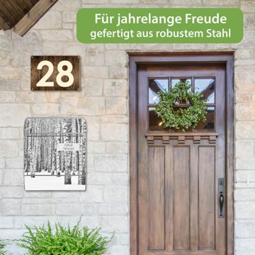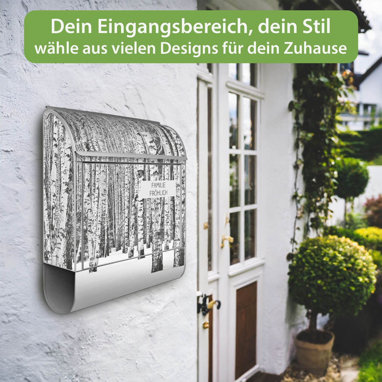 DESIGN: Der Postkasten mit Motiv Motiv Winterlicher Birkenwald hat ein sehr ansprechendes und ausgefallenes Design, damit entlocken Sie Ihren Nachbarn und dem Postboten ein Lächeln. Heben Sie Sich von der tristen grauen Masse ab, ohne auf Funktionalität zu verzichten. DETAILS: Der Postkasten besteht aus pulverbeschichtetem Stahl. Er ist 38x46x12,5cm groß. Das Motiv besteht aus einer wetter- und UV-resistenten Folie, die mit einem Schutzlaminat überzogen ist, sodass der Briefkasten zusätzlich vor Kratzern geschützt ist. Der Briefkasten wird mit Montagematerial, zusätzlich zwei Schlüssel sowie einer Bohrschablone geliefert. NUTZEN: Sie können diesen Briefkasten sowohl als Wandbriefkasten montieren oder einen passenden Ständer kaufen und als Standbriefkasten einbetonieren. Die Größe bietet genügend Platz für Sendungen aller Art, der Einwurf fasst auch größere A4 Sendungen. BANJADO: Ihr Briefkasten wird in Sachsen in einer kleinen Manufaktur von Hand veredelt. Die Motivfolie ist lösungsmittelfrei und schutzlaminiert für einen langen Halt. Wir legen großen Wert auf die Verbindung von Funktionalität und Design. Sie erhalten Handarbeit aus Sachsen.
