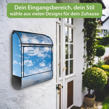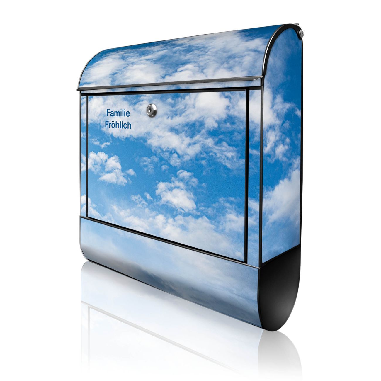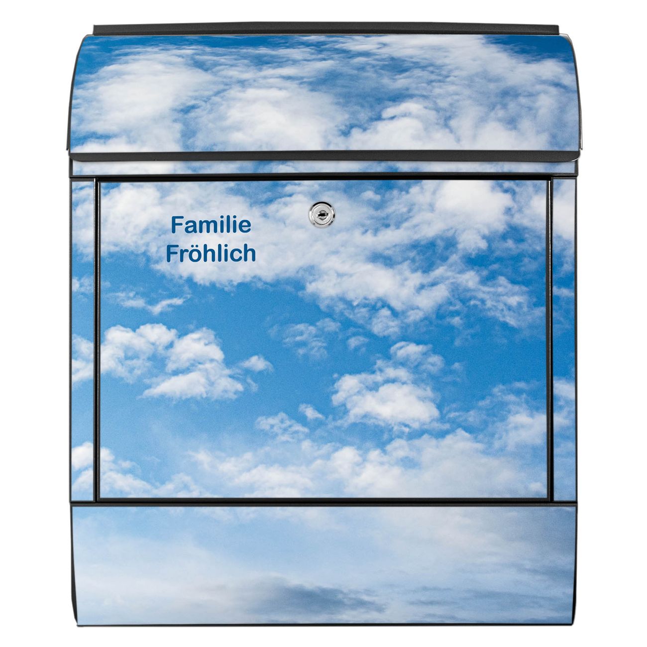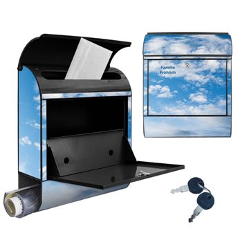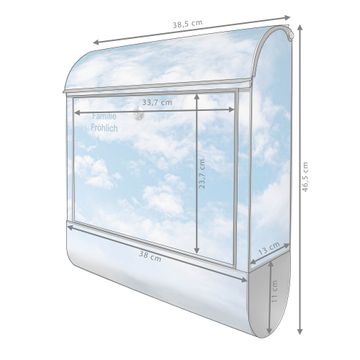 DESIGN: Der Postkasten mit Motiv Motiv Wolken 1 hat ein sehr ansprechendes und ausgefallenes Design, damit entlocken Sie Ihren Nachbarn und dem Postboten ein Lächeln. Heben Sie Sich von der tristen grauen Masse ab, ohne auf Funktionalität zu verzichten. DETAILS: Der Postkasten besteht aus pulverbeschichtetem Stahl. Er ist 38x46x12,5cm groß. Das Motiv besteht aus einer wetter- und UV-resistenten Folie, die mit einem Schutzlaminat überzogen ist, sodass der Briefkasten zusätzlich vor Kratzern geschützt ist. Der Briefkasten wird mit Montagematerial, zusätzlich zwei Schlüssel sowie einer Bohrschablone geliefert. NUTZEN: Sie können diesen Briefkasten sowohl als Wandbriefkasten montieren oder einen passenden Ständer kaufen und als Standbriefkasten einbetonieren. Die Größe bietet genügend Platz für Sendungen aller Art, der Einwurf fasst auch größere A4 Sendungen. BANJADO: Ihr Briefkasten wird in Sachsen in einer kleinen Manufaktur von Hand veredelt. Die Motivfolie ist lösungsmittelfrei und schutzlaminiert für einen langen Halt. Wir legen großen Wert auf die Verbindung von Funktionalität und Design. Sie erhalten Handarbeit aus Sachsen.