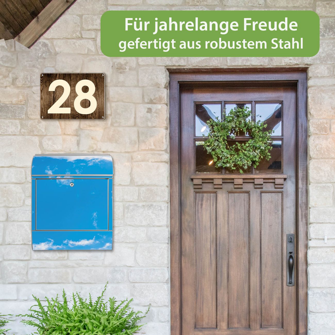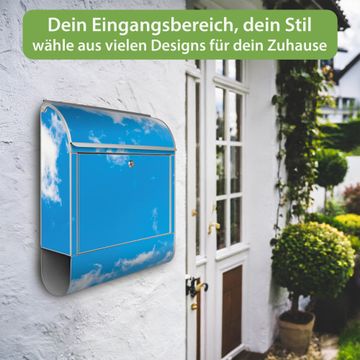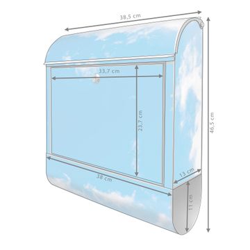 DESIGN: Der Postkasten mit Motiv Motiv Wolken 9 hat ein sehr ansprechendes und ausgefallenes Design, damit entlocken Sie Ihren Nachbarn und dem Postboten ein Lächeln. Heben Sie Sich von der tristen grauen Masse ab, ohne auf Funktionalität zu verzichten. DETAILS: Der Postkasten besteht aus pulverbeschichtetem Stahl. Er ist 38x46x12,5cm groß. Das Motiv besteht aus einer wetter- und UV-resistenten Folie, die mit einem Schutzlaminat überzogen ist, sodass der Briefkasten zusätzlich vor Kratzern geschützt ist. Der Briefkasten wird mit Montagematerial, zusätzlich zwei Schlüssel sowie einer Bohrschablone geliefert. NUTZEN: Sie können diesen Briefkasten sowohl als Wandbriefkasten montieren oder einen passenden Ständer kaufen und als Standbriefkasten einbetonieren. Die Größe bietet genügend Platz für Sendungen aller Art, der Einwurf fasst auch größere A4 Sendungen. BANJADO: Ihr Briefkasten wird in Sachsen in einer kleinen Manufaktur von Hand veredelt. Die Motivfolie ist lösungsmittelfrei und schutzlaminiert für einen langen Halt. Wir legen großen Wert auf die Verbindung von Funktionalität und Design. Sie erhalten Handarbeit aus Sachsen.