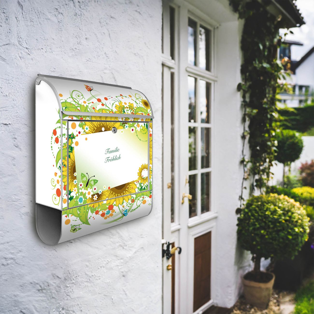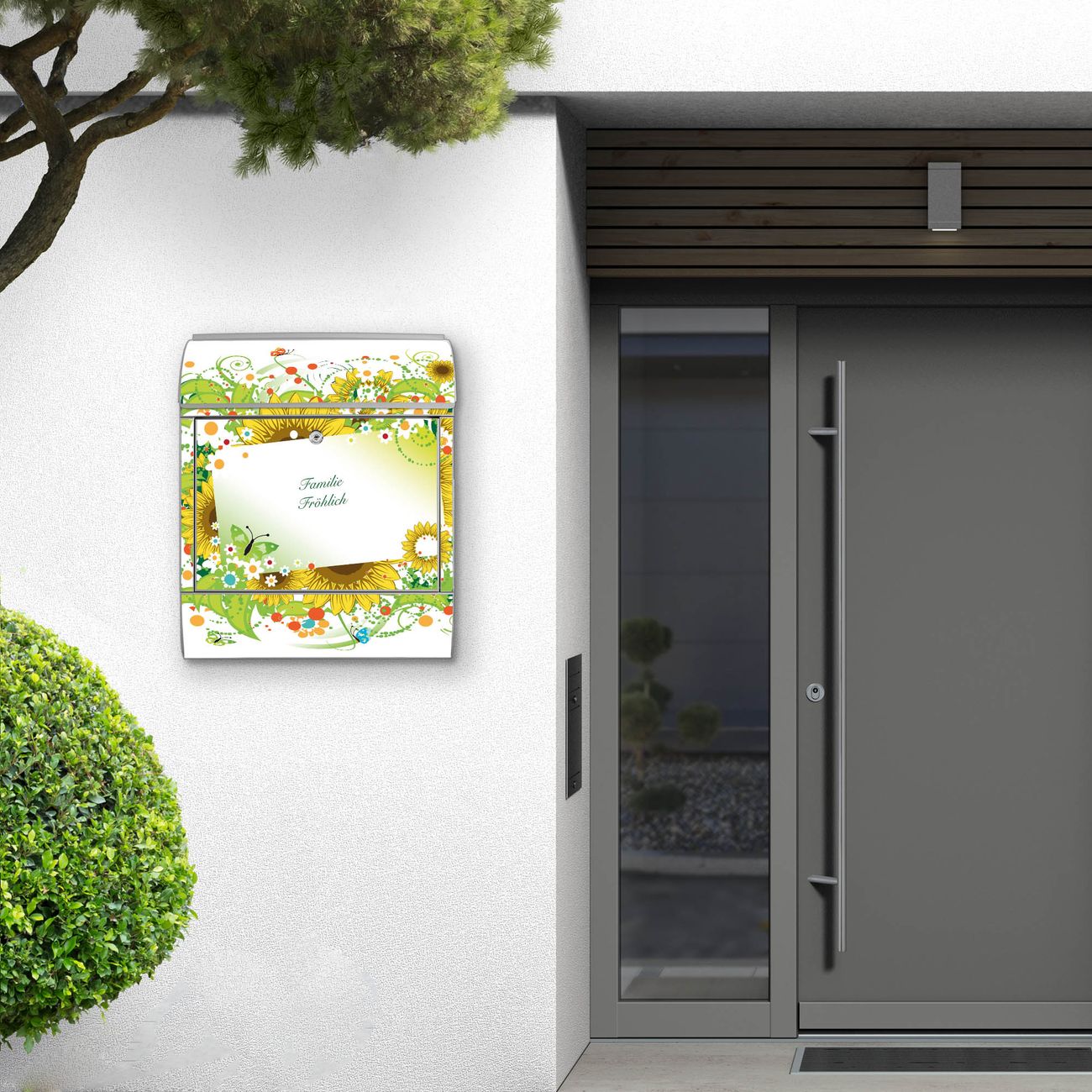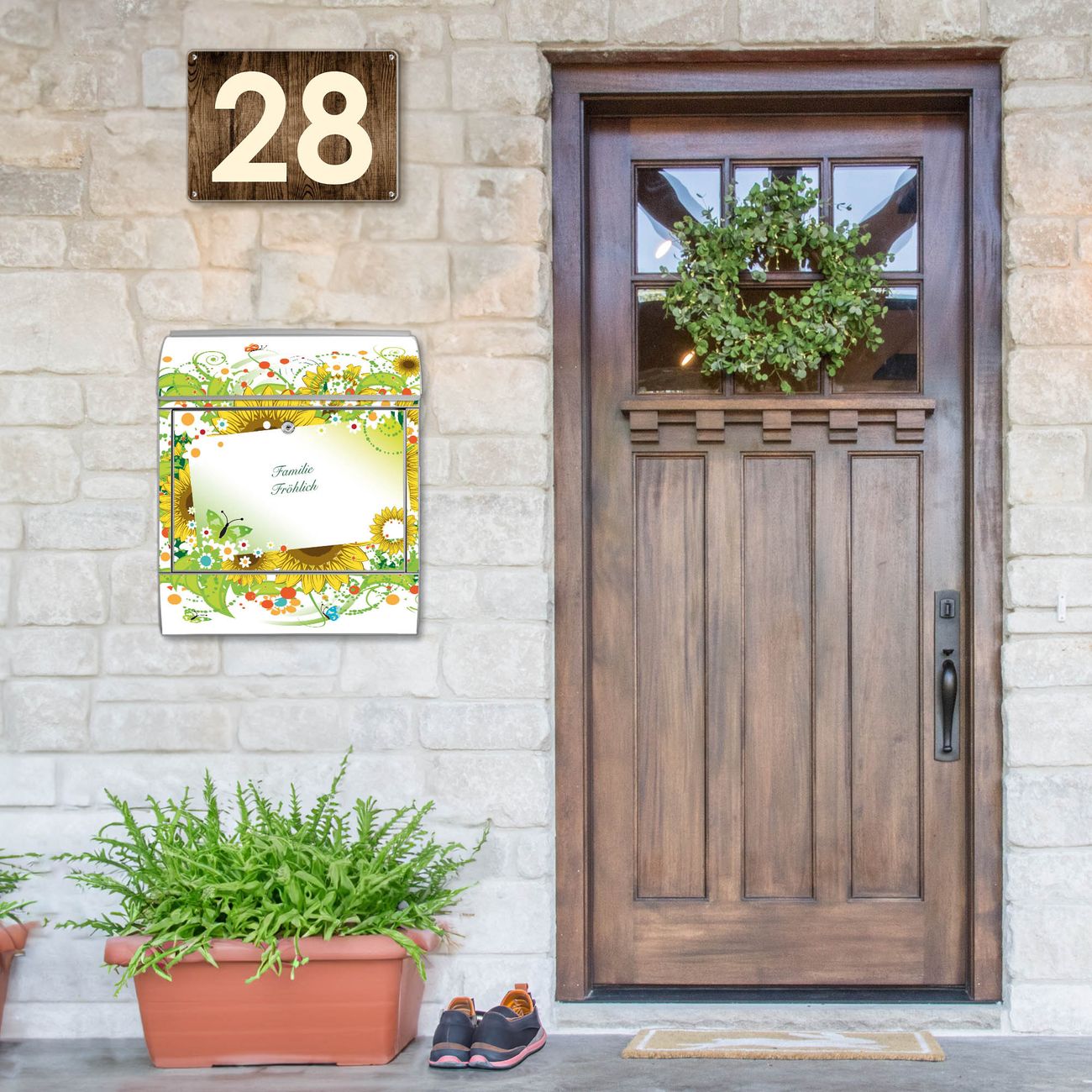 DESIGN: Der Postkasten mit Motiv WT Sommerwiese hat ein sehr ansprechendes und ausgefallenes Design, damit entlocken Sie Ihren Nachbarn und dem Postboten ein Lächeln. Heben Sie Sich von der tristen grauen Masse ab, ohne auf Funktionalität zu verzichten. DETAILS: Der Postkasten besteht aus pulverbeschichtetem Stahl. Er ist 38x46x12,5cm groß. Das Motiv besteht aus einer wetter- und UV-resistenten Folie, die mit einem Schutzlaminat überzogen ist, sodass der Briefkasten zusätzlich vor Kratzern geschützt ist. Der Briefkasten wird mit Montagematerial, zusätzlich zwei Schlüssel sowie einer Bohrschablone geliefert. NUTZEN: Sie können diesen Briefkasten sowohl als Wandbriefkasten montieren oder einen passenden Ständer kaufen und als Standbriefkasten einbetonieren. Die Größe bietet genügend Platz für Sendungen aller Art, der Einwurf fasst auch größere A4 Sendungen. BANJADO: Ihr Briefkasten wird in Sachsen in einer kleinen Manufaktur von Hand veredelt. Die Motivfolie ist lösungsmittelfrei und schutzlaminiert für einen langen Halt. Wir legen großen Wert auf die Verbindung von Funktionalität und Design. Sie erhalten Handarbeit aus Sachsen.