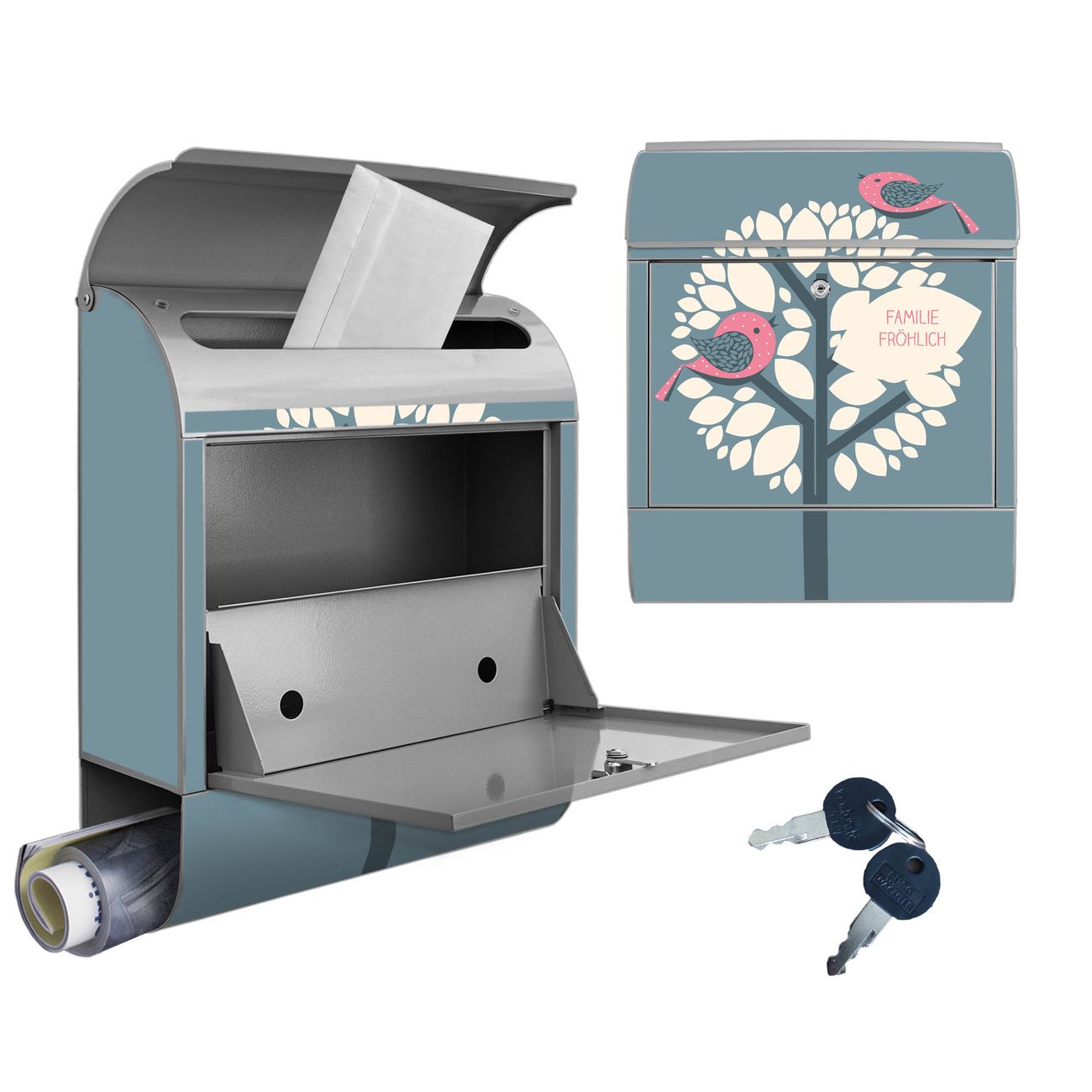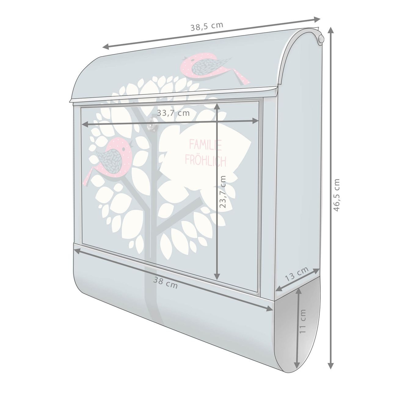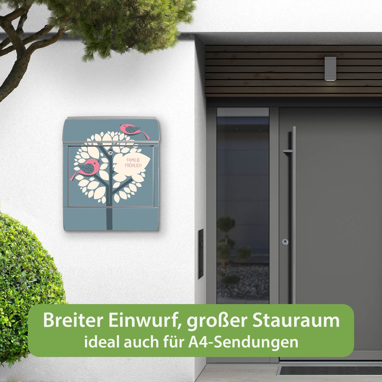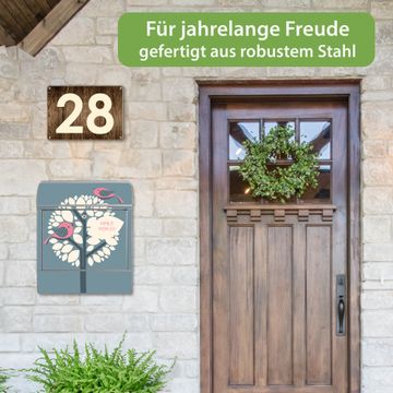 DESIGN: Der Postkasten mit Motiv Motiv Zwei Rosa Vögel hat ein sehr ansprechendes und ausgefallenes Design, damit entlocken Sie Ihren Nachbarn und dem Postboten ein Lächeln. Heben Sie Sich von der tristen grauen Masse ab, ohne auf Funktionalität zu verzichten. DETAILS: Der Postkasten besteht aus pulverbeschichtetem Stahl. Er ist 38x46x12,5cm groß. Das Motiv besteht aus einer wetter- und UV-resistenten Folie, die mit einem Schutzlaminat überzogen ist, sodass der Briefkasten zusätzlich vor Kratzern geschützt ist. Der Briefkasten wird mit Montagematerial, zusätzlich zwei Schlüssel sowie einer Bohrschablone geliefert. NUTZEN: Sie können diesen Briefkasten sowohl als Wandbriefkasten montieren oder einen passenden Ständer kaufen und als Standbriefkasten einbetonieren. Die Größe bietet genügend Platz für Sendungen aller Art, der Einwurf fasst auch größere A4 Sendungen. BANJADO: Ihr Briefkasten wird in Sachsen in einer kleinen Manufaktur von Hand veredelt. Die Motivfolie ist lösungsmittelfrei und schutzlaminiert für einen langen Halt. Wir legen großen Wert auf die Verbindung von Funktionalität und Design. Sie erhalten Handarbeit aus Sachsen.
