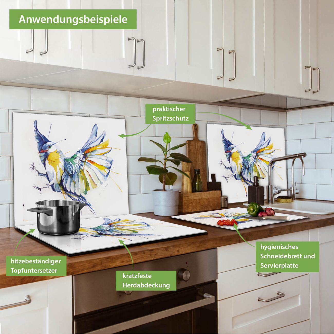 VIELSEITIG: Die Ceranfeldabdeckung ist vielseitig einsetzbar: ob als Spritzschutz hinter dem Herd für Ihre Küche oder als Glas Schneidebrett als hygienische und geruchsneutrale Unterlage. Sie können ebenfalls heiße Töpfe und Pfannen bis 100°C auf der Herdplattenabdeckung abstellen. Sie erhalten ein Multitalent für Ihre Küche. Die banjado Herdabdeckplatte aus Glas mit Motiv Aquarell Vogel verdeckt mit einem schönen Motiv Ihr Ceranfeld bzw. Ihren Induktionsherd. Die Herdabdeckplatte ist vielseitig einsetzbar und passt sich dabei Ihrem Einrichtungsstil an. DESIGN: Die Herdabdeckung Aquarell Vogel besteht aus hochwertigem, gehärtetem Glas mit einem unserer zahlreichen Motive. Sie haben die Wahl zwischen verschiedenen Maßen von einteiligen, zweiteiligen und einer dreiteiligen Herdabdeckung. Wählen Sie was zu Ihrer Einrichtung passt! DETAILS: Die Herdabdeckplatte ist vielseitig einsetzbar. Die Ecken sind für mehr Sicherheit dezent abgerundet, das Glas ist gehärtet. Sie erhalten separate Gummi Abstandshalter, damit Ihre Abdeckung rutschfest auf dem Herd steht. Diese können Sie frei positionieren, sodass die Herdabdeckung perfekt auf Ihrem Ceranfeld sitzt. BANJADO: Wir sind ein kleines Team aus dem Herzen von Sachsen und fertigen jeden Artikel nach Bestellung eigens für Sie an. Sie erhalten also keine preiswerte Importware, sondern Handarbeit. Auf Wunsch sind auch andere Farben und Größen möglich, kontakierten Sie uns gern.