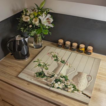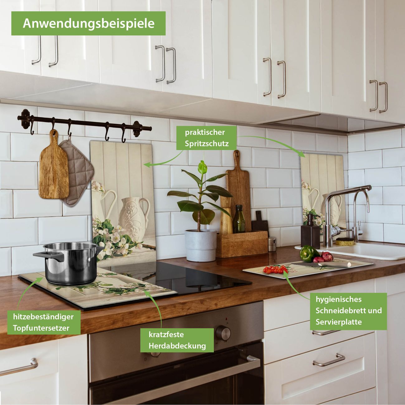 VIELSEITIG: Die Ceranfeldabdeckung ist vielseitig einsetzbar: ob als Spritzschutz hinter dem Herd für Ihre Küche oder als Glas Schneidebrett als hygienische und geruchsneutrale Unterlage. Sie können ebenfalls heiße Töpfe und Pfannen bis 100°C auf der Herdplattenabdeckung abstellen. Sie erhalten ein Multitalent für Ihre Küche. Die banjado Herdabdeckplatte aus Glas mit Motiv Kirschzweige verdeckt mit einem schönen Motiv Ihr Ceranfeld bzw. Ihren Induktionsherd. Die Herdabdeckplatte ist vielseitig einsetzbar und passt sich dabei Ihrem Einrichtungsstil an. DESIGN: Die Herdabdeckung Kirschzweige besteht aus hochwertigem, gehärtetem Glas mit einem unserer zahlreichen Motive. Sie haben die Wahl zwischen verschiedenen Maßen von einteiligen, zweiteiligen und einer dreiteiligen Herdabdeckung. Wählen Sie was zu Ihrer Einrichtung passt! DETAILS: Die Herdabdeckplatte ist vielseitig einsetzbar. Die Ecken sind für mehr Sicherheit dezent abgerundet, das Glas ist gehärtet. Sie erhalten separate Gummi Abstandshalter, damit Ihre Abdeckung rutschfest auf dem Herd steht. Diese können Sie frei positionieren, sodass die Herdabdeckung perfekt auf Ihrem Ceranfeld sitzt. BANJADO: Wir sind ein kleines Team aus dem Herzen von Sachsen und fertigen jeden Artikel nach Bestellung eigens für Sie an. Sie erhalten also keine preiswerte Importware, sondern Handarbeit. Auf Wunsch sind auch andere Farben und Größen möglich, kontakierten Sie uns gern.